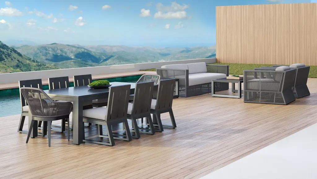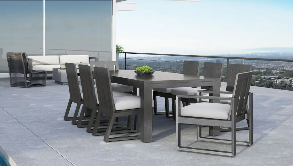 The Laken Armless Dining Chair blends modern and industrial sensibility into one striking design, featuring a vertical slat back and linear frame crafted in powder-coated aluminum. It boasts a fully welded, scratch-resistant frame and weather-resistant, high-resiliency foam cushions. The chair is stocked in premium fabric and includes adjustable non-marring feet. With commercial quality construction,