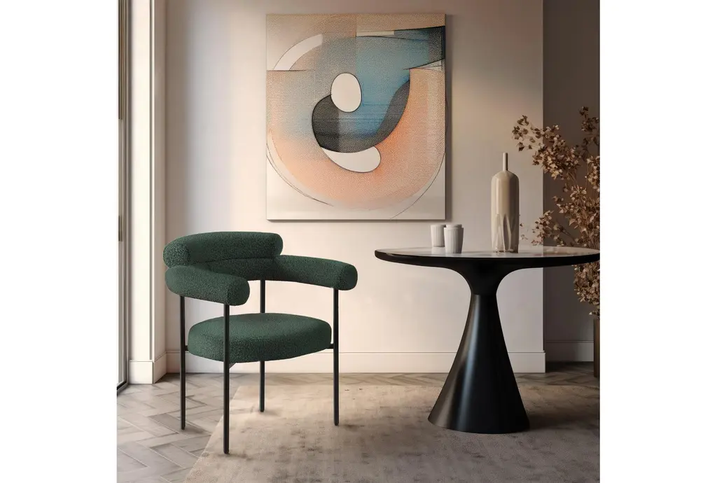 Enhance your dining experience with the Laki Green Boucle Upholstered Dining Arm Chair. This modern set of two chairs is designed to bring both comfort and style to your dining room or kitchen. The green boucle fabric provides a soft and inviting texture, while the black leg frame adds a sleek, contemporary touch.