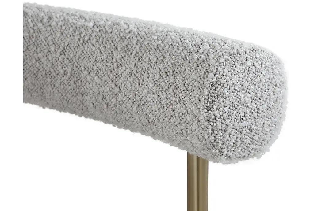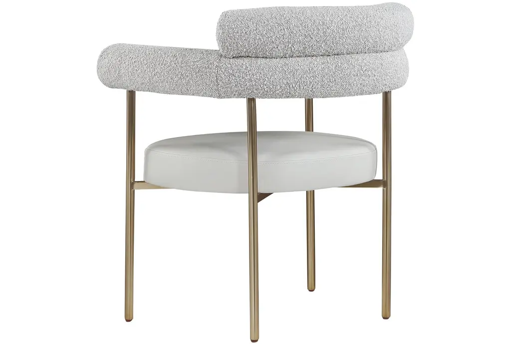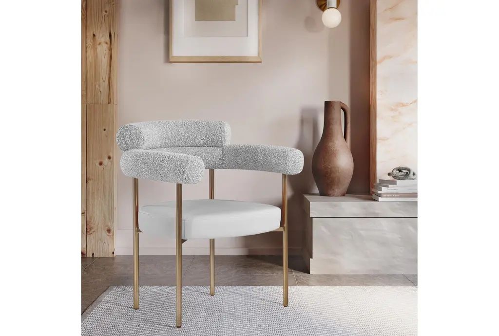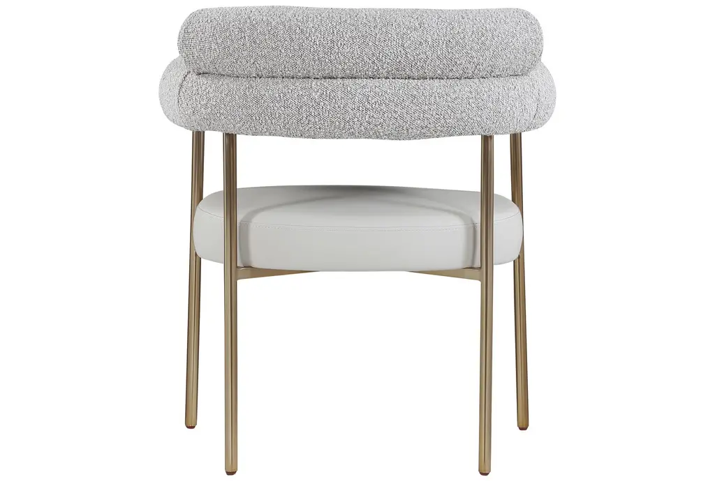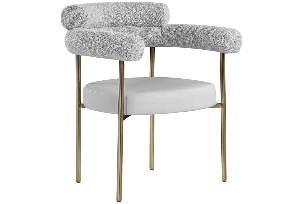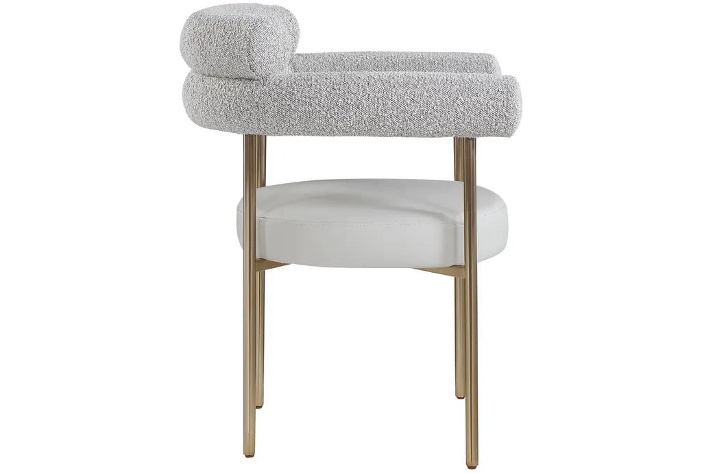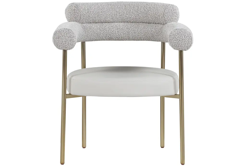 The Laki Taupe Vegan Leather Dining Armchair with Brass Leg Frame Set of 2 brings modern sophistication to your dining area. These chairs offer a comfortable seating experience with their soft boucle fabric and supportive arms. The brass leg frame adds a touch of contemporary flair to any dining room or kitchen.