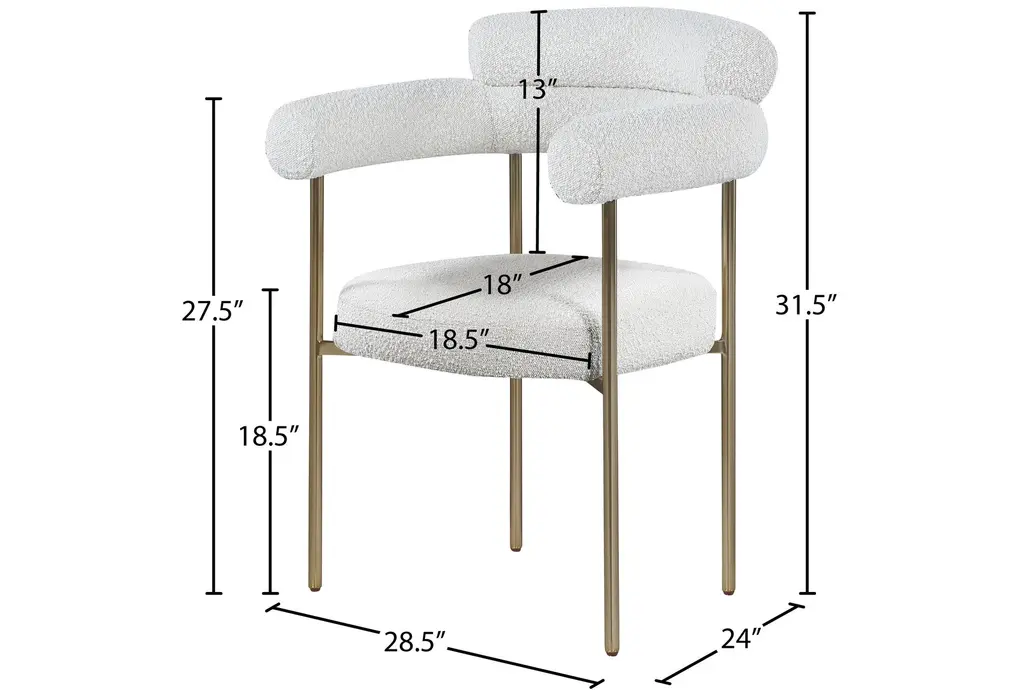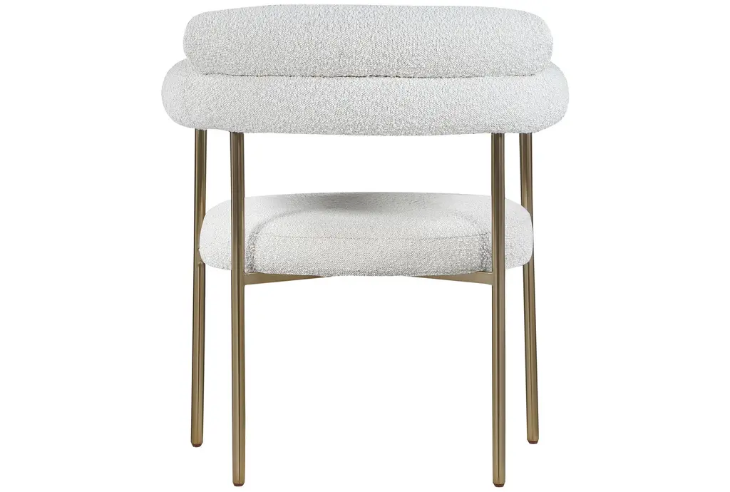Enhance your dining experience with the Laki White Boucle Upholstered Dining Arm Chair Set. These chairs feature a modern design with a rich cream boucle fabric that adds a touch of elegance to any dining space. The brushed brass finish on the iron metal frame provides a contemporary and stylish look.