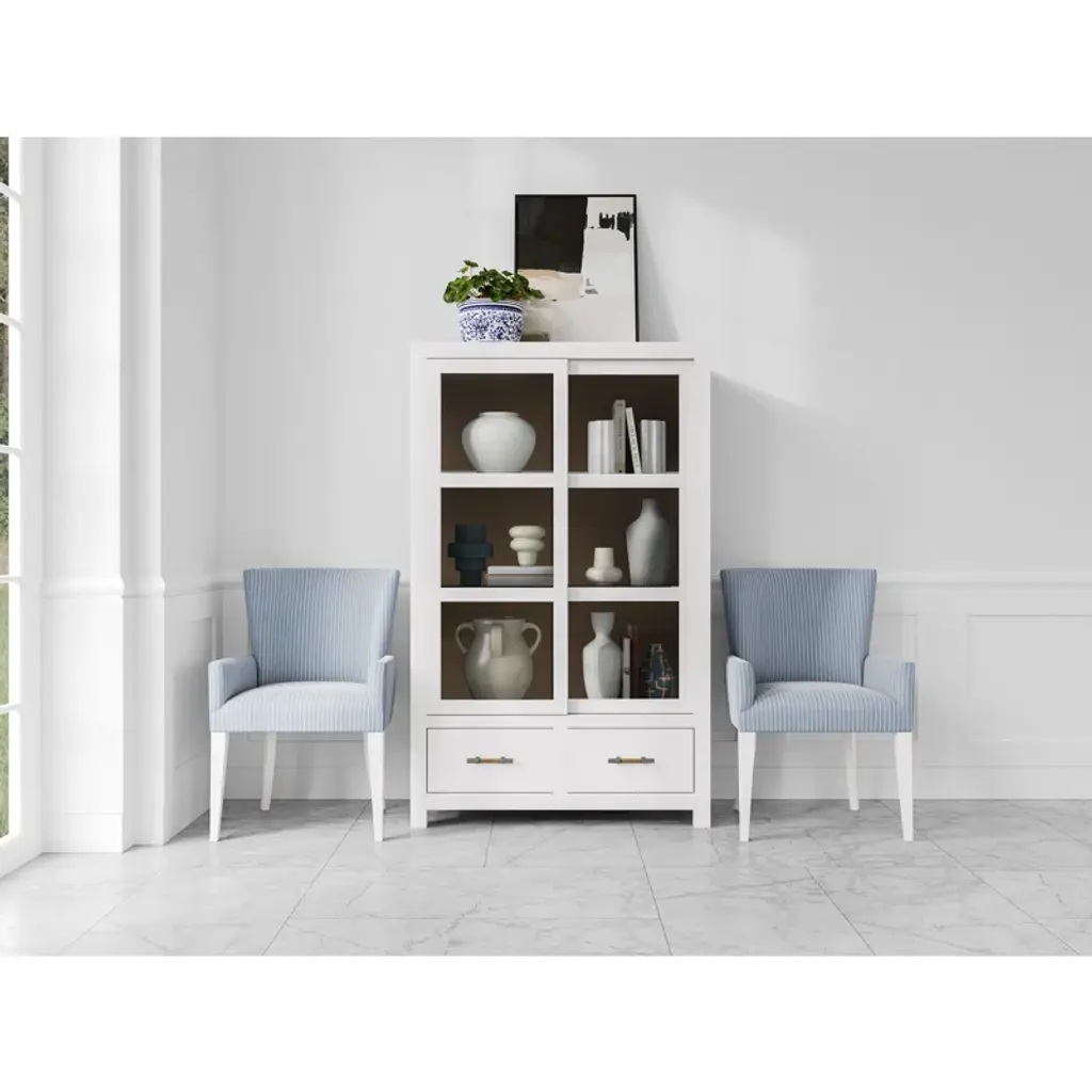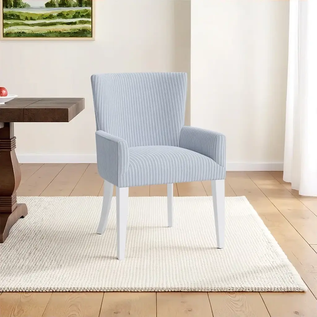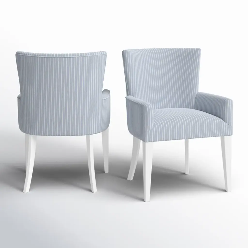 This set of two armchair dining chairs brings a coastal breeze to your dining room or kitchen. Crafted from kiln-dried solid wood, these chairs feature a classic silhouette with a solid back and gently curved arms, offering a comfortable spot for family meals or gatherings. The tufted blue and white acrylic upholstery adds a splash of color, while the white rubberwood legs lend a crisp, clean finish. Plastic glides protect your floors, making it easy to rearrange your space. These chairs are a delightful addition to any dining area, with a nod to timeless style and casual elegance.