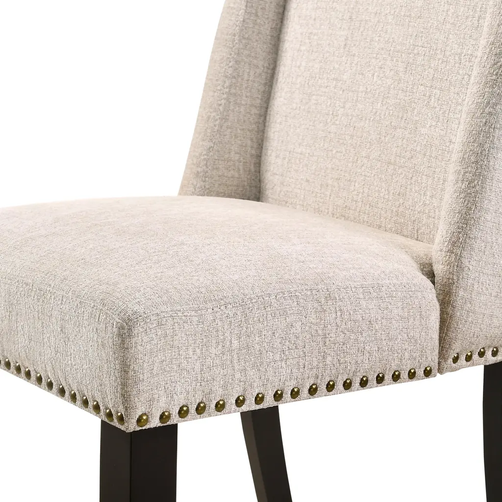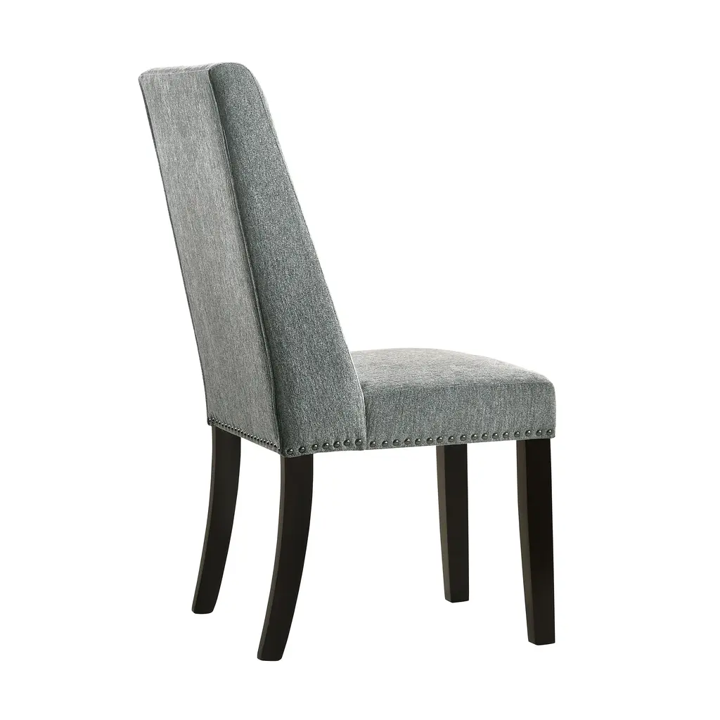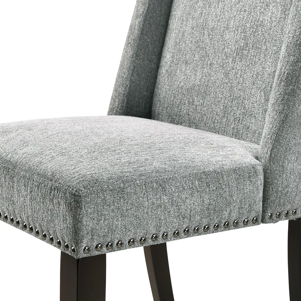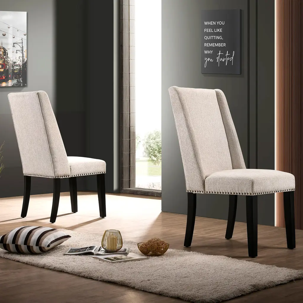 Our set of 2 Lana Upholstered Dining Chairs are a comfortable and chic option for your dining room and to add flexible seating to your home. Each chair features an upholstered seat in durable, attractive polyester fabric with a trim of nail heads around its base paired with a dark, espresso-stained wooden legs. Their luxurious palette and finish makes them easy to mix in with your existing furniture and style. Make sure your family and friends feel at home while you share a meal, a drink, or coffee. Use them in your home office, living room, around a dining table or breakfast space for ultra-comfortable seating for your family and friends. Polyester upholstery is easy to spot clean as needed. Always test any cleaning agent on an area that won't be seen to ensure it's safe to use on the fabric more broadly.