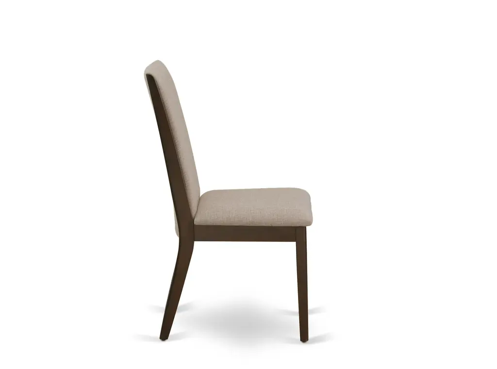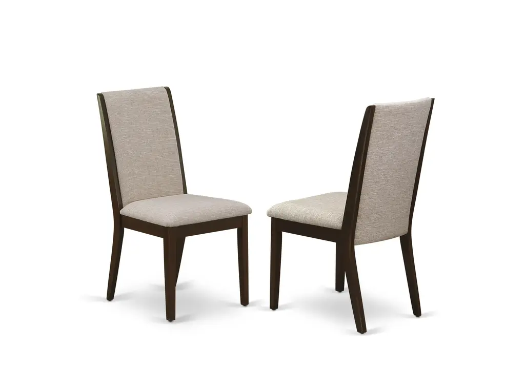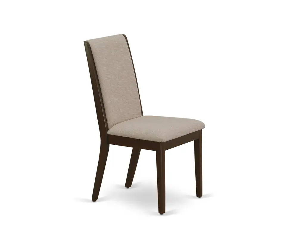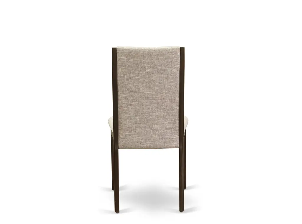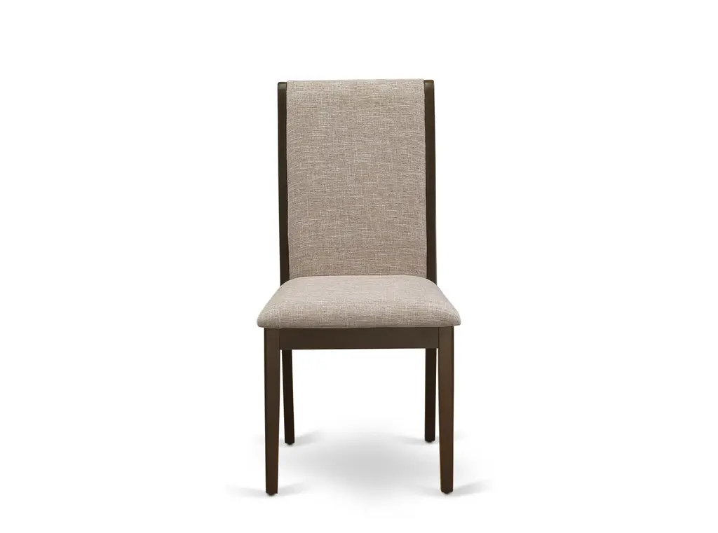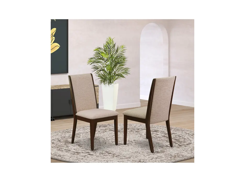 East West Furniture set of 2 innovative padded parson chairs add a magnificent look to your dining room, living area, kitchen area with our high attractive back dining Chairs. Our parson dining chairs will provide a touch of elegance into your home with an amazing and innovative appearance that simply fuses into any environment. Our dining room chairs structure is produced from sturdy Asian wood, known as Rubber Wood, which is rugged enough to withstand years of use. It also has an ergonomic style, which is very cozy. These dining chairs features a compact design great for small spaces. Comfortable foam cushioned high modern back will offer you ideal support and comfort. Favorable Light Tan Color Linen Fabric with Mahogany Finish Legs of these wonderful parson chairs will enhance the elegance of any dining area. You will certainly enjoy this wonderful parsons chairs set. Easily assemble the dining room chairs with a simple tool. No additional tools are required. Easy-to-follow instructions, tools, and hardware included. With the help of a damp cloth, you will clean your dusty quickly. Buy our products in total confidence, because your satisfaction is our #1 priority. Feel free to contact us; we are always here for you.East West Furniture LAP3T04 Dining Chairs - Light Tan Color Linen Fabric Kitchen Chairs Seat with Mahogany Rubber Wood Legs - Set of 2The dining room chairs permits you to add a touch of style into your dining room. Our kitchen chairs are comfortable in any living room as well as in kitchens. The high stylish back design chairs will enhance the elegance of any dining table. It is an excellent addition to your dining room.It Rubber wood frame of padded parson chairs gives the toughness to hold up to 300 lbs. The seat of the upholstered dining chairs is produced with linen fabric in high elasticity and density. A classy kitchen chairs that act as a central point to your home decor.Features:Fabric: Linen FabricCushion Material: FoamFabric Color: Light TanLegs Color: MahoganyDimensions: Length 24; Width 20; Height 39Includes: A wonderful stylish set of 2 kitchen chairs