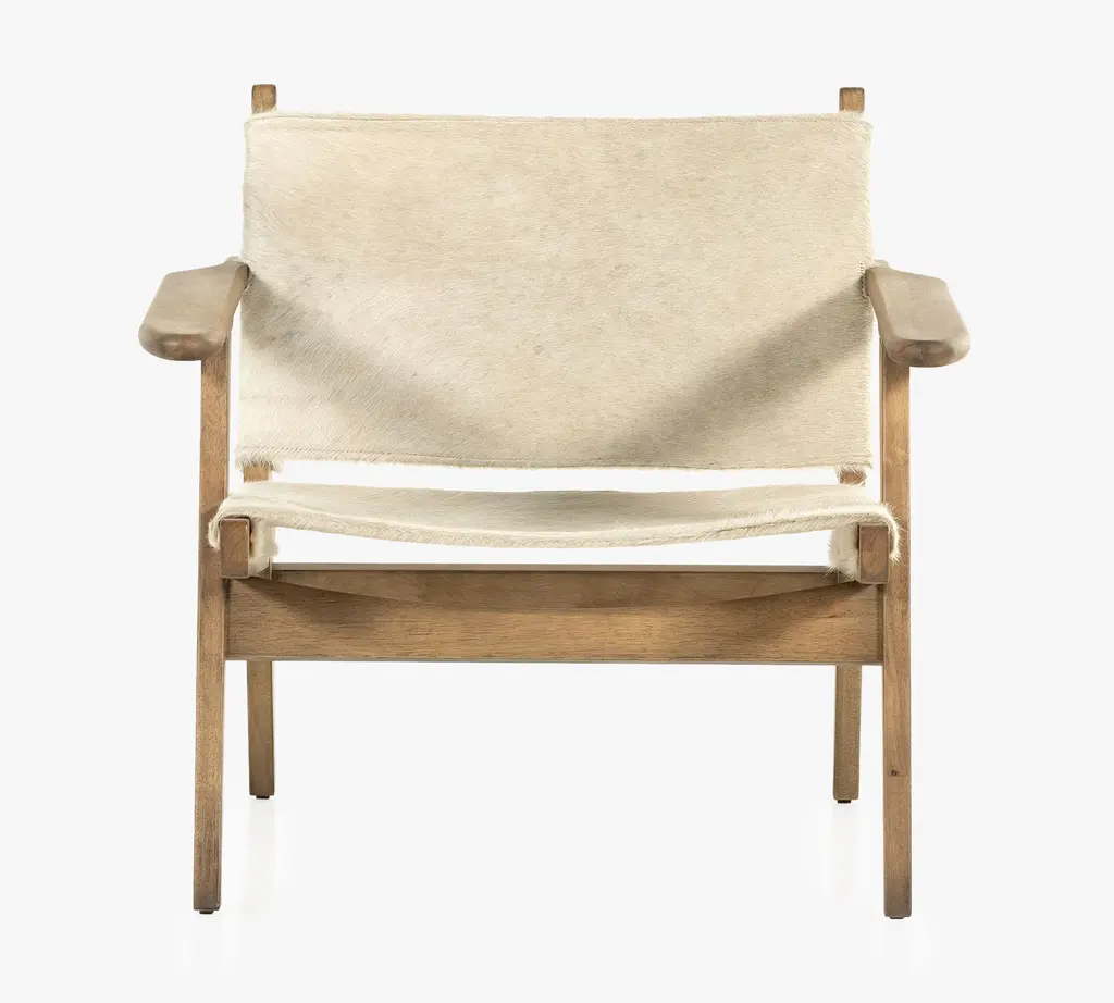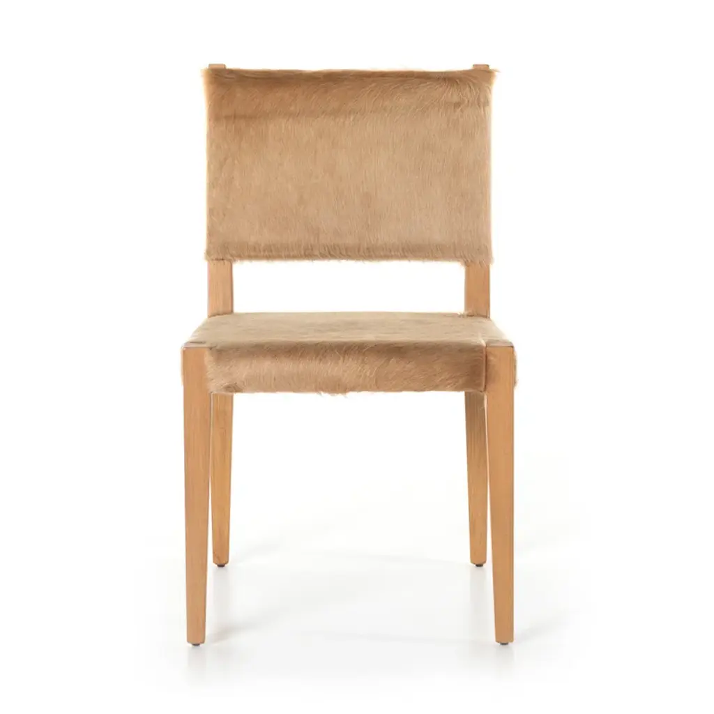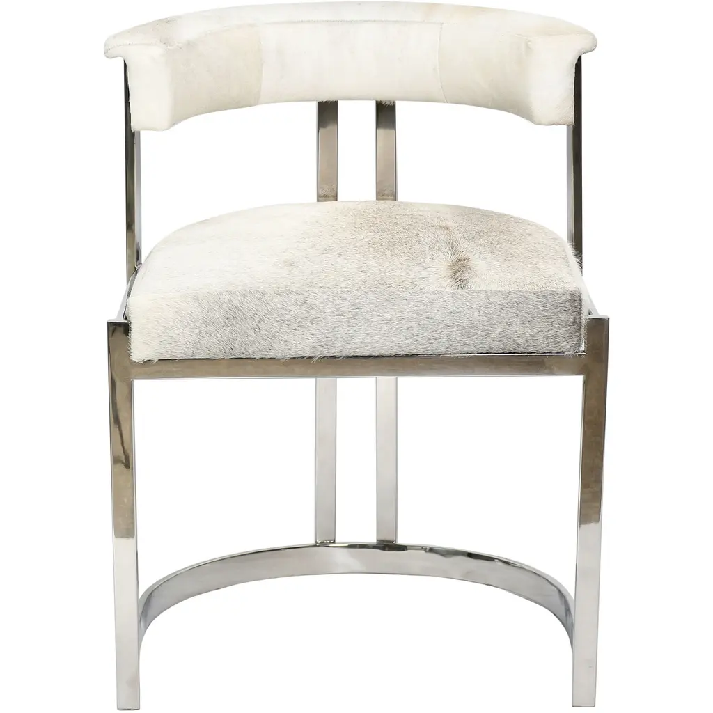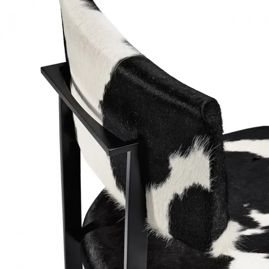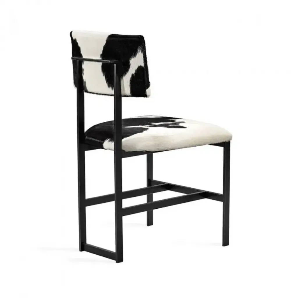 Thanks to a bold geometric stainless steel base in a matte black finish and a black and white hide seat, the Landon II Dining Chair makes a fabulous statement. Hide is a natural material. Variations in coloration are to be expected and add to the uniqueness and charm of each piece.