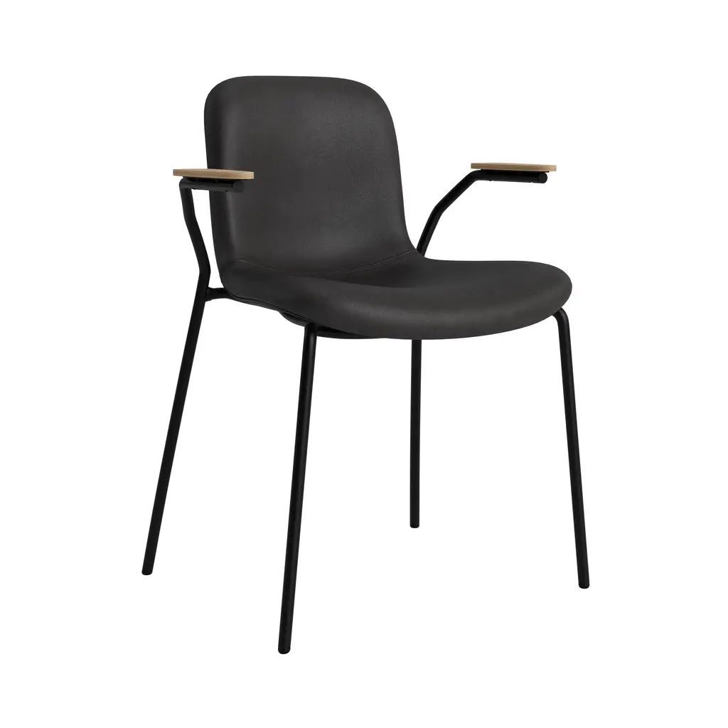The Langue Chair stands out with its distinctively curved seat, modeled after the shape of a tongue. It emphasizes a flowing, organic silhouette that is designed to follow the bodys shape. This organic shape starts wide at the front, offering ample seating space, and tapers as it moves toward the back, almost hugging the body for support. The back of the chair curves gently to cradle the spine. Available with a steel base in black and armrests in 4 oak finishes. The soft upholstery version includes a foam layer, making it ideal for long dining or work sessions. Upholstered in a range of high performance fabrics for even more added comfort.
