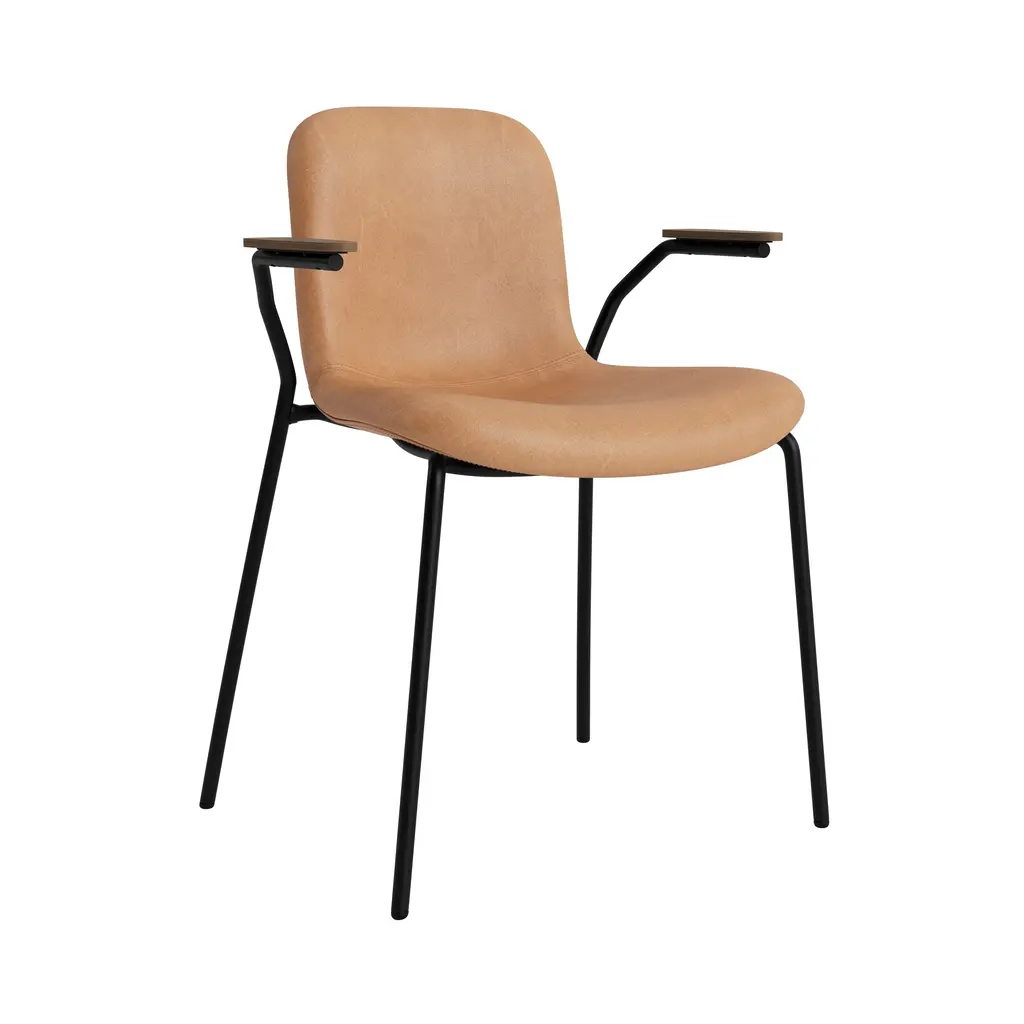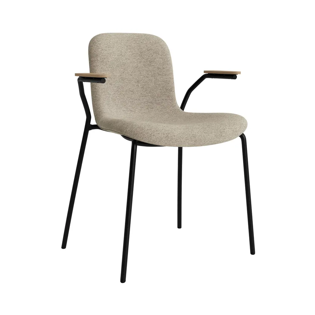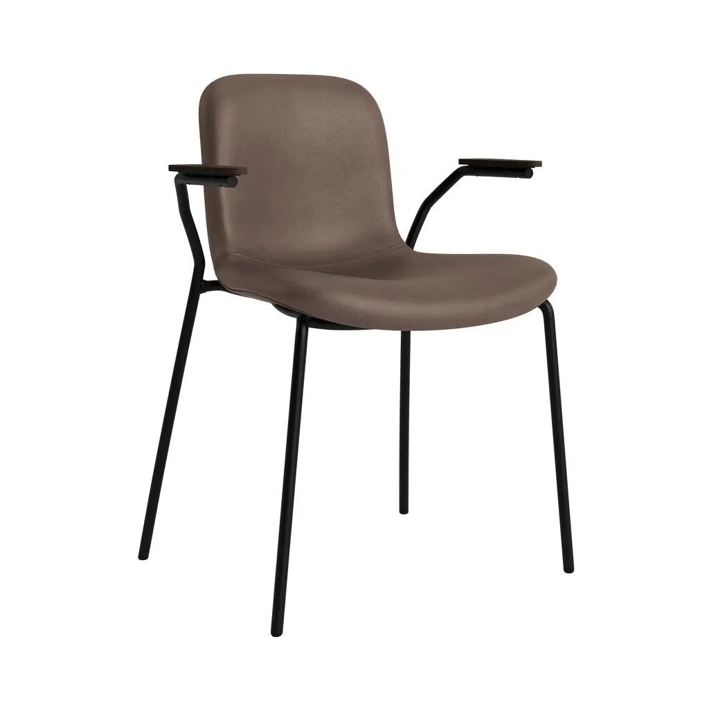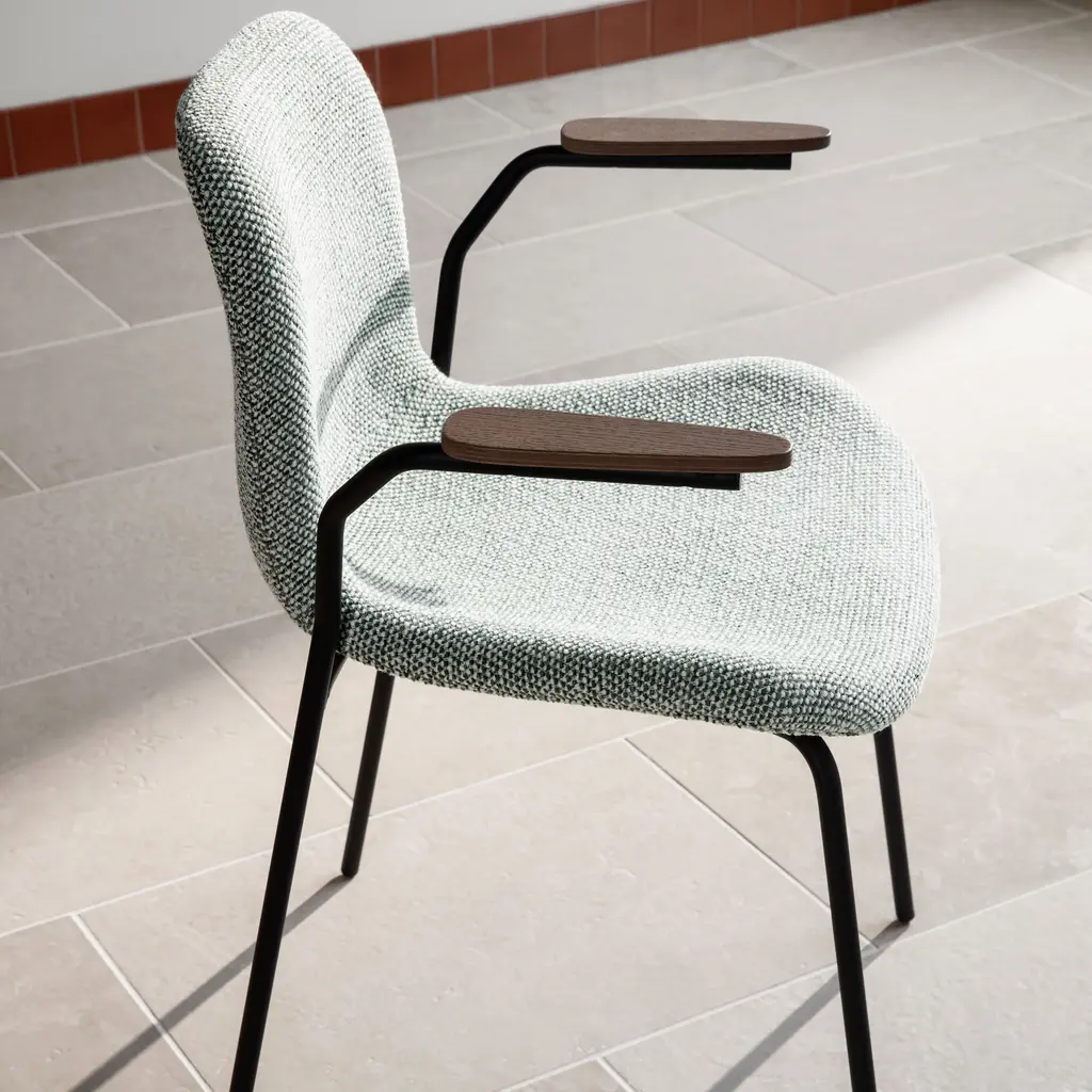 The Langue Chair stands out with its distinctively curved seat, modeled after the shape of a tongue. It emphasizes a flowing, organic silhouette that is designed to follow the bodys shape. This organic shape starts wide at the front, offering ample seating space, and tapers as it moves toward the back, almost hugging the body for support. The back of the chair curves gently to cradle the spine. Available with a steel base in black and armrests in 4 oak finishes. The soft upholstery version includes a foam layer, making it ideal for long dining or work sessions. Upholstered in a range of high performance fabrics for even more added comfort.