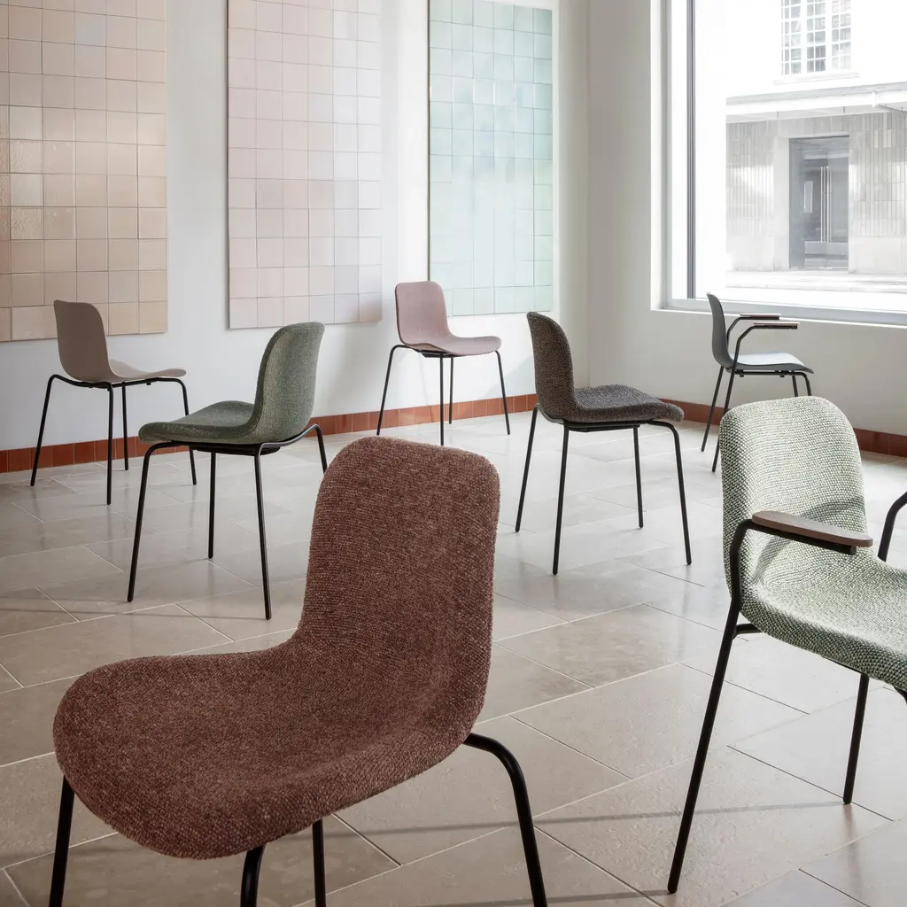 The Langue Chair stands out with its distinctively curved seat, modeled after the shape of a tongue. It emphasizes a flowing, organic silhouette that is designed to follow the bodys shape. This organic shape starts wide at the front, offering ample seating space, and tapers as it moves toward the back, almost hugging the body for support. The back of the chair curves gently to cradle the spine. Available with a steel base in black and armrests in 4 oak finishes. The soft upholstery version includes a foam layer, making it ideal for long dining or work sessions. Upholstered in a range of high performance fabrics for even more added comfort.