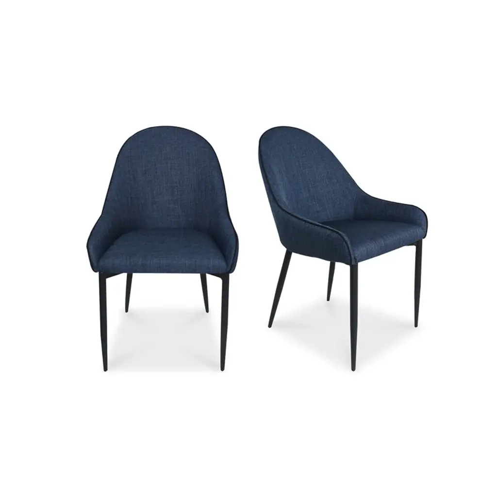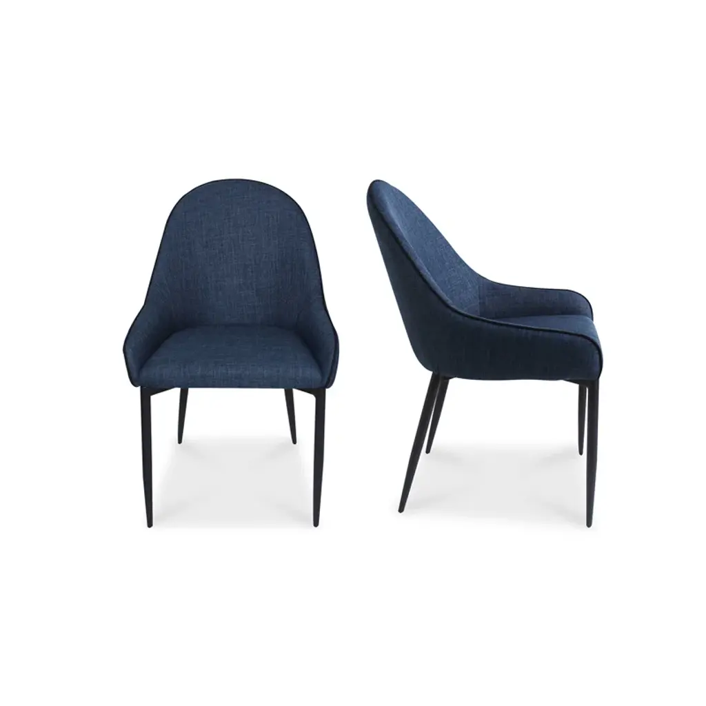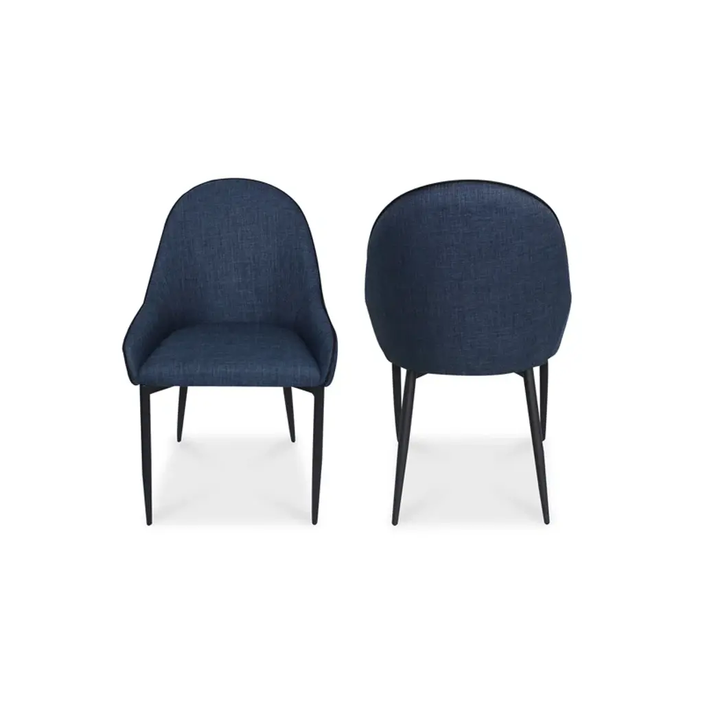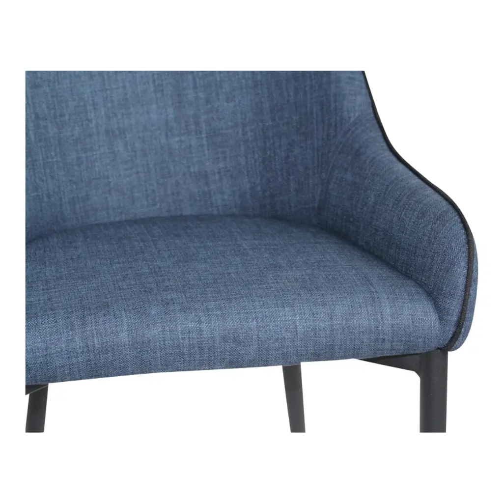 This is a stylish Sugarcreek upholstered dining chair in blue with form-fitted upholstery and low arms. The black metal legs provide a classic black-and-blue combo.