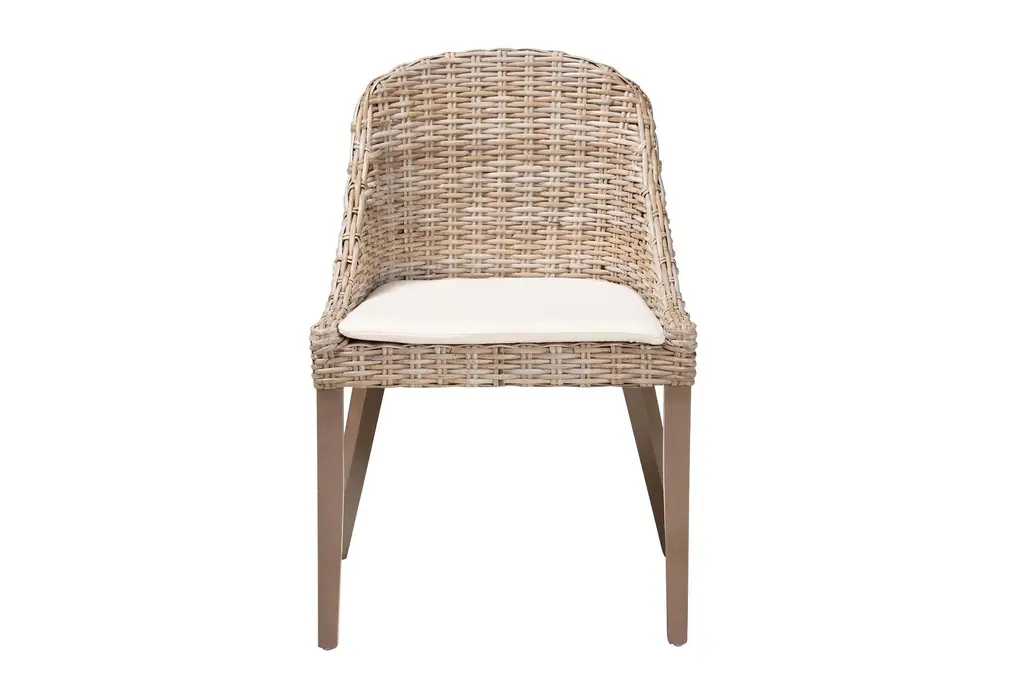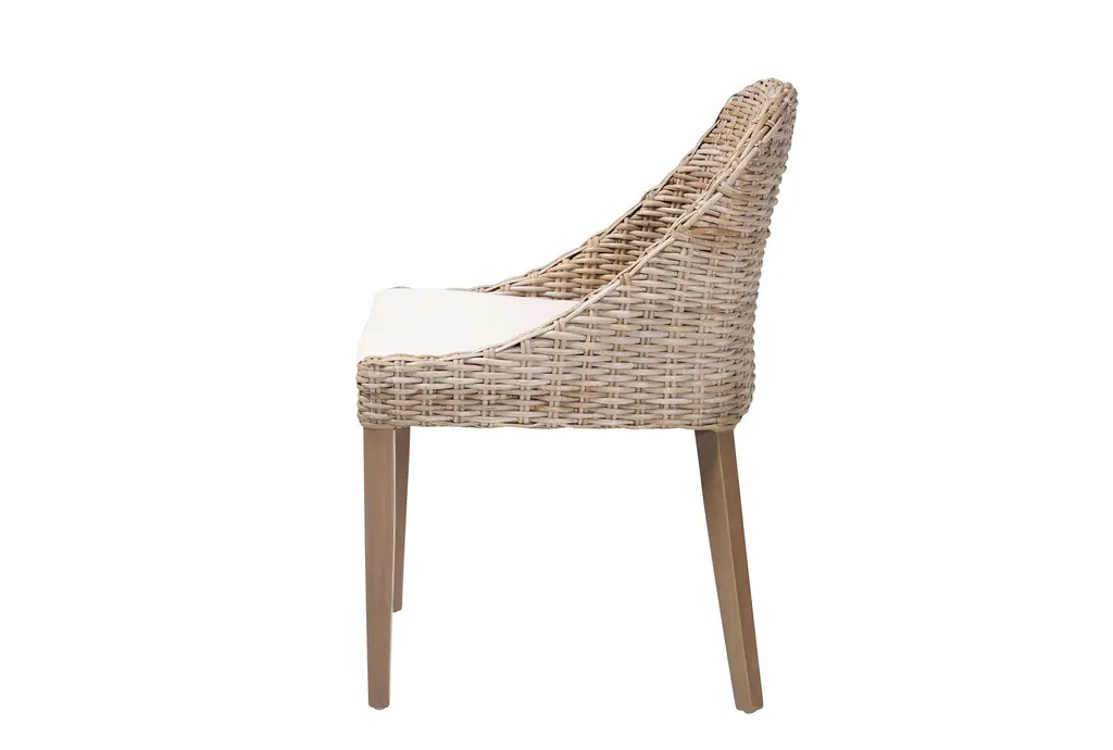 The Lara Bohemian Grey Kubu Rattan & Mahogany Wood Dining Chair is a perfect blend of modern and boho styles, adding a touch of elegance to any dining space. Crafted from natural Kubu rattan and mahogany wood, this chair features a wraparound backrest for added comfort and support. The removable cushion is padded with foam and upholstered in 100% polyester fabric, ensuring a comfortable seating experience.