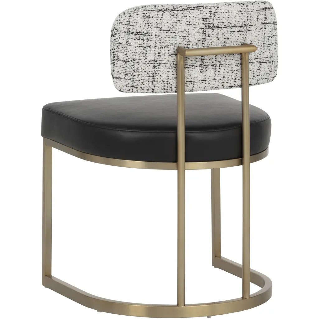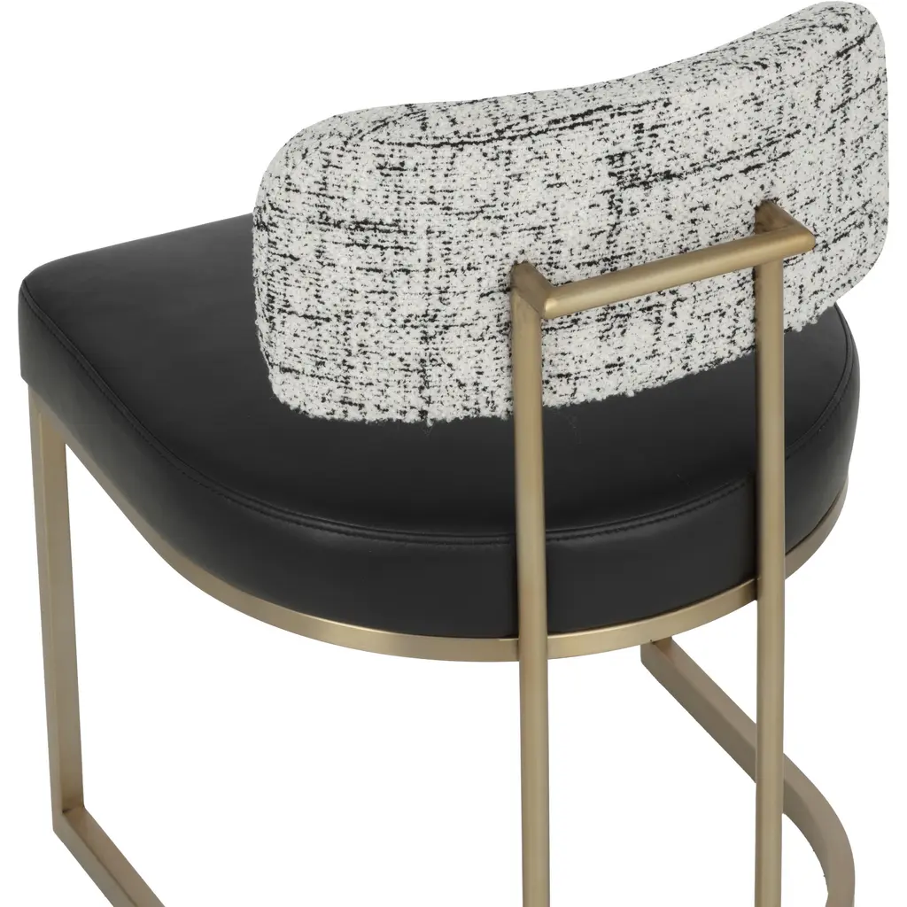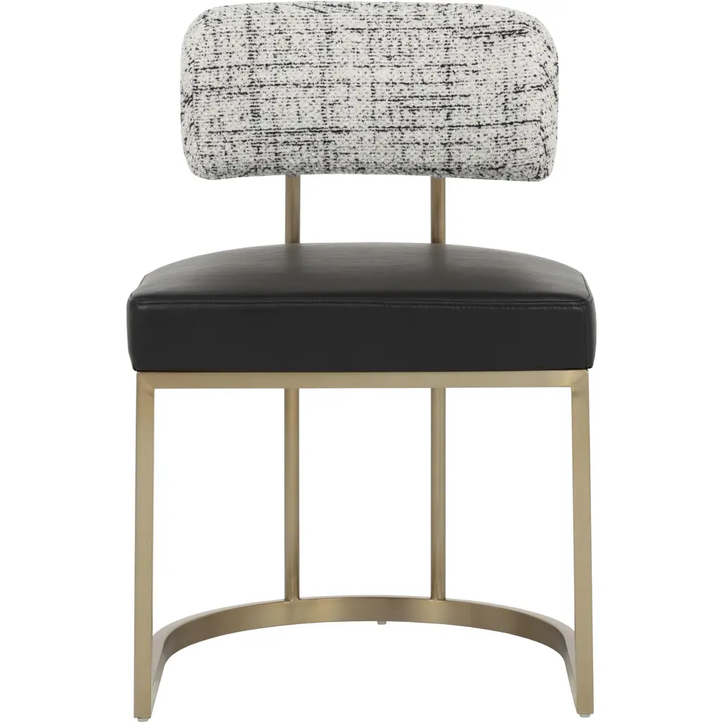 The Larissa Dining Chair brings together a beautiful display of mixed materials. A low seatback upholstered in rhea light barley fabric contrasts the warm tones of the seat upholstered in napa cognac faux leather for an elevated aesthetic. The antique brass stainless steel frame features a handle on the back for a functional and stylish addition.
