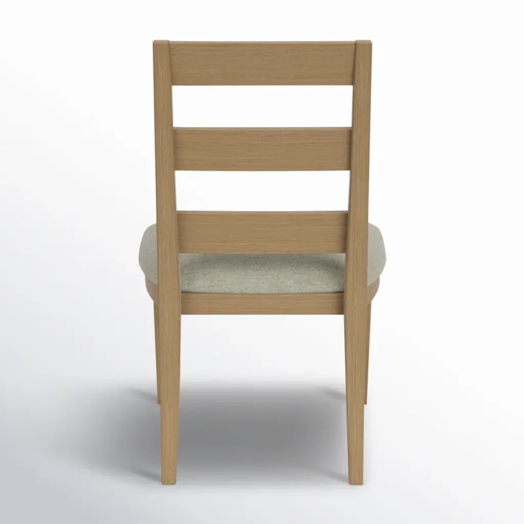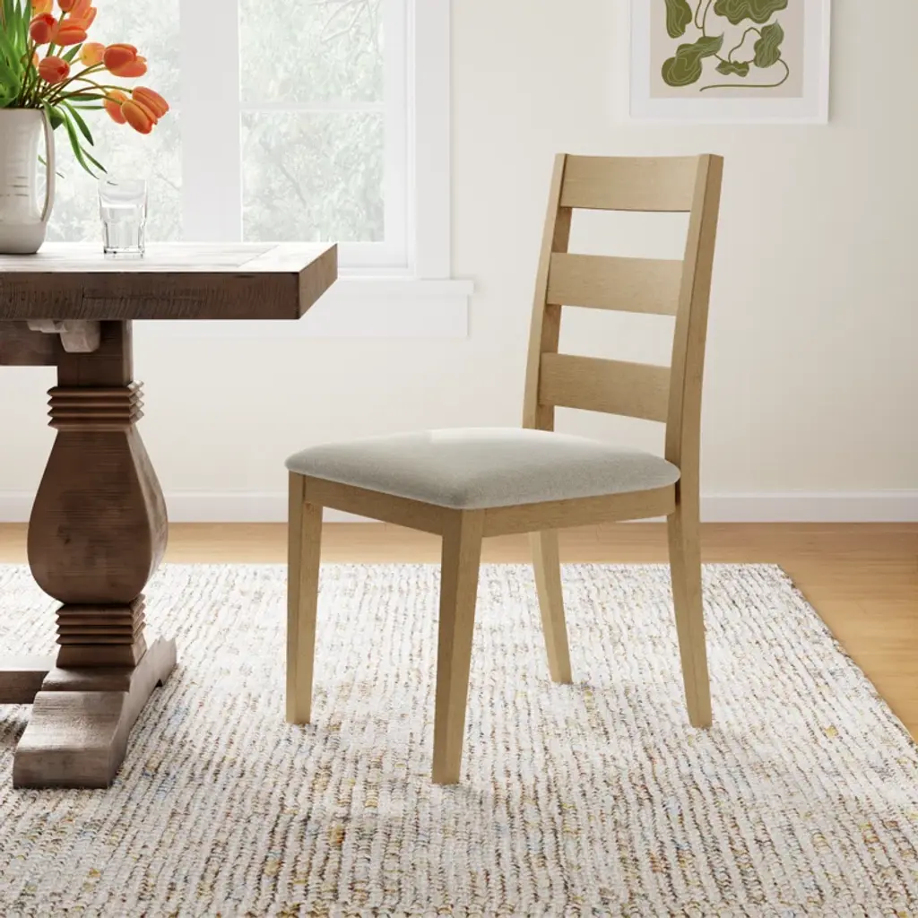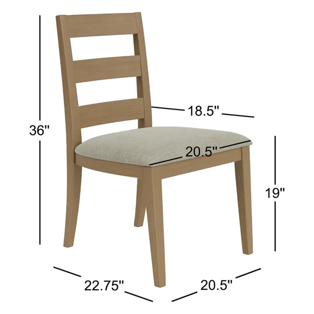This pair of side chairs has a classic silhouette and is the perfect way to complete your table for two. Each is made from kiln-dried solid wood and features a timeless ladder-back design and a pale oak finish that highlights the natural wood grain. Foam-filled cushions are wrapped in a polyester blend upholstery (spot clean as needed), and plastic glides on the feet protect your floors from scratches and scuffs.