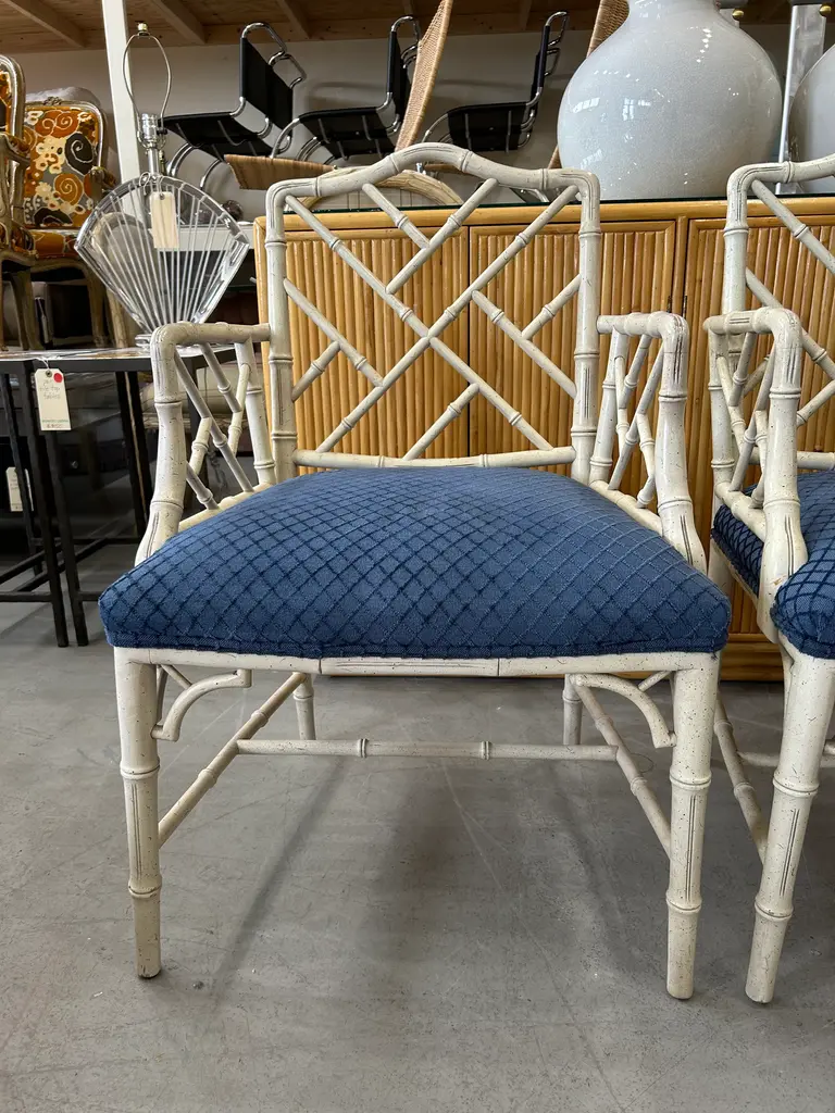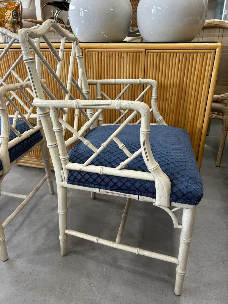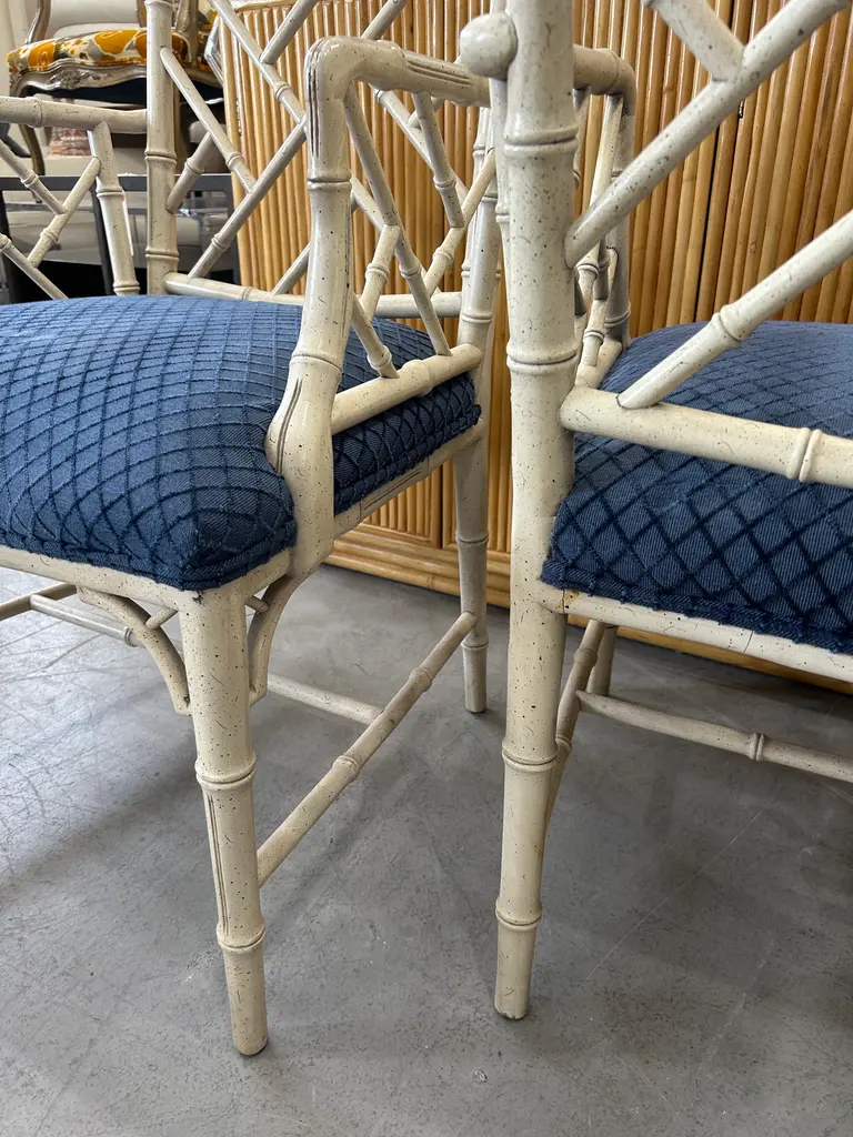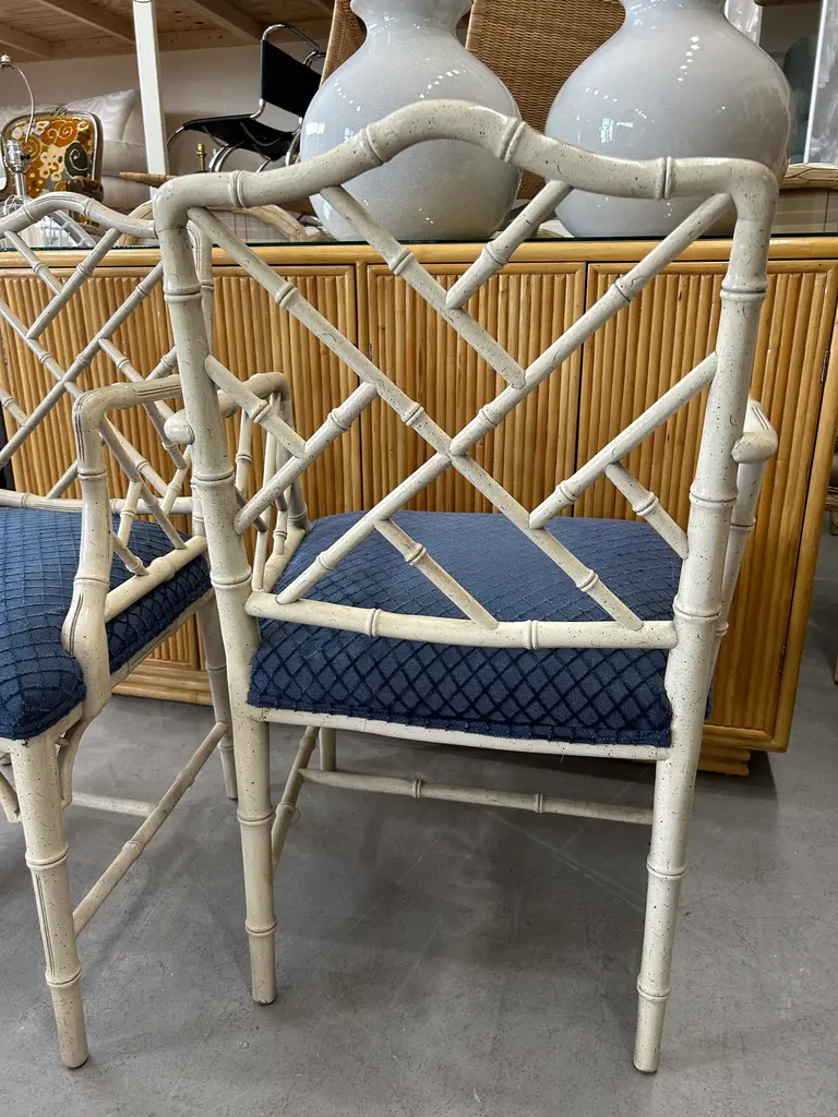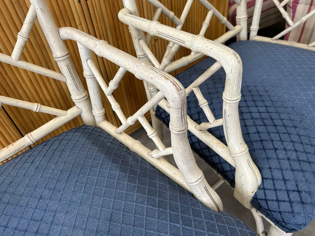 Vintage 20th Century pair of faux bamboo Chinese Chippendale armchairs to float in your space or add to the ends of your dining table. Classic pair.