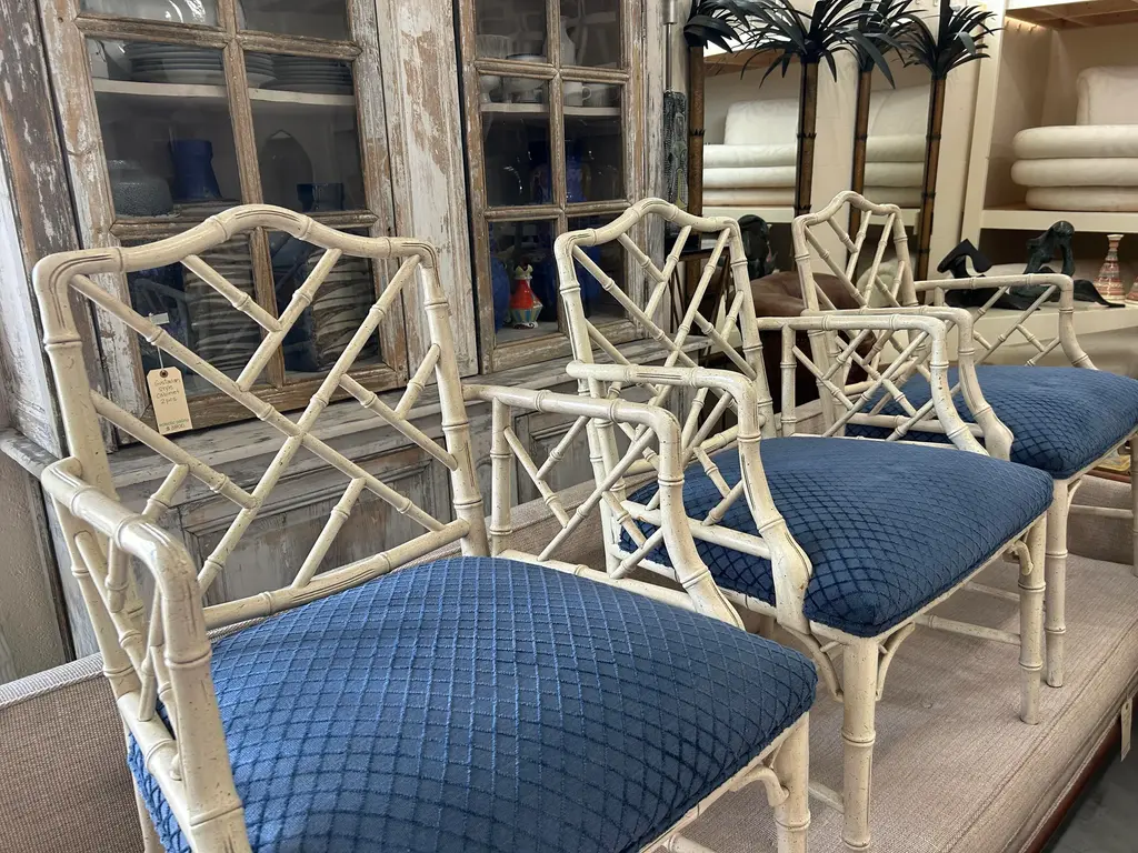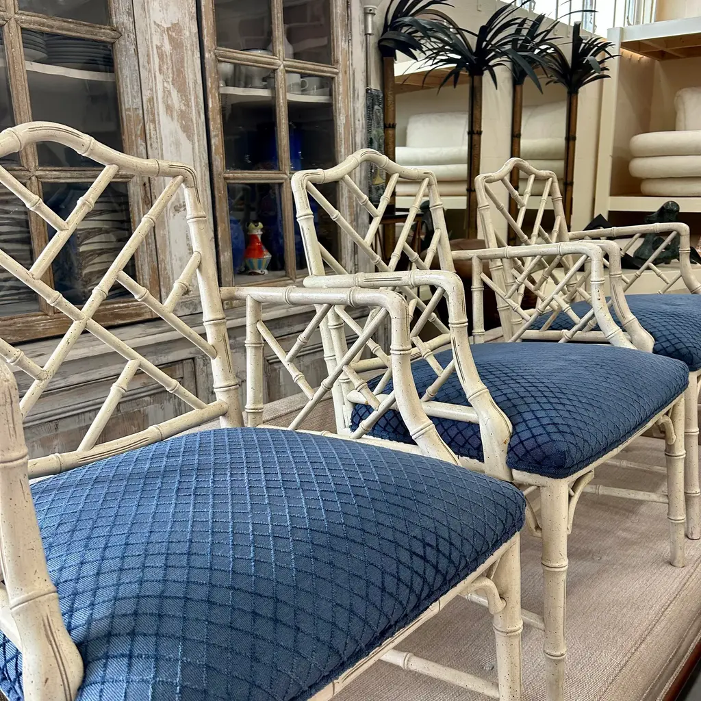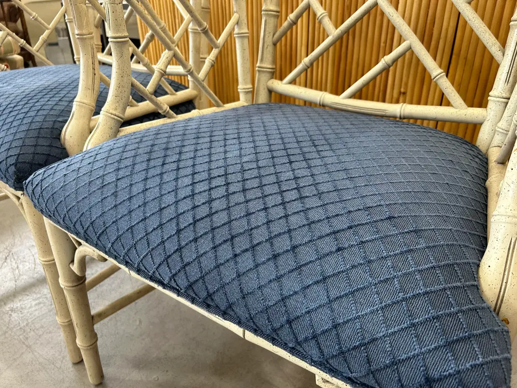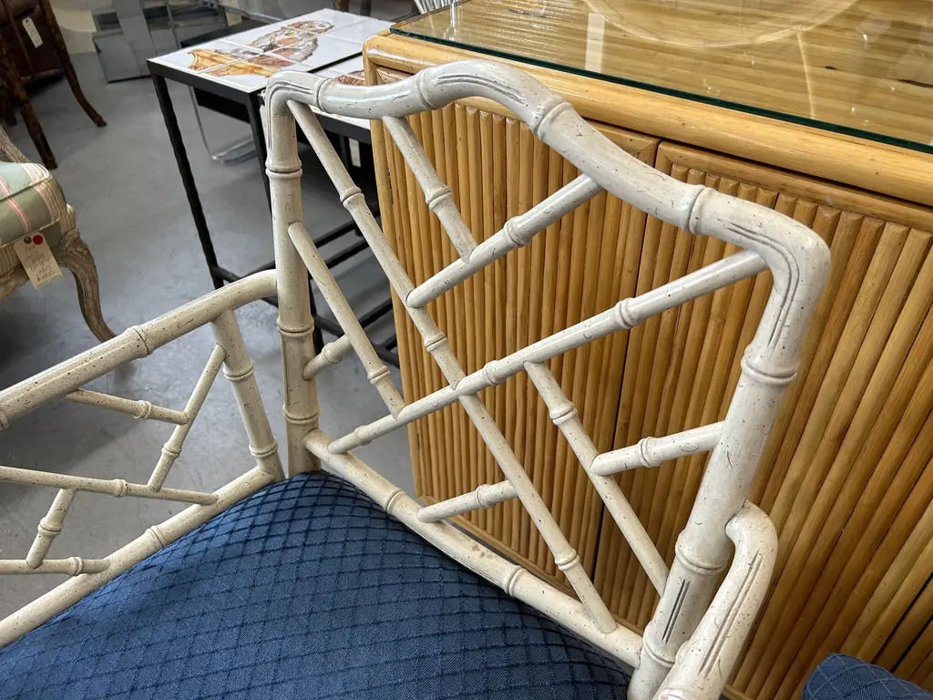 Vintage 20th Century pair of faux bamboo Chinese Chippendale armchairs to float in your space or add to the ends of your dining table. Classic pair.