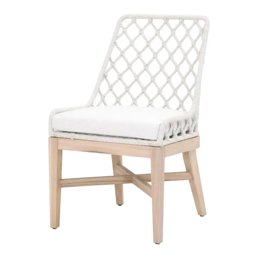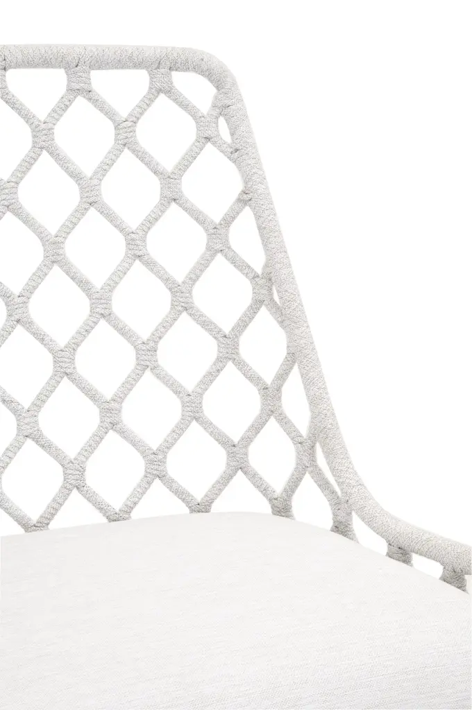 Set the tone of a casual beachy atmosphere with this rope dining chair. This dining chair is carefully crafted with an intricately woven rope designed in a lattice-like pattern. It is constructed with solid gray teak legs that are suitable for outdoor or indoor use. Its removable seat cushion is made of an olefin fabric that is weather resistant and can sustain through light weather conditions (the cushion should be stored away in extreme weather conditions and heavy rain). Furnish your dining room or outdoor dining set with this coastal-inspired dining chairs.