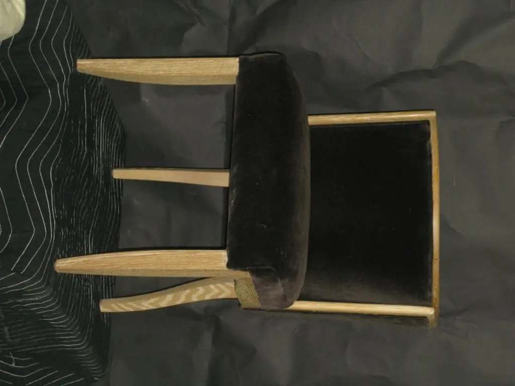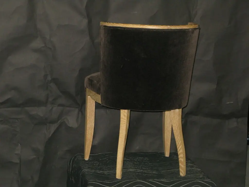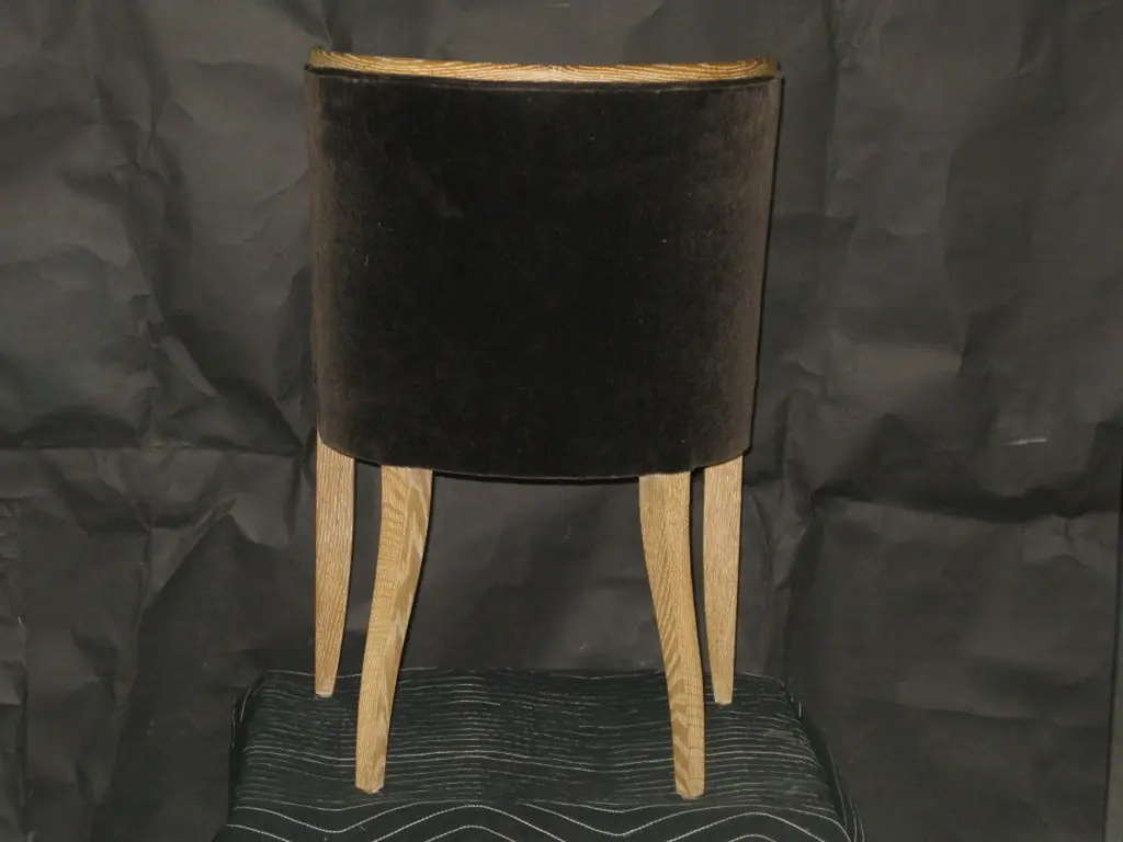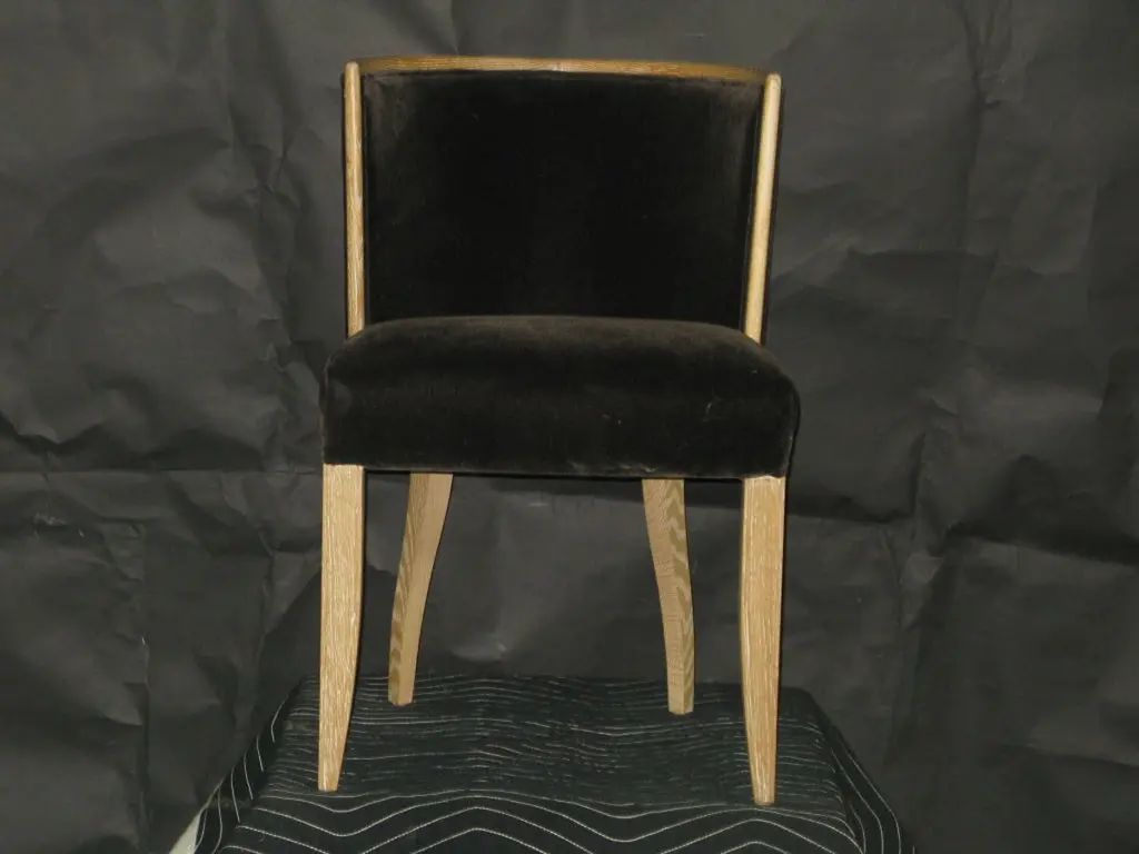This chic dining side chair was created to partner with the Jackie dining chair. These are in a cerused white oak with a wax finish. The chair is shown in a mushroom mohair. This chair can be ordered in a variety of woods and finishes, COM.