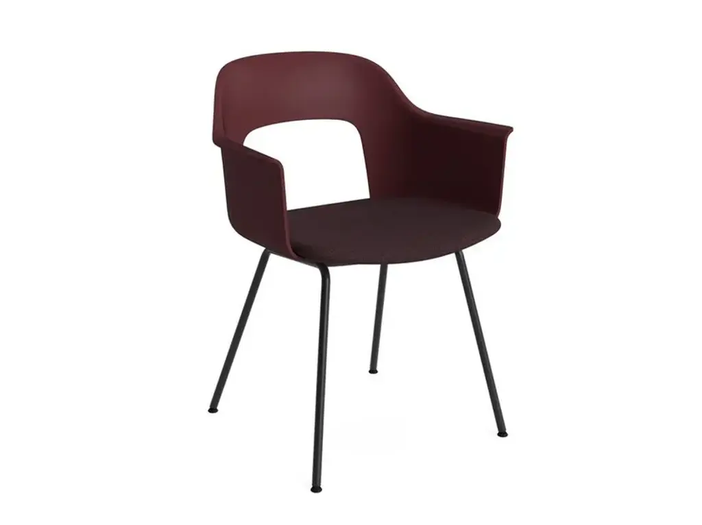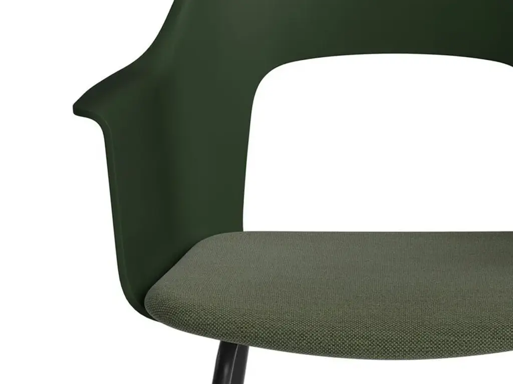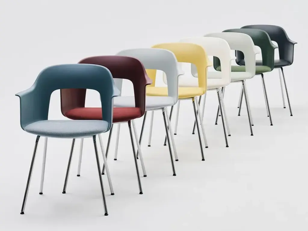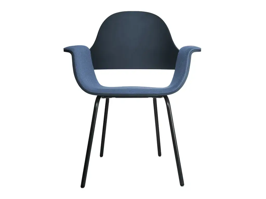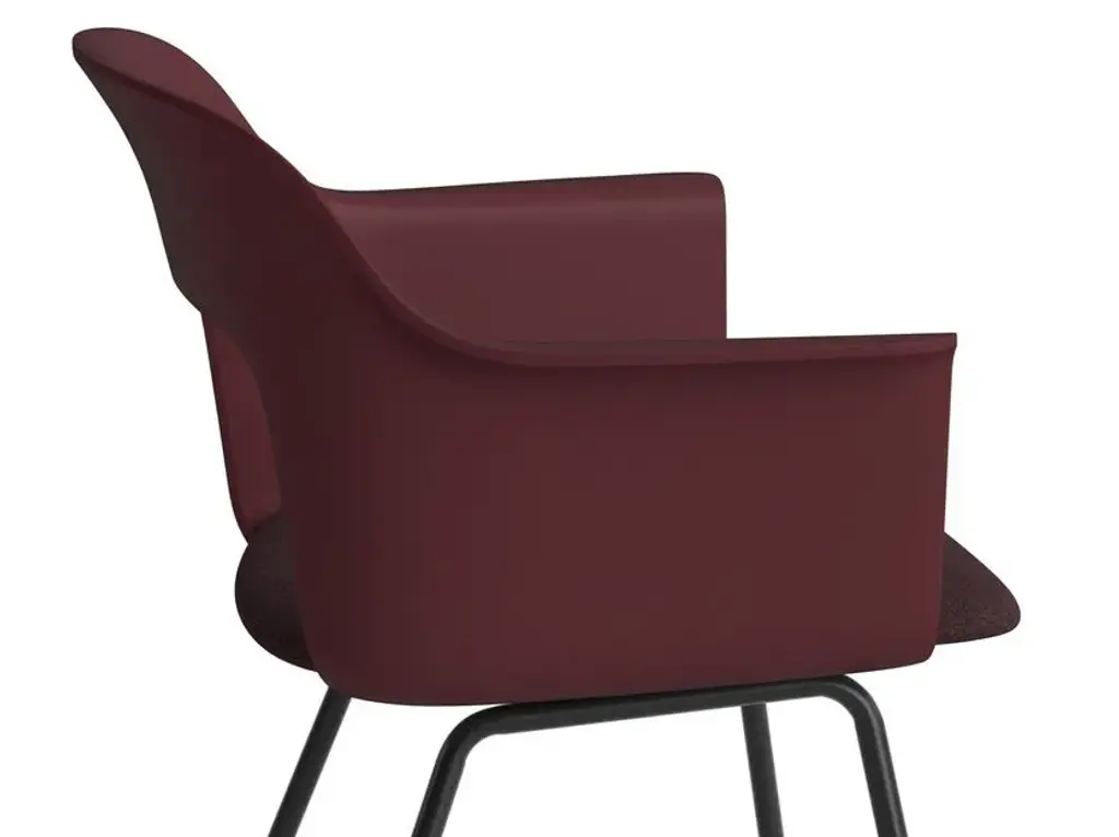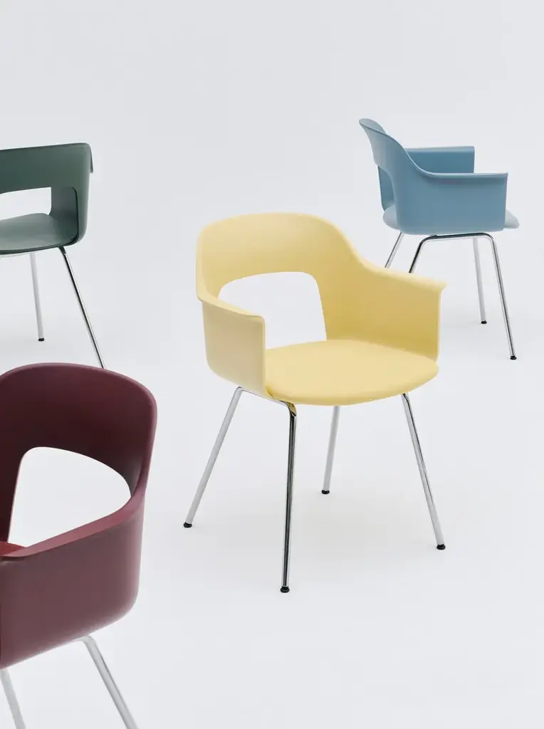 Layout 213 is an open-back chair with armrests with a polypropylene shell and powder-coated steel legs. Fabric upholstored seat.Designed by Julien Renault, Layout Armchair 213 offers a flexible and innovative design shaped by a commitment to comfort, functionality, and circularity. Characterised by the opening in the backrest, this defining feature provides greater comfort while giving its appearance a sense of lightness and transparency. Featuring an upholstered seat for a warm, inviting expression and slim tubular legs that offer both stability and elegance, all chair components can be fully disassembled to extend its lifespan and enable refurbishment for long-term use. The shell is crafted from a minimum of 96% post-consumer recycled plastic and offered in a wide range of colours. The frame comes in either a chrome or powder coated finish, with the upholstered seat available in a variety of fabric and olive-leaf tanned leather options, making Layout a versatile and durable seating solution ideal for offices, restaurants, public institutions, and domestic settings.