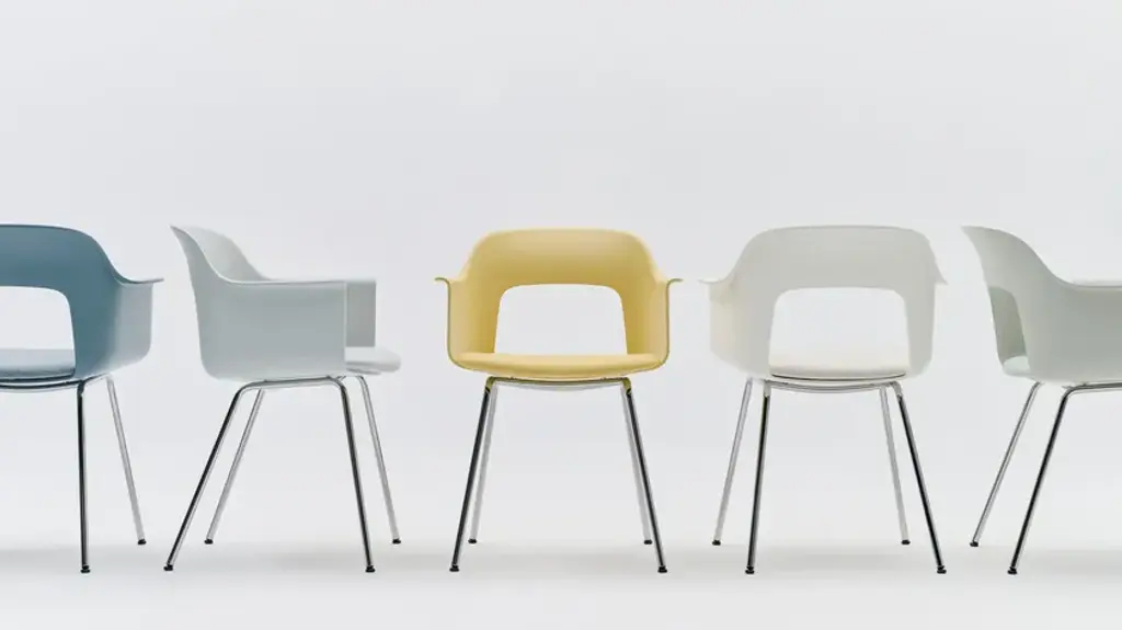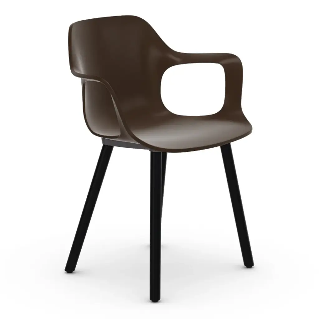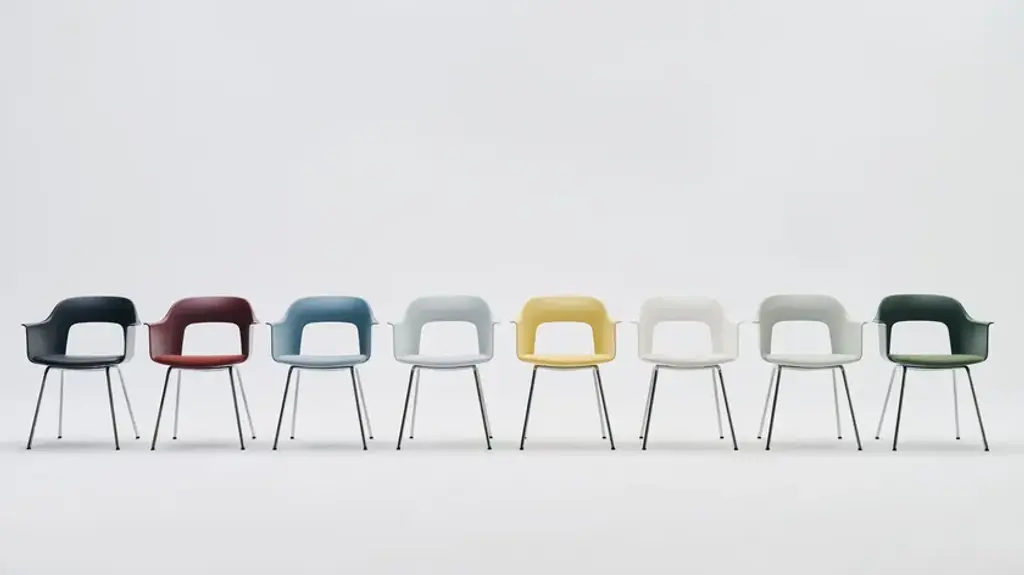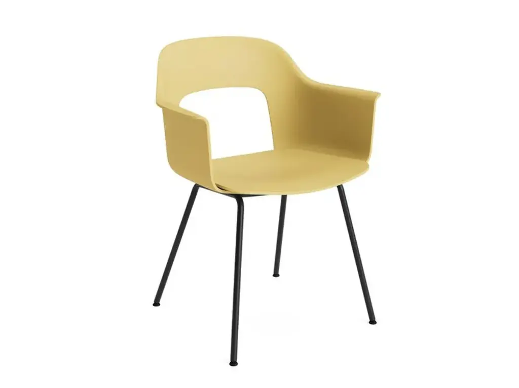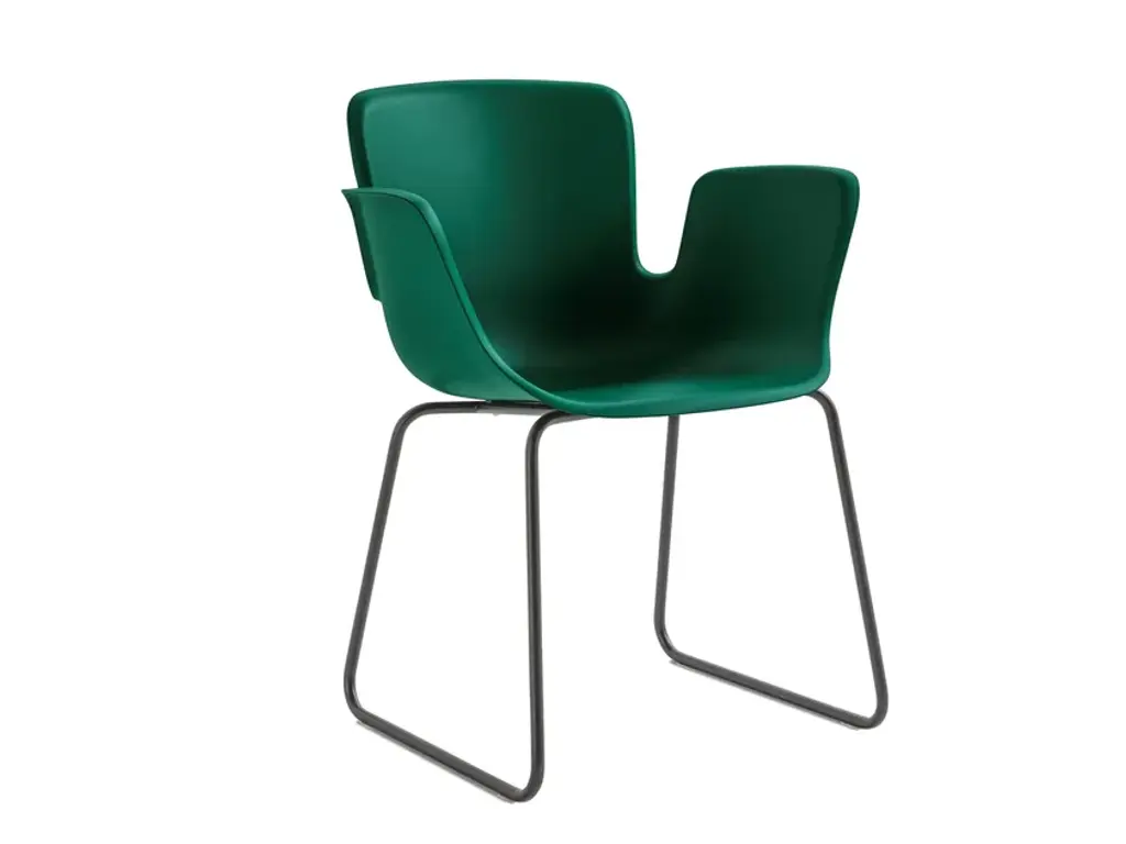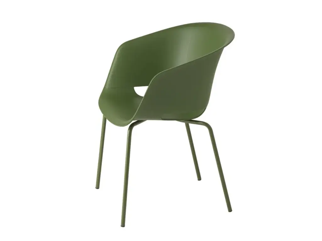 Layout 213 is an open-back chair with armrests with a polypropylene shell and powder-coated steel legs. Fabric upholstored seat.Designed by Julien Renault, Layout Armchair 213 offers a flexible and innovative design shaped by a commitment to comfort, functionality, and circularity. Characterised by the opening in the backrest, this defining feature provides greater comfort while giving its appearance a sense of lightness and transparency. Featuring an upholstered seat for a warm, inviting expression and slim tubular legs that offer both stability and elegance, all chair components can be fully disassembled to extend its lifespan and enable refurbishment for long-term use. The shell is crafted from a minimum of 96% post-consumer recycled plastic and offered in a wide range of colours. The frame comes in either a chrome or powder coated finish, with the upholstered seat available in a variety of fabric and olive-leaf tanned leather options, making Layout a versatile and durable seating solution ideal for offices, restaurants, public institutions, and domestic settings.