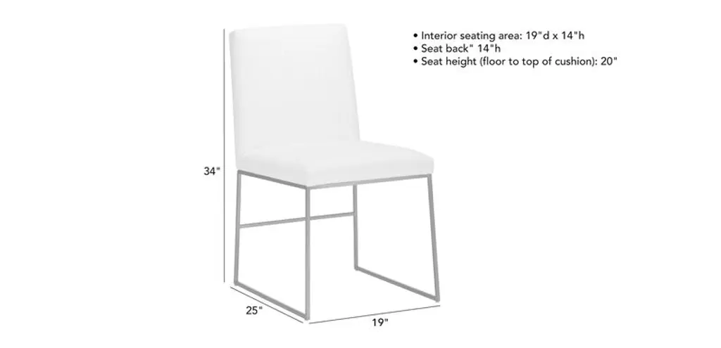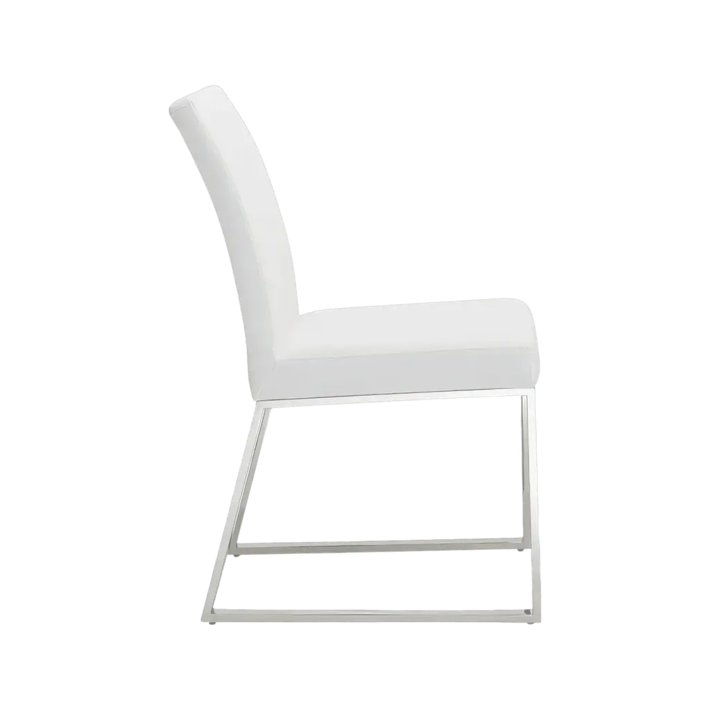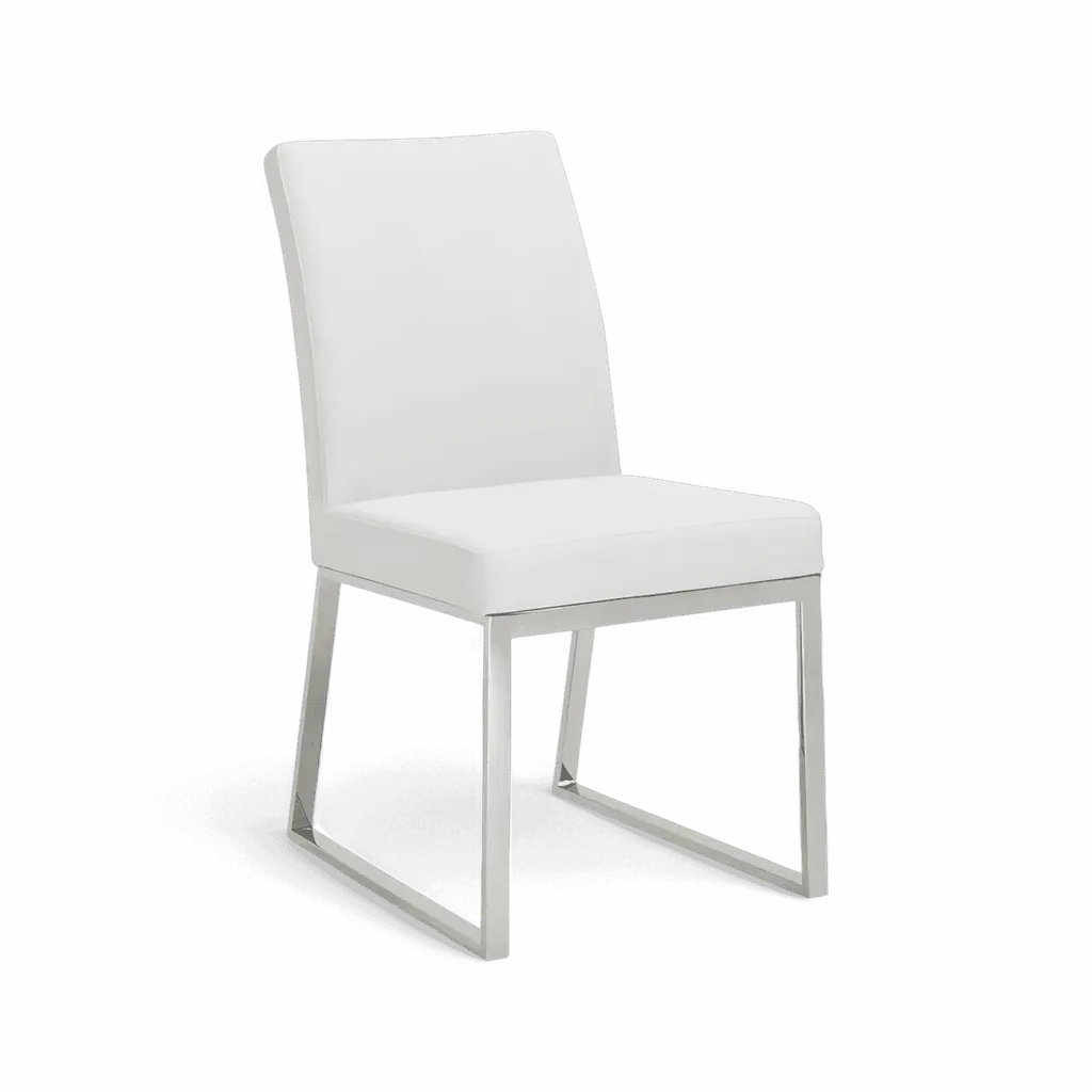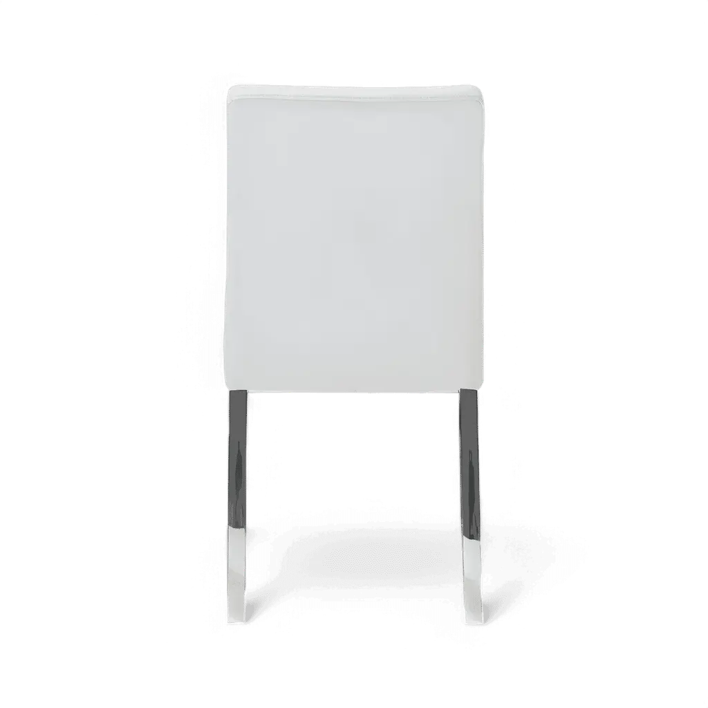 Modernize your dining room with the Leandro Chair in White. A chrome frame is topped with flawless white leatherette and foam cushioning for glamorous support. The rubber feet at the bottom of the base allows for movement without scratching. Place four of these showstoppers in any modern dining room for an ostentatious appearance. Also available in Gray.White Leatherette Upholstery, Chrome Finish, Rubber Feet Reinforcement