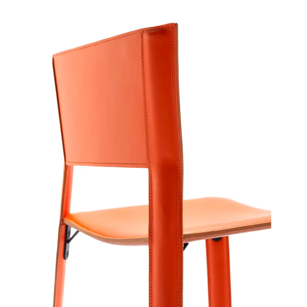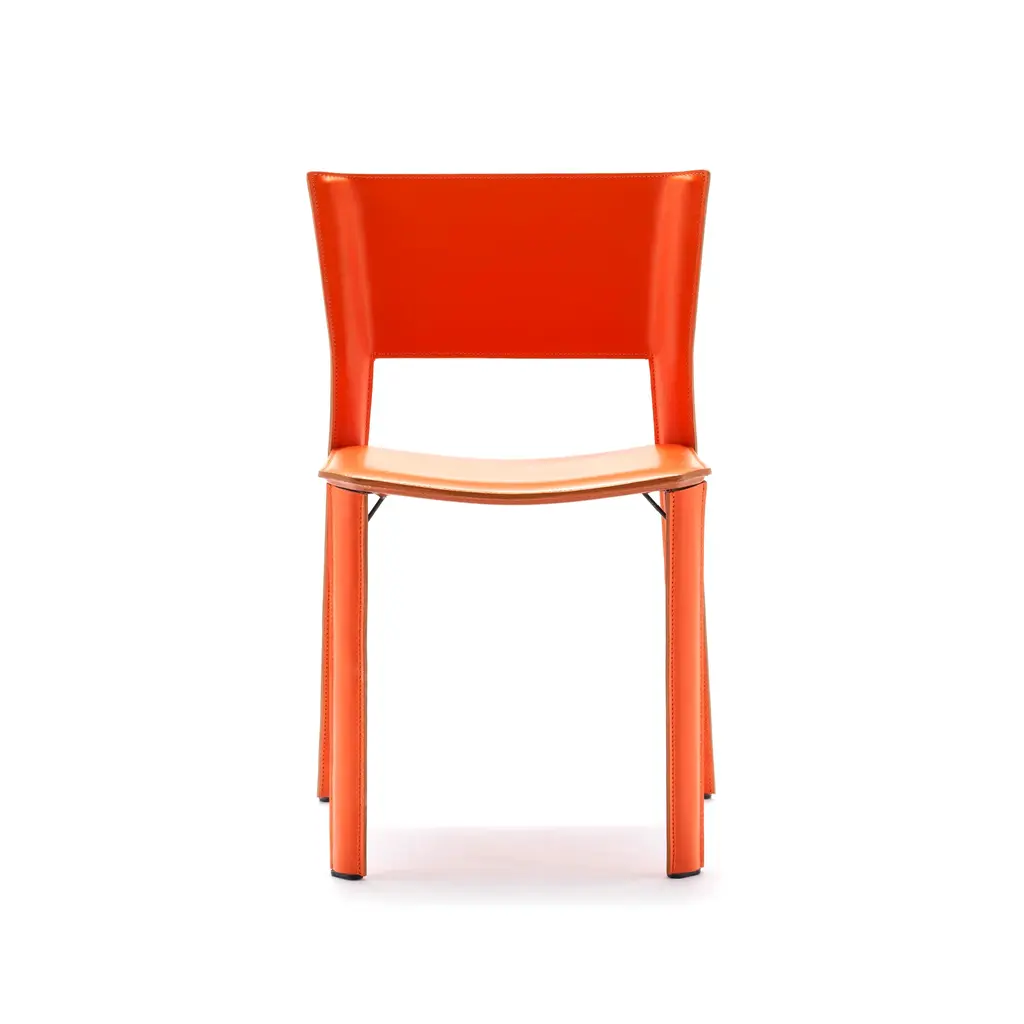 S91 is the dining chair with a steel structure in various Fasem finishes. The seat and backrest are lightly padded. The full-grain Fasem leather upholstery covers the entire chair, including the legs. The slight curvature of the backrest makes it comfortable, providing support for the seat.