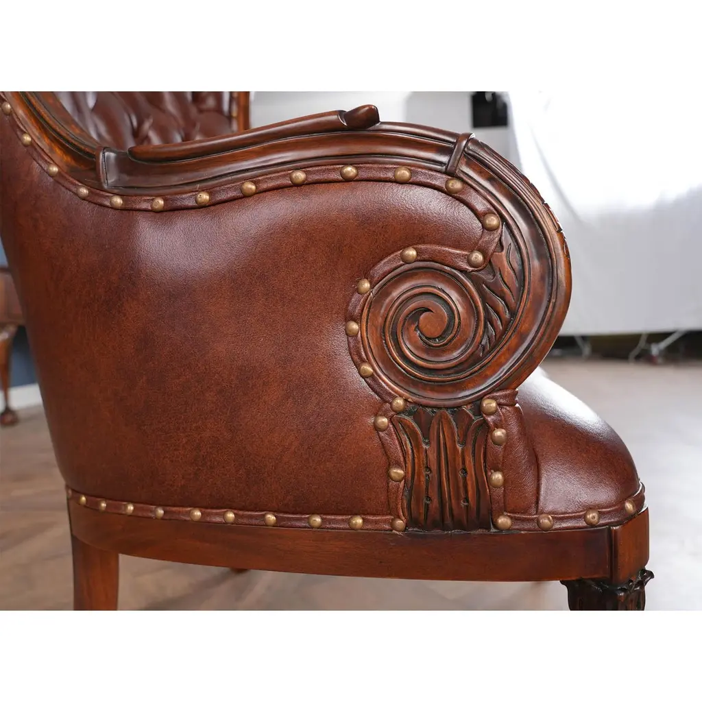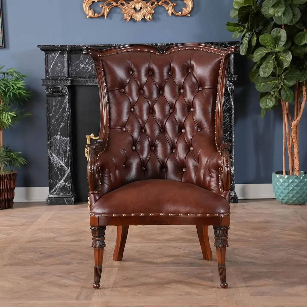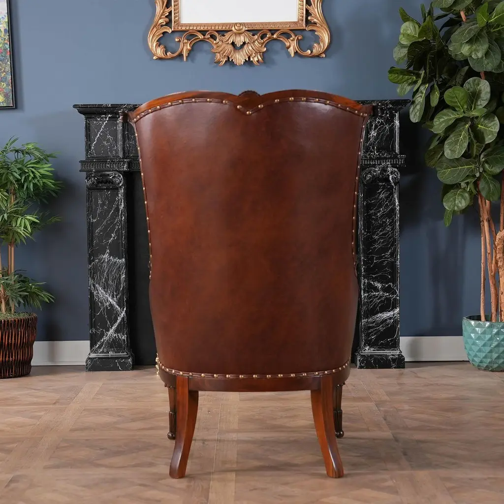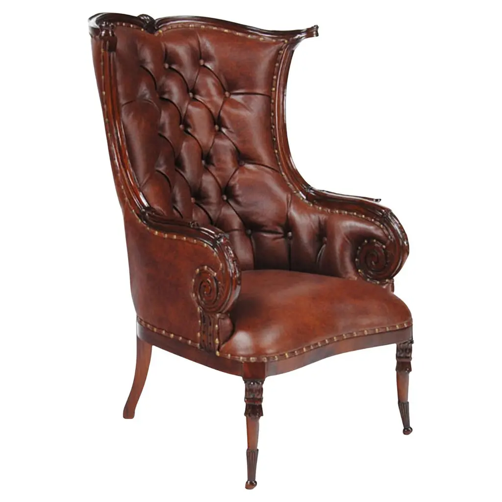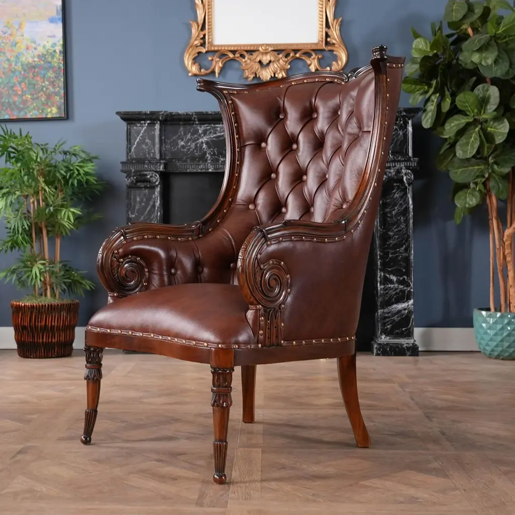 The Niagara Furniture Leather Fireside Chair is designed after an American original antique chair and ships out covered in full grained tufted genuine leather with brass nail trim. This reproduction antique has all of the features of it’s ancestral inspiration with a solid mahogany barrel back designed frame for ultimate comfort when seated. The Leather Fireside Chair has carved details which are produced using plantation grown solid mahogany throughout the frame. Our Leather Fireside Chair is suitable for use anywhere in the home, although they still look best when placed near a fireplace!Arm height is approximately 25 inches and seat height approximately 17 inches.Measures 27″w x 31″d x 44″h metric: 69 x 79 x 112
