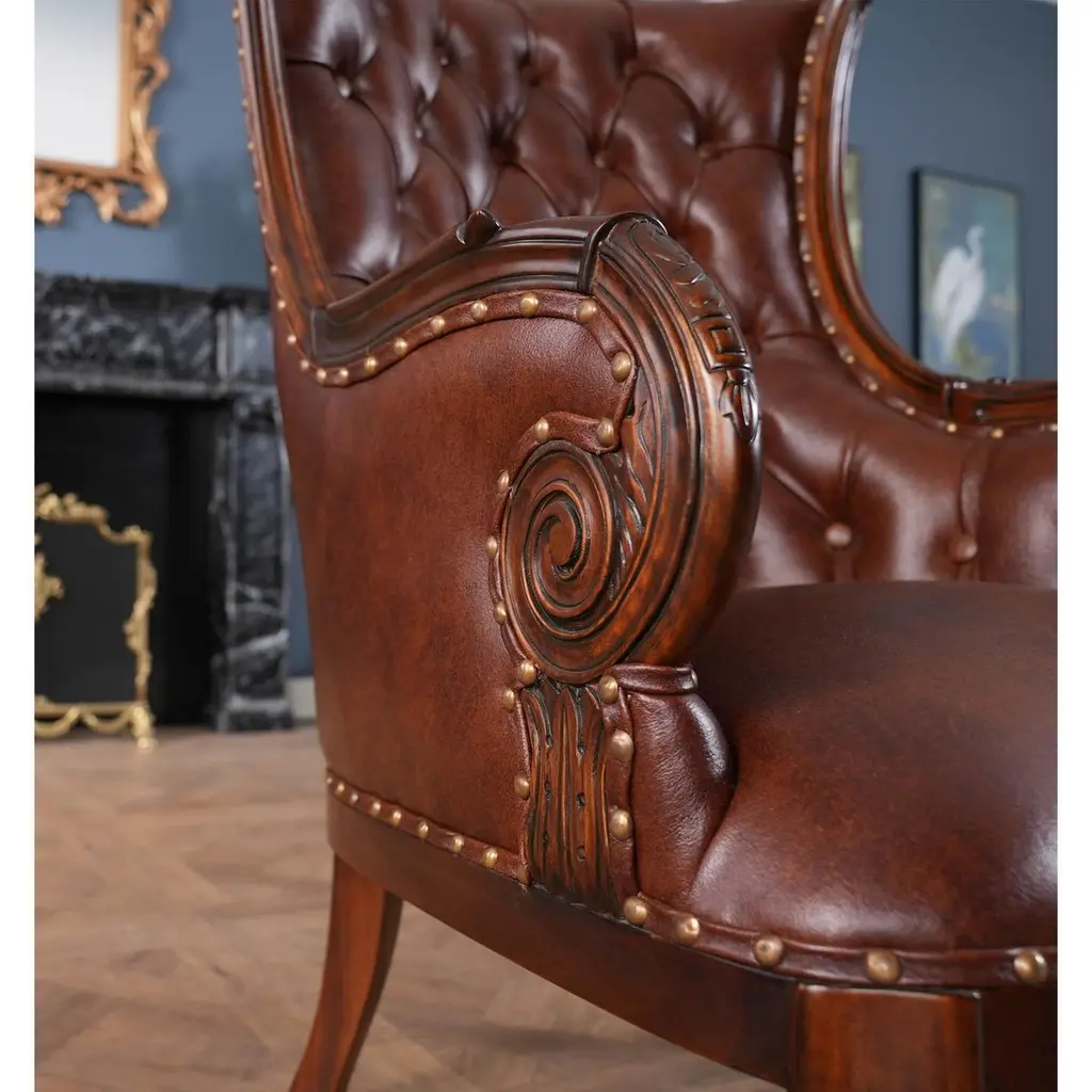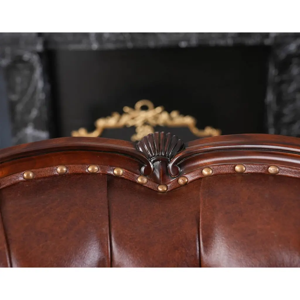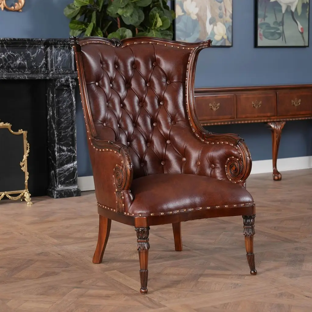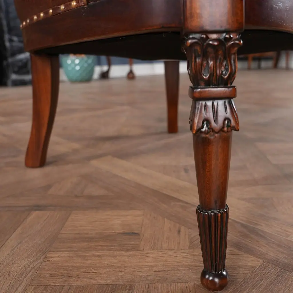 The Niagara Furniture Leather Fireside Chair is designed after an American original antique chair and ships out covered in full grained tufted genuine leather with brass nail trim. This reproduction antique has all of the features of it’s ancestral inspiration with a solid mahogany barrel back designed frame for ultimate comfort when seated. The Leather Fireside Chair has carved details which are produced using plantation grown solid mahogany throughout the frame. Our Leather Fireside Chair is suitable for use anywhere in the home, although they still look best when placed near a fireplace!Arm height is approximately 25 inches and seat height approximately 17 inches.Measures 27″w x 31″d x 44″h metric: 69 x 79 x 112