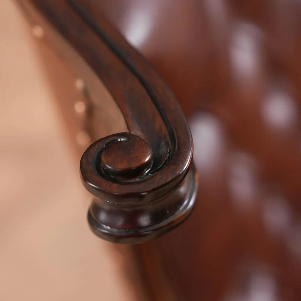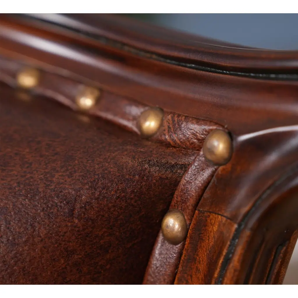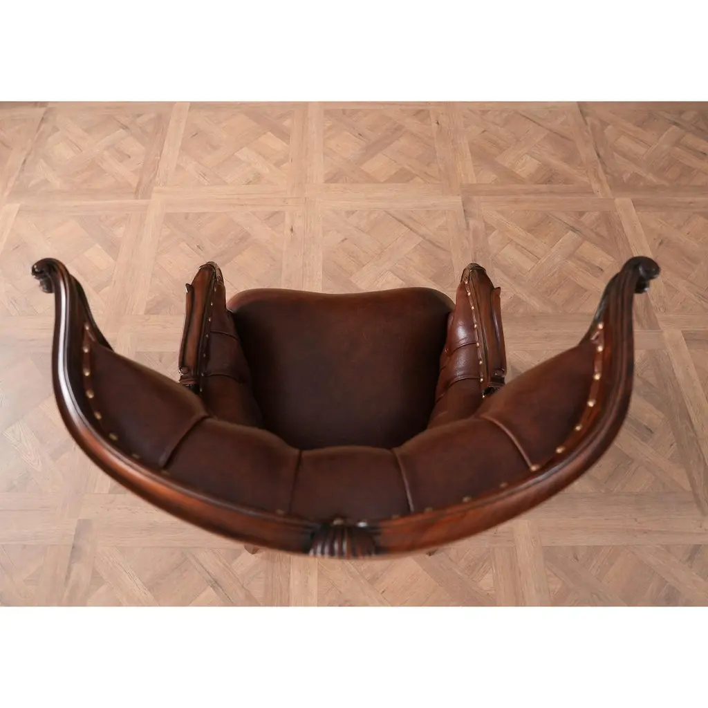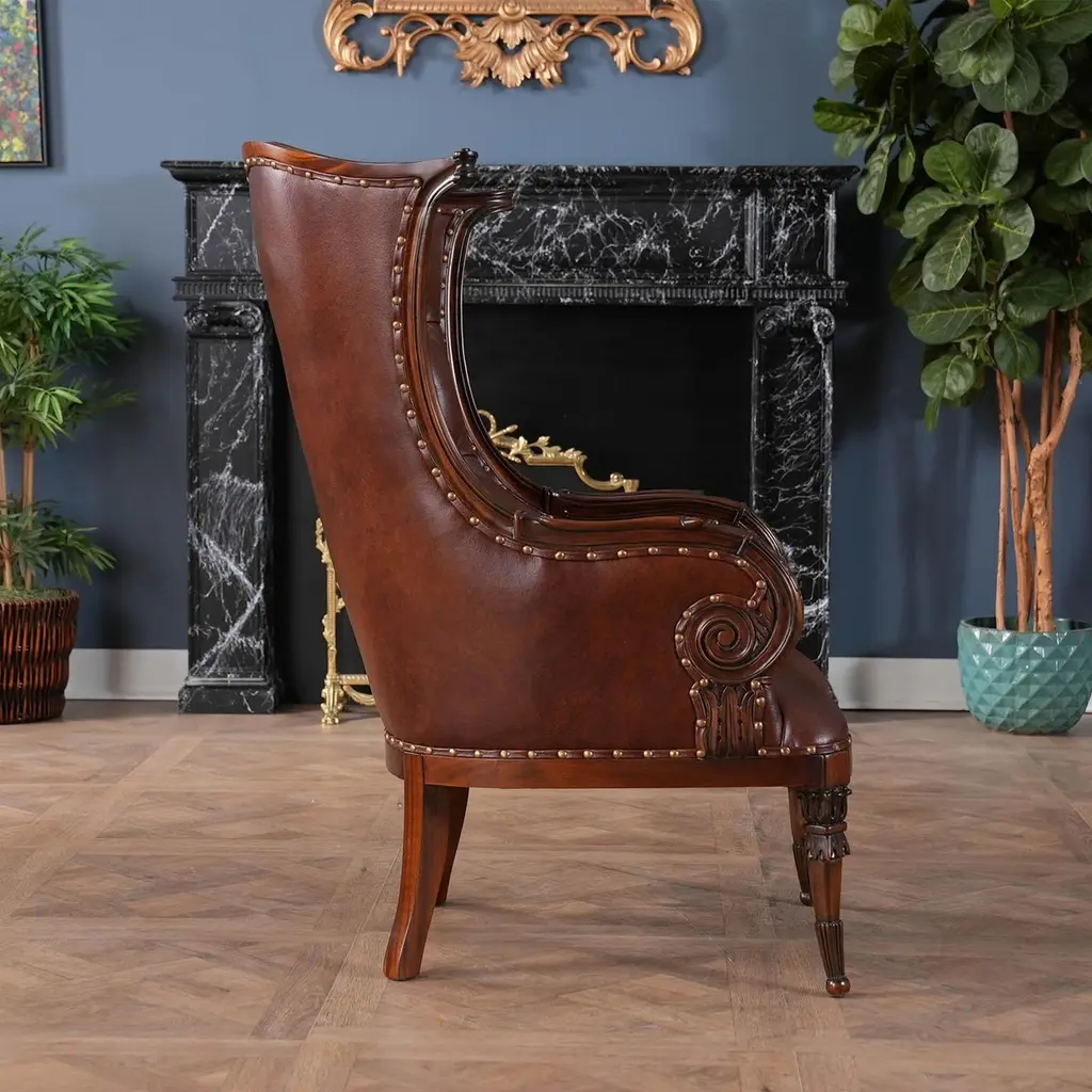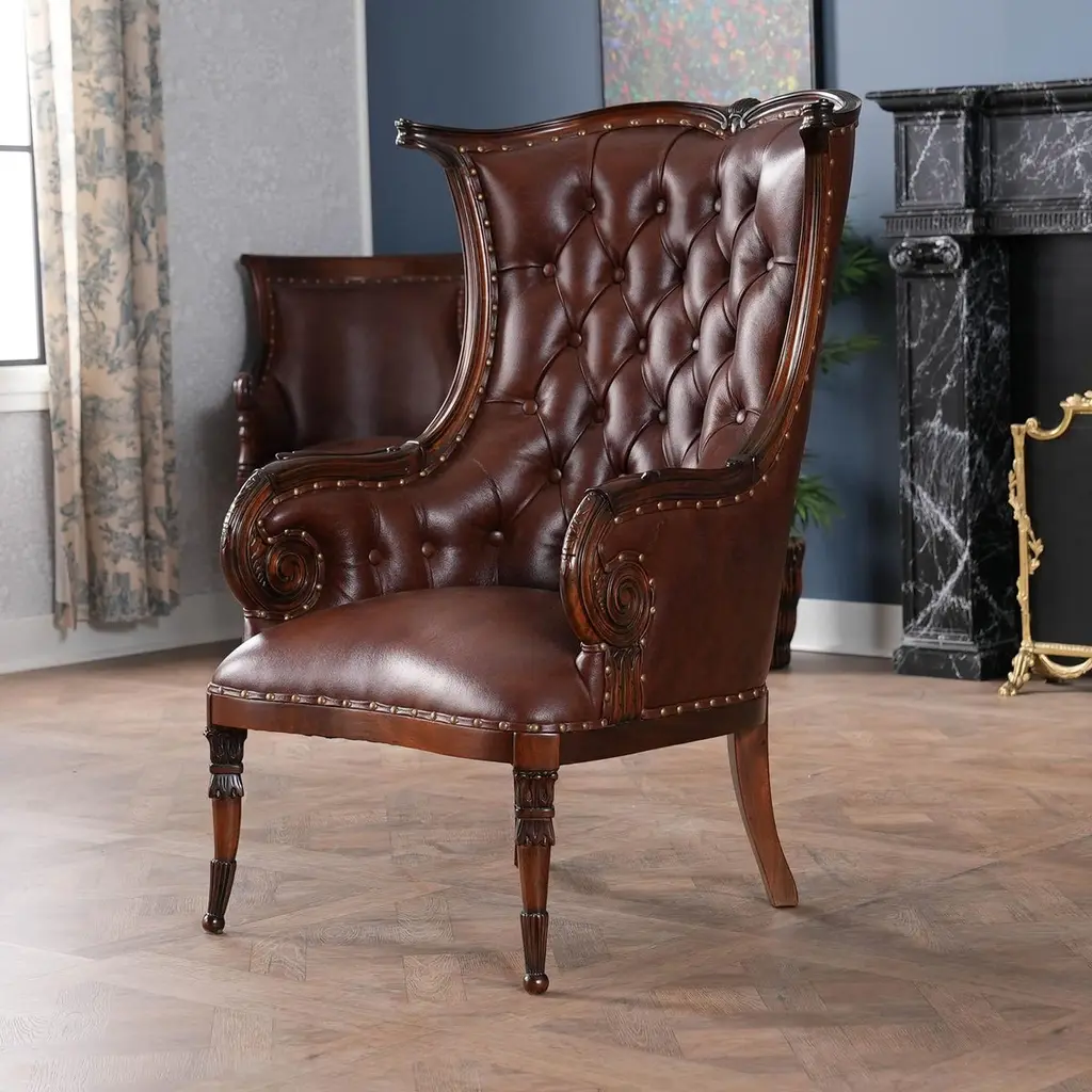 The Niagara Furniture Leather Fireside Chair is designed after an American original antique chair and ships out covered in full grained tufted genuine leather with brass nail trim. This reproduction antique has all of the features of it’s ancestral inspiration with a solid mahogany barrel back designed frame for ultimate comfort when seated. The Leather Fireside Chair has carved details which are produced using plantation grown solid mahogany throughout the frame. Our Leather Fireside Chair is suitable for use anywhere in the home, although they still look best when placed near a fireplace!Arm height is approximately 25 inches and seat height approximately 17 inches.Measures 27″w x 31″d x 44″h metric: 69 x 79 x 112
