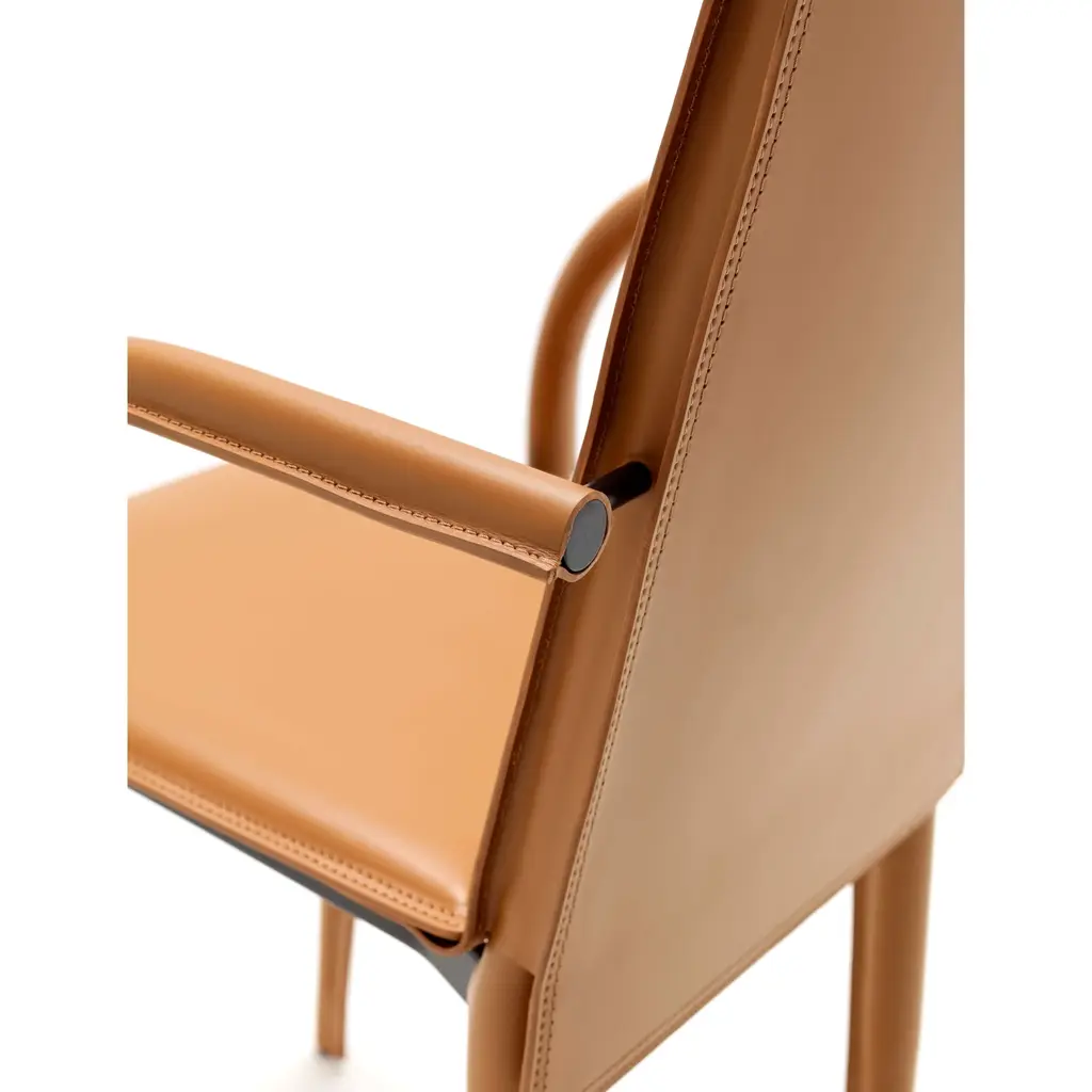 Relaix P is the dining armchair with a steel structure and lightly padded seat and backrest. It is almost entirely upholstered in full-grain Fasem leather. The addition of armrests provides comfortable support and elegance, thanks to the skilled craftsmanship in processing the full-grain Fasem leather.