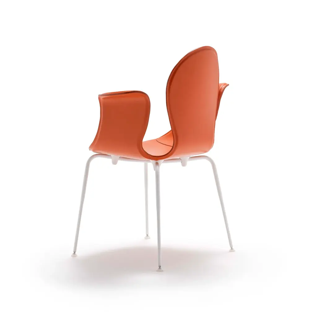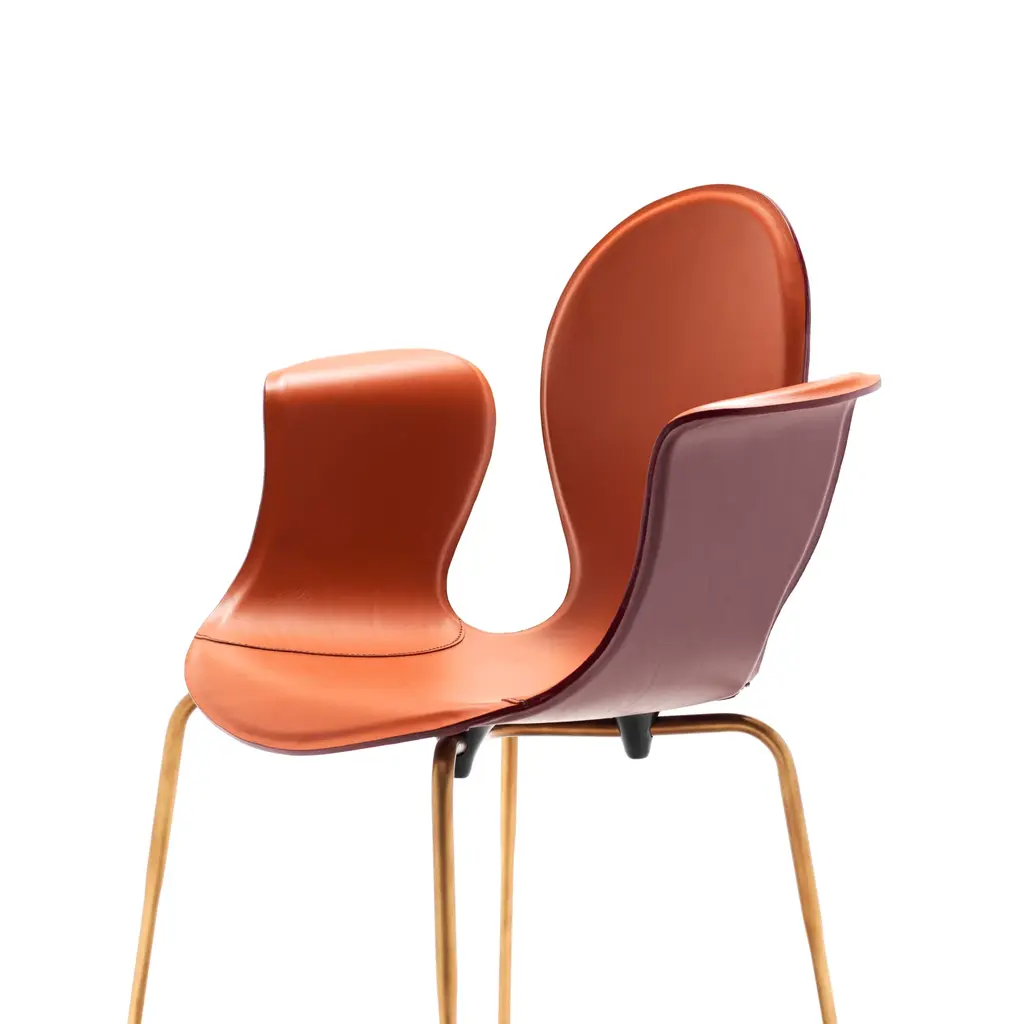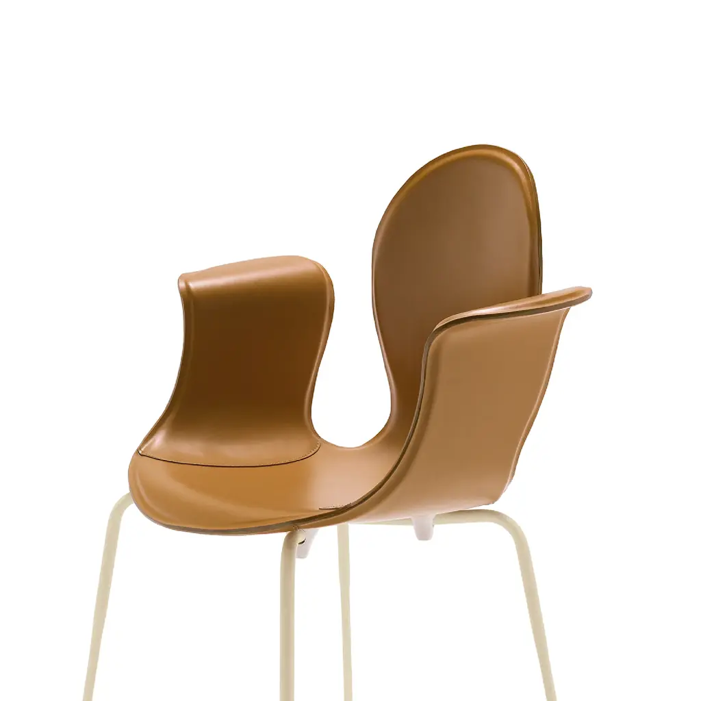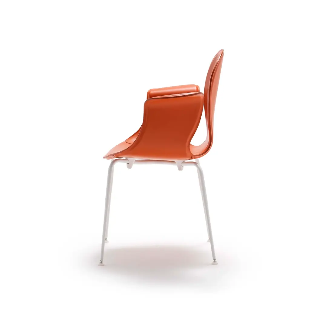 Crop is a dining chair with a base made of steel in various finishes and adjustable feet. The monoblock shell is crafted from layered beech wood and fully upholstered in full-grain leather. The fastening bells are available in white or black polyurethane. The curvature of the shell and the meticulous upholstery in full-grain leather highlight the significant contribution of high craftsmanship.