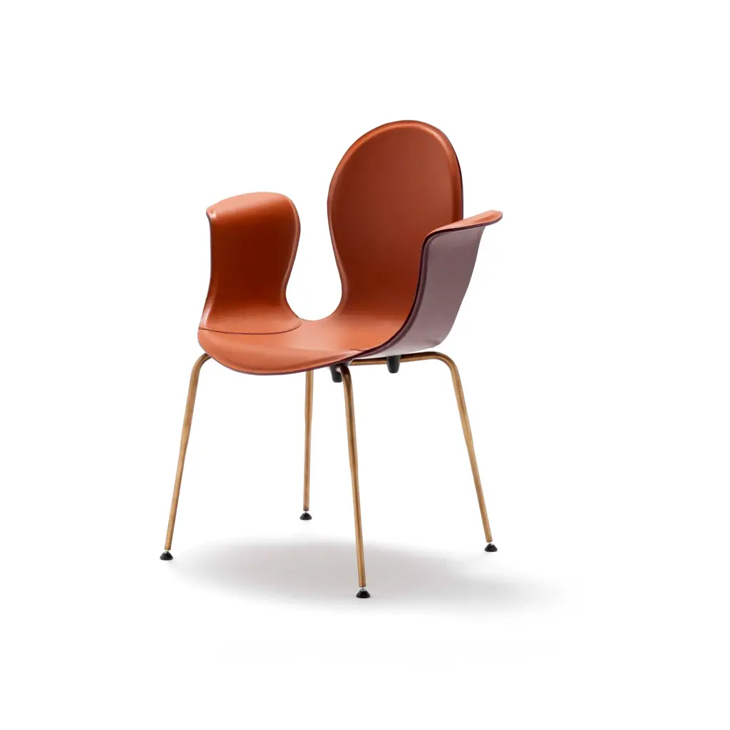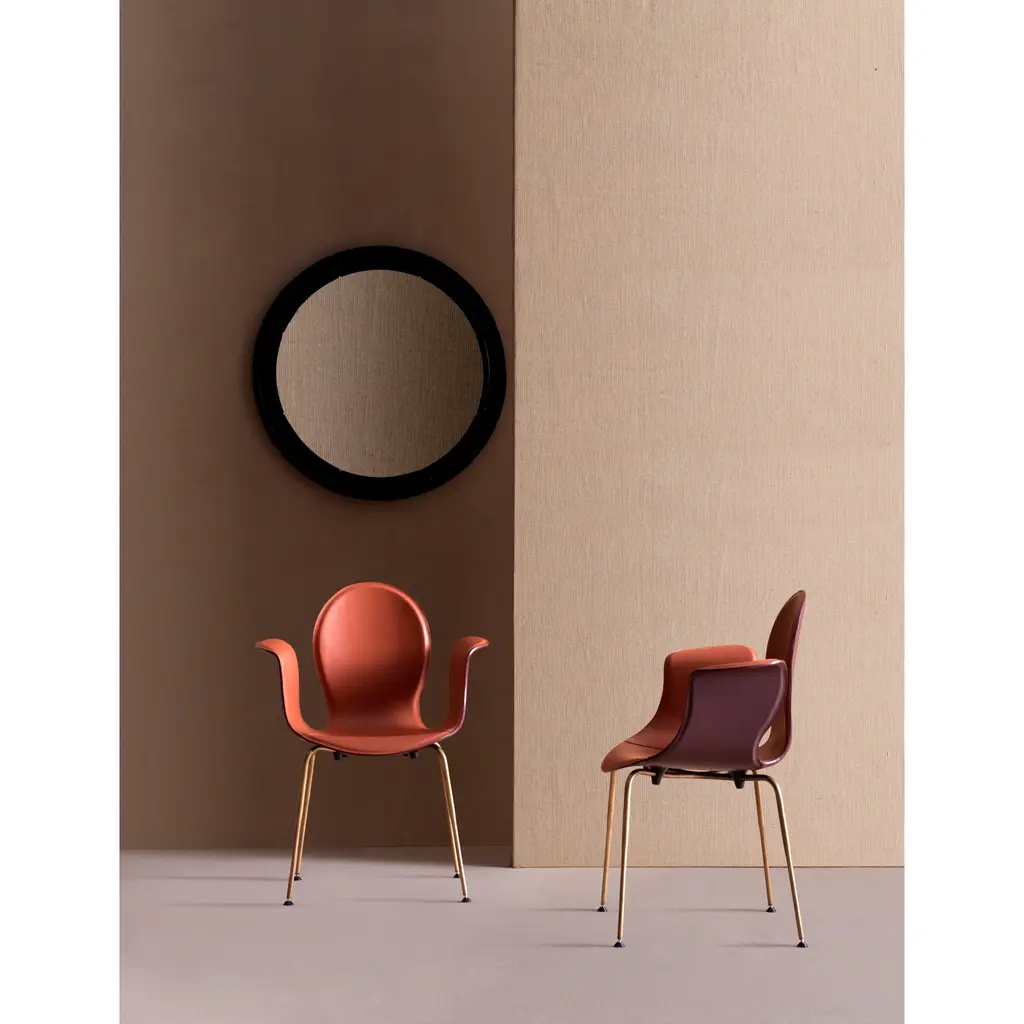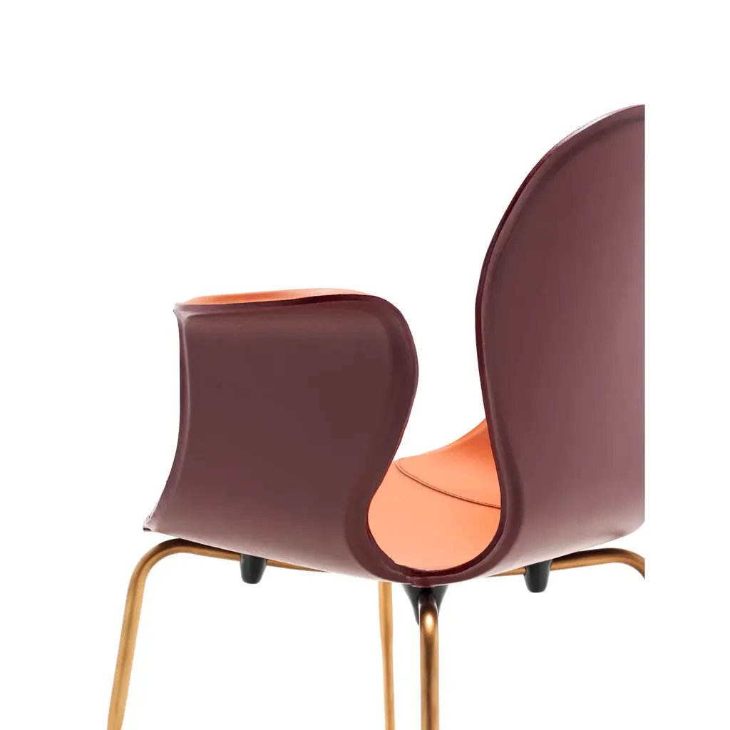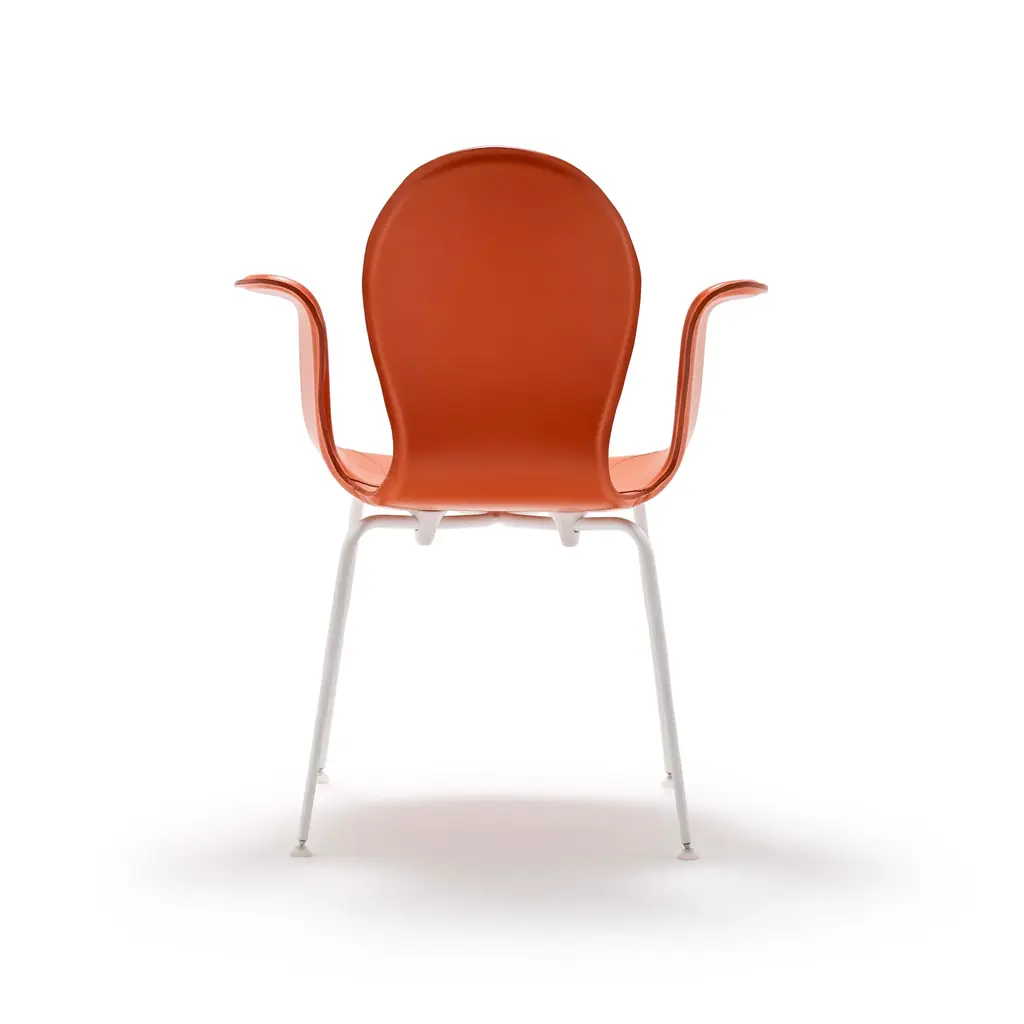Crop is a dining chair with a base made of steel in various finishes and adjustable feet. The monoblock shell is crafted from layered beech wood and fully upholstered in full-grain leather. The fastening bells are available in white or black polyurethane. The curvature of the shell and the meticulous upholstery in full-grain leather highlight the significant contribution of high craftsmanship.