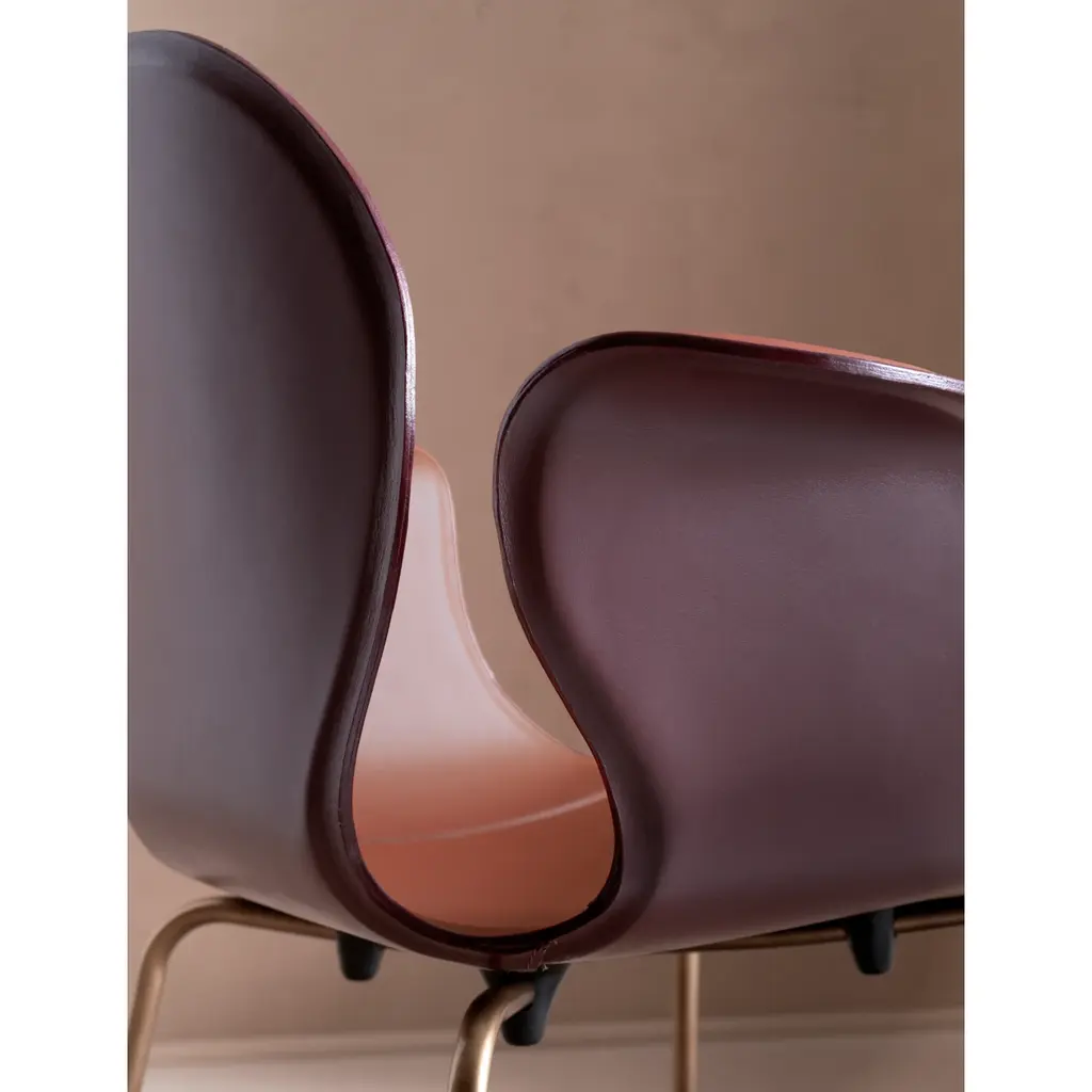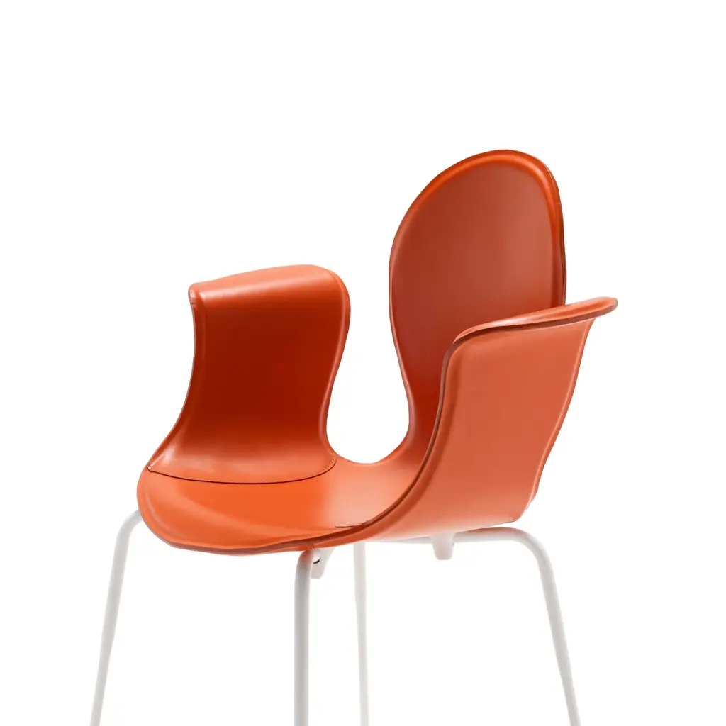 Crop is a dining chair with a base made of steel in various finishes and adjustable feet. The monoblock shell is crafted from layered beech wood and fully upholstered in full-grain leather. The fastening bells are available in white or black polyurethane. The curvature of the shell and the meticulous upholstery in full-grain leather highlight the significant contribution of high craftsmanship.