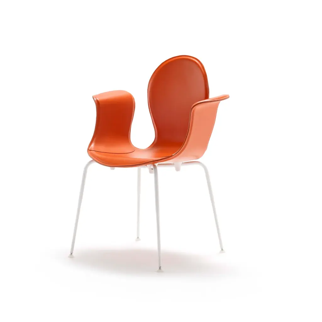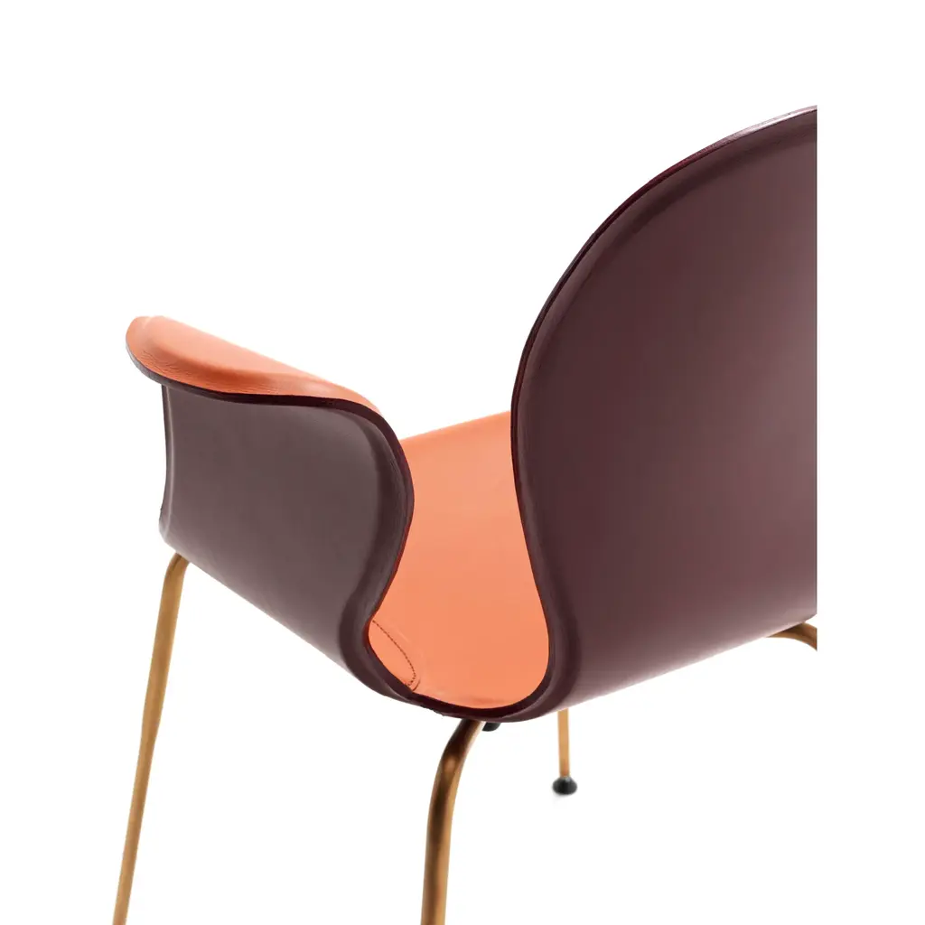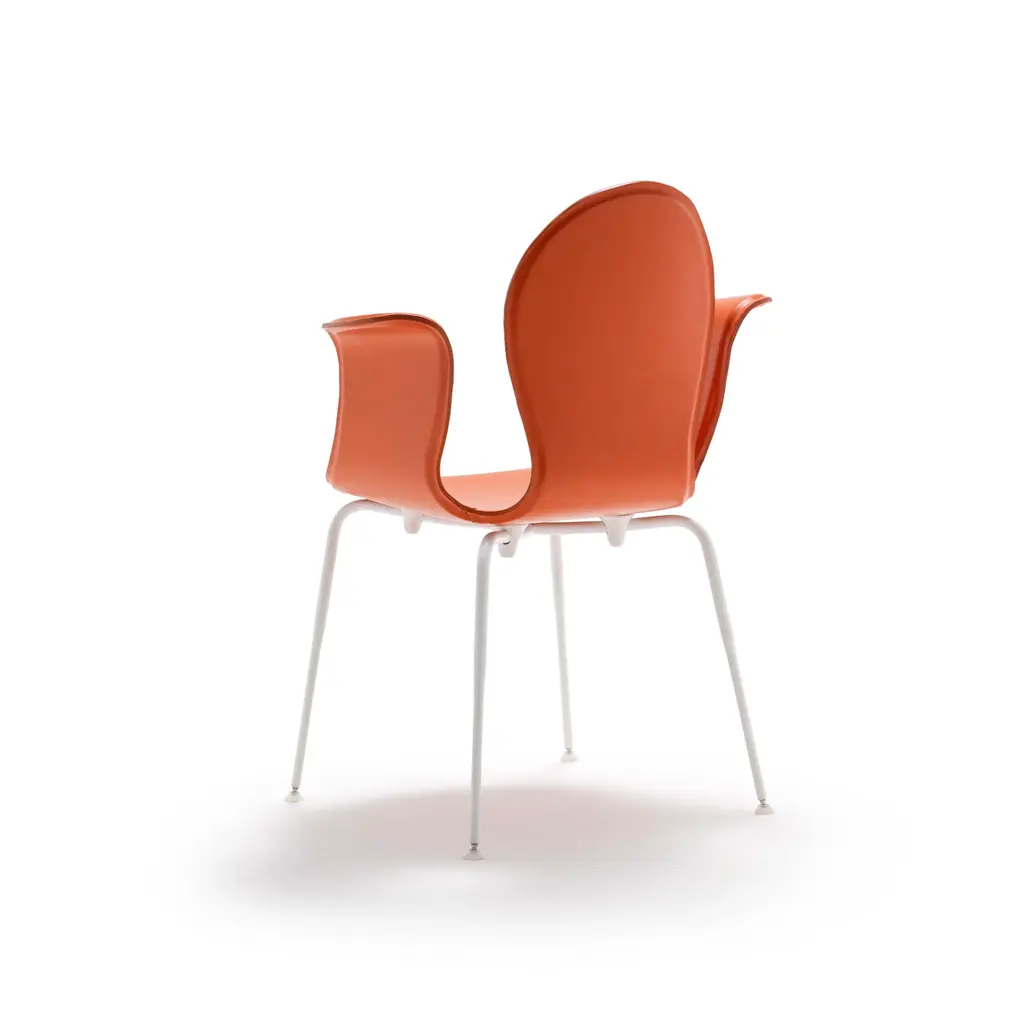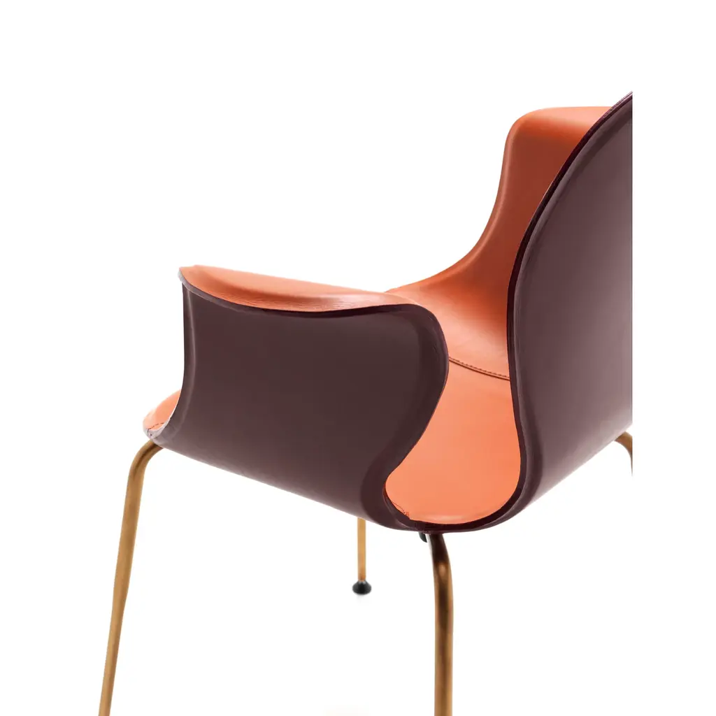 Crop is a dining chair with a base made of steel in various finishes and adjustable feet. The monoblock shell is crafted from layered beech wood and fully upholstered in full-grain leather. The fastening bells are available in white or black polyurethane. The curvature of the shell and the meticulous upholstery in full-grain leather highlight the significant contribution of high craftsmanship.