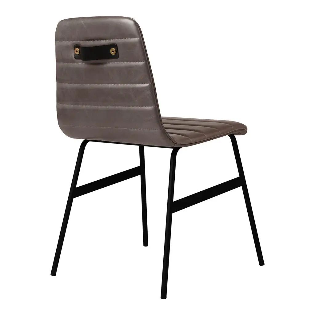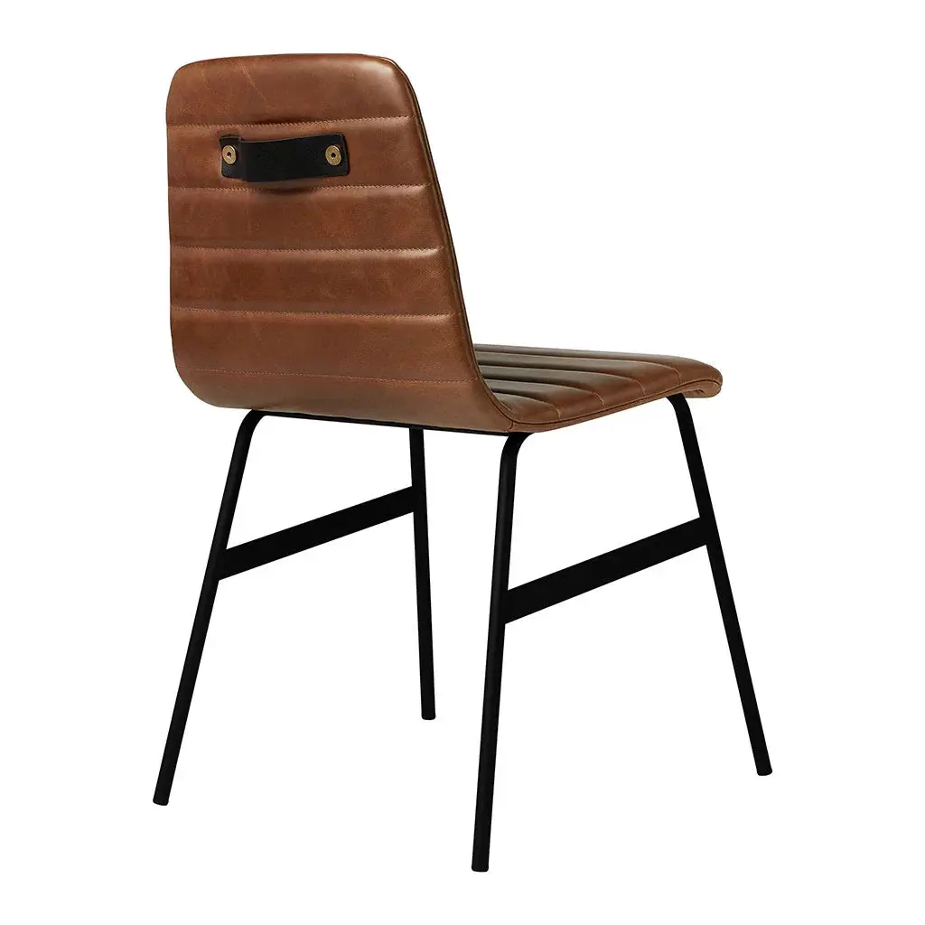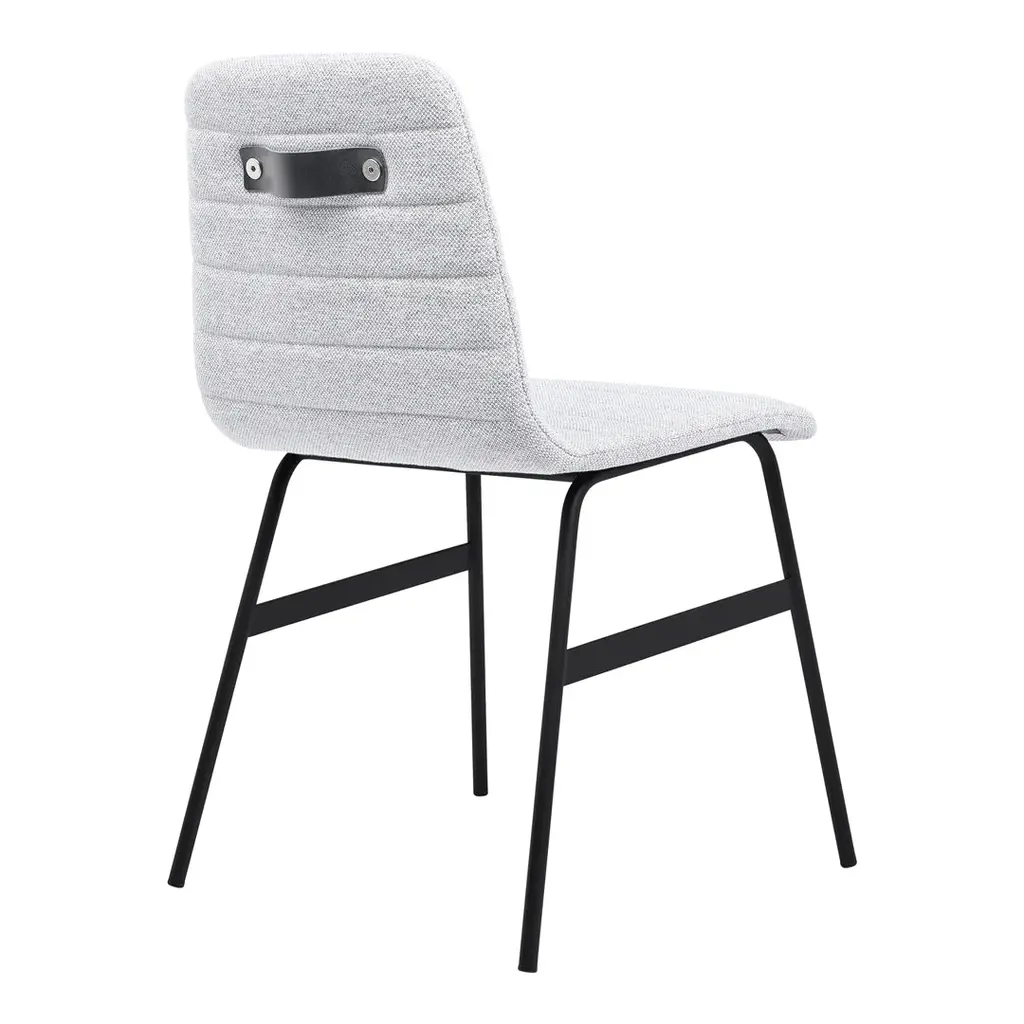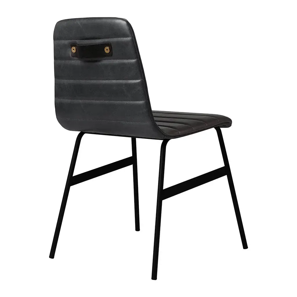 The Lecture Dining Chair is a modern reinterpretation of a classic elementary school chair design. This version features a one-piece, upholstered seat and back, with unique, channel-stitch detailing. The back incorporates a functional leather and brass handle. The black, powder-coated steel legs are reinforced with solid metal stabilizers. Functional, comfortable and stylish, the Lecture Chair works well for any workspace or dining area