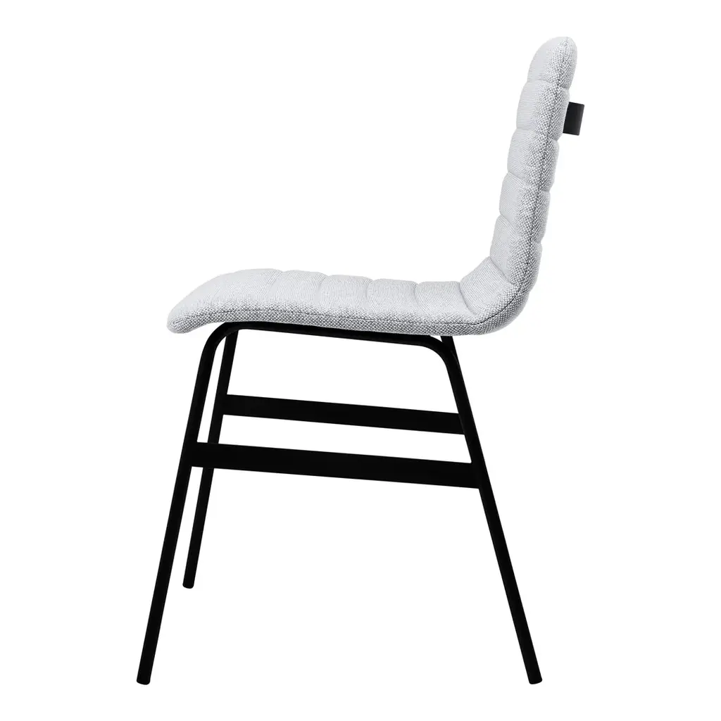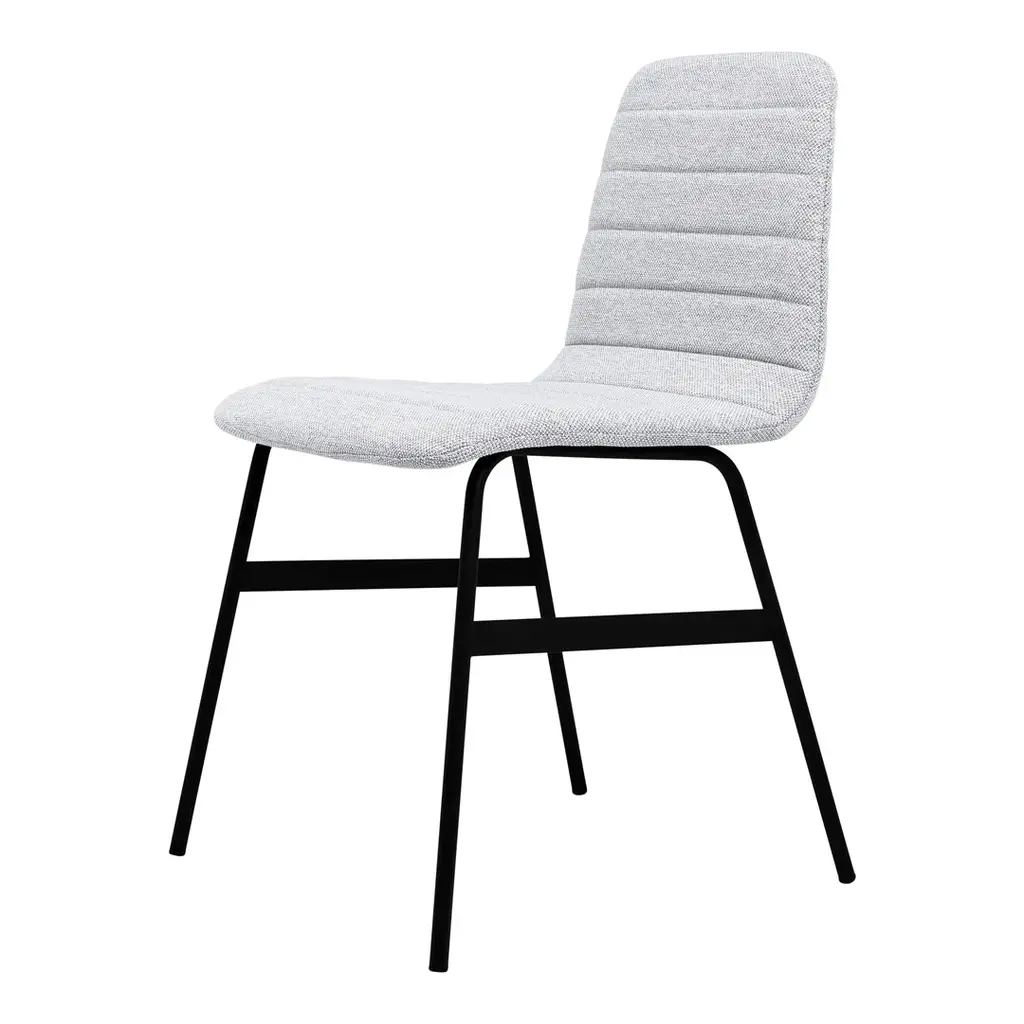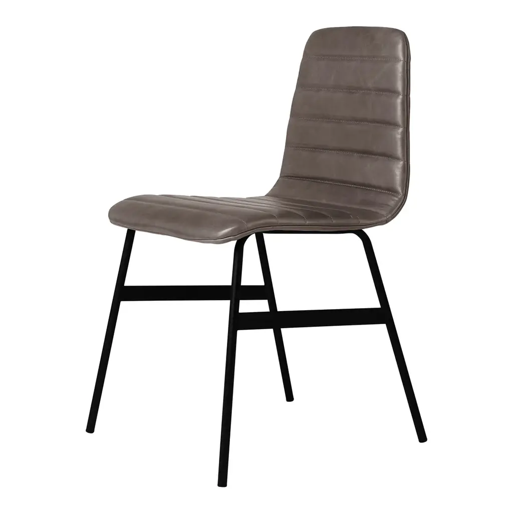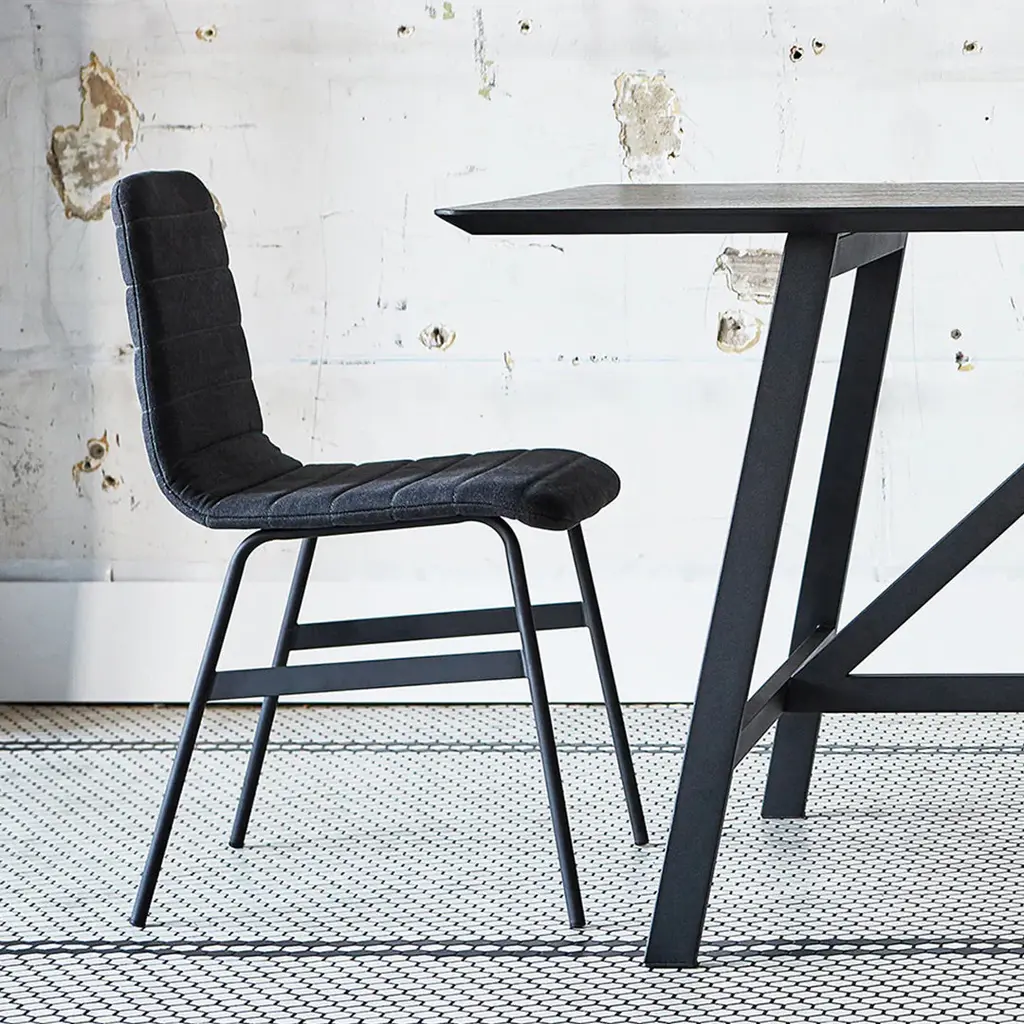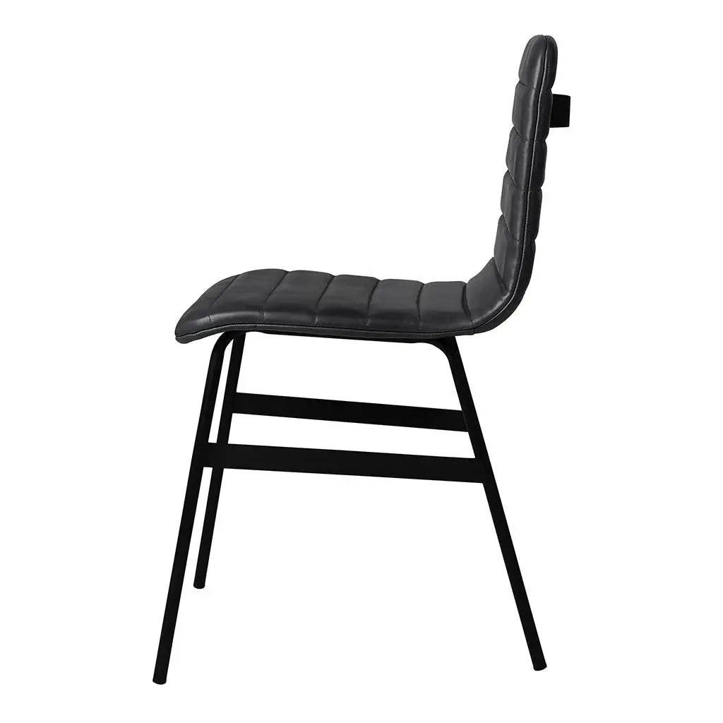 The Lecture Dining Chair is a modern reinterpretation of a classic elementary school chair design. This version features a one-piece, upholstered seat and back, with unique, channel-stitch detailing. The back incorporates a functional leather and brass handle. The black, powder-coated steel legs are reinforced with solid metal stabilizers. Functional, comfortable and stylish, the Lecture Chair works well for any workspace or dining area