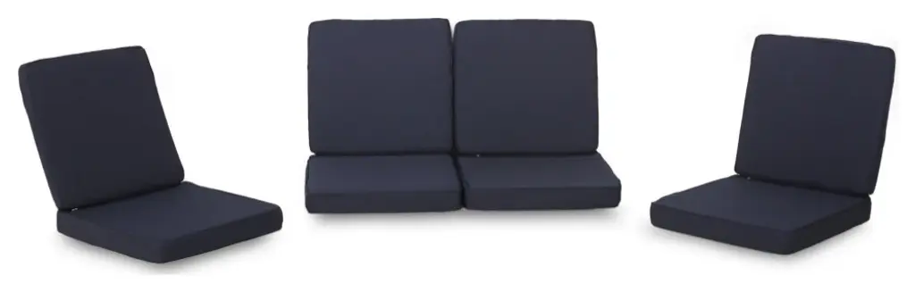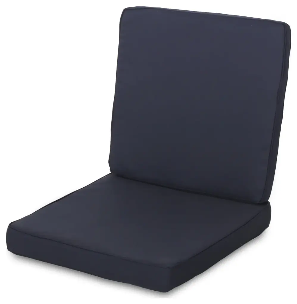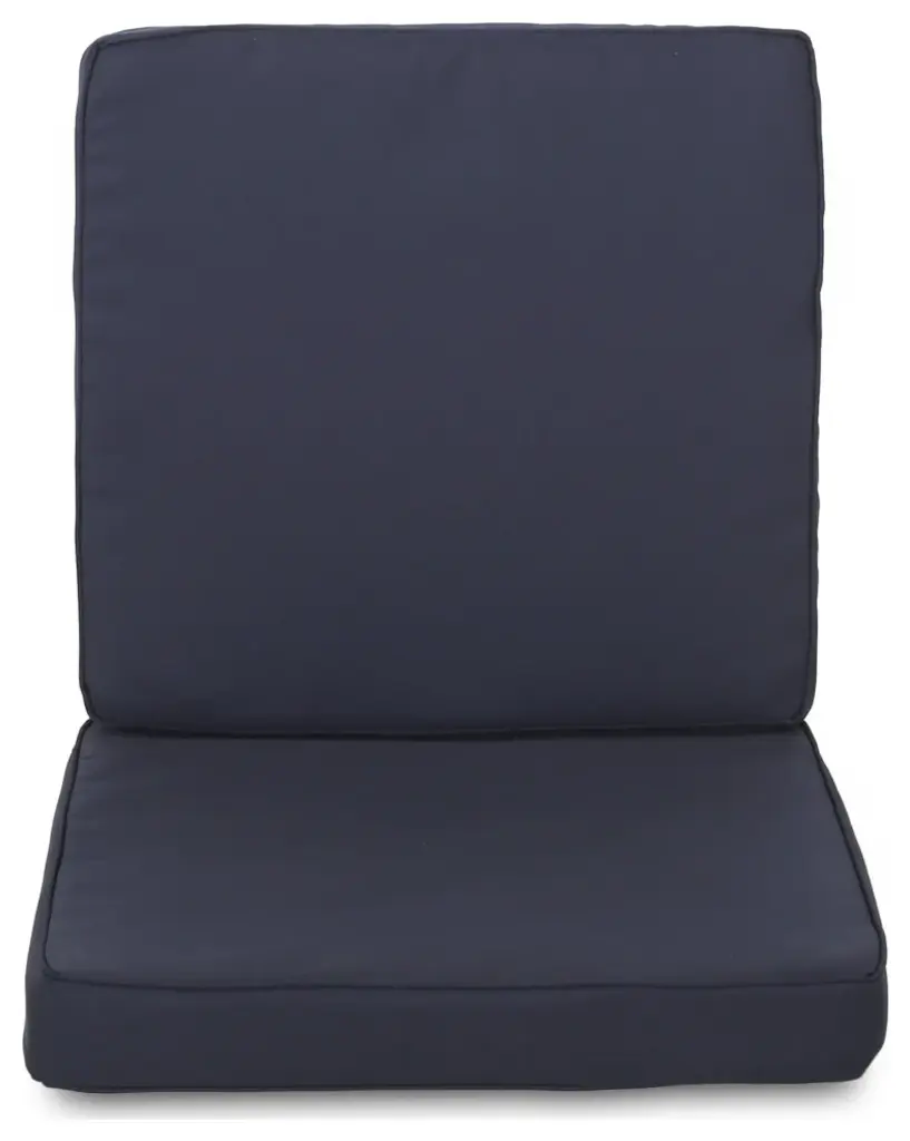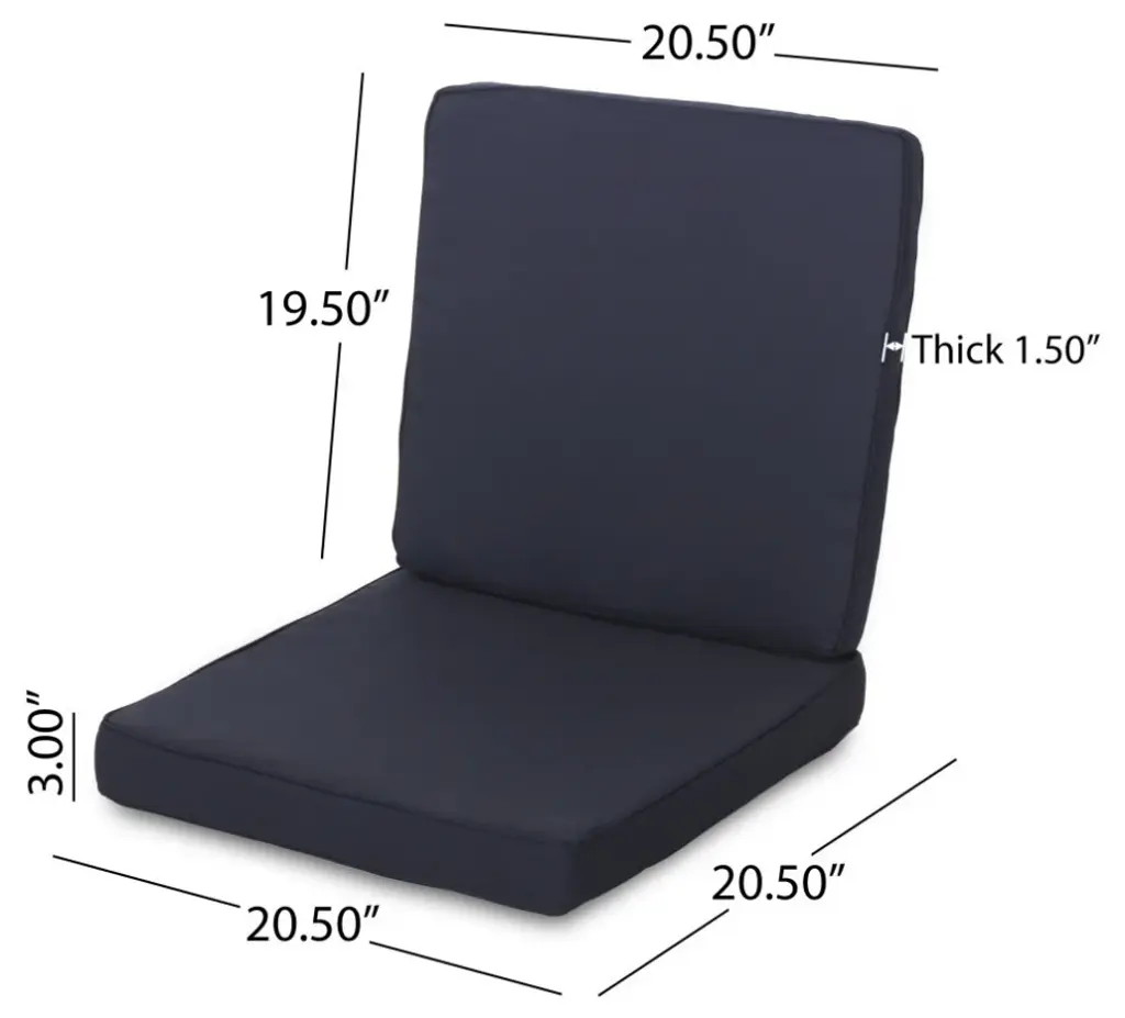 Top off your outdoor club chairs with an extra dash of comfort. From convenient replacement options to a fresh new look for your outdoor set, our club chair cushion set brings a welcoming ambiance to your backyard or patio space. Our cushion set is created with water-resistant fabric, making this a versatile accessory that is perfect for outdoor use while also keeping your decor undeniably stylish all summer long. This also includes safety zippers, allowing the cover to be easily removed for cleaning purposes.WATER-RESISTANT FABRIC: Our cushions are covered with a non-porous material that makes cleaning any spills a breeze so you can spend all summer lounging outdoors in comfort. Please note that these cushions are water-resistant and not waterproof. Please do not submerge in water. REMOVABLE COVERS WITH SAFETY ZIPPERS: You can easily remove your cushion cover for cleaning purposes after a long period of use. Just use the childproof safety zippers to unfasten the skin and slip out the inner filling. COMPATIBLE: Our cushions are compatible with most outdoor club chairs, but pair best with those from our own collection. This comes with backrest and seat cushions for four club chairs. DIMENSIONS: Choose an accessory that is the perfect size for you and your furniture. The seat cushion measures to be 20.50" L x 20.50" W x 3.00" H and the back cushion measures to be 20.50" L x 19.00" W x 1.50" H. COLOR OPTIONS: Our cushions come in a variety of color options so you can choose a fresh color for your set.Includes: Four (4) Club Chair Seat Cushions and Four (4) Club Chair Backrest CushionsMaterial: Water Resistant FabricComposition: 100% PolyesterFilling: Polyurethane FoamColor: Navy BlueHand-Crafted DetailsEasy Assembly RequiredSeat Cushion Dimensions: 20.50 inches deep x 20.50 inches wide x 3.00 inches highBackrest Cushion Dimensions: 19.50 inches deep x 20.50 inches wide x 1.50 inches high