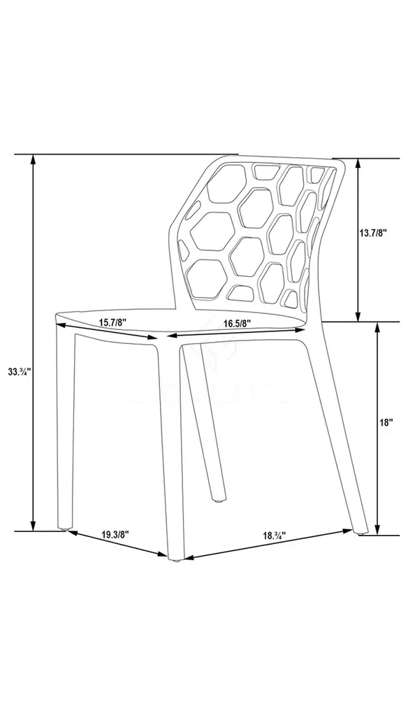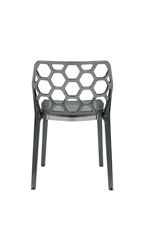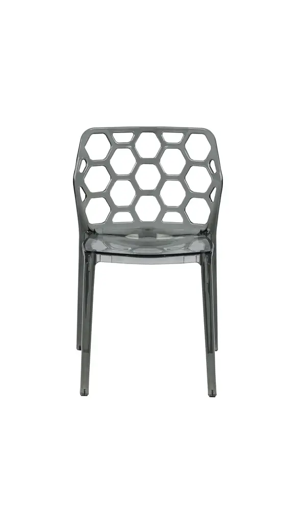 Transparent Lucite chairHoneycomb cut-out designMade from a single mold injectionBlack plastic non-marking feetConveniently stackableFully assembledBees and geometry love the shape of a hexagon - jump on the bandwagon and add the Dynamic Chair to your dining room, business or restaurant! This attractive organic shape makes a starring debut in contemporary design. These clear acrylic chairs are conveniently stackable, making them ideal for apartments, small spaces, or whenever easy storage is a priority. Because they are made from a single mold, the Dynamic Chairs are strong and durable. Each chair is complete with non-marking feet for floor protecting, with no assembly required.