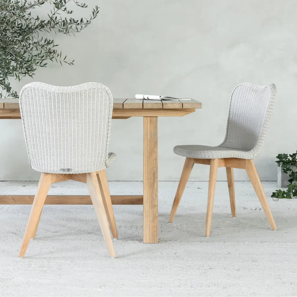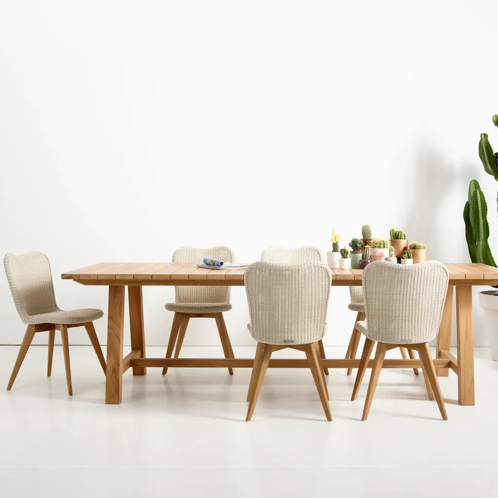 Elevating spaces with its charming curves and woven texture, the Lena Dining Chair from Vincent Sheppard will get your outdoor spaces garden party-ready. Featuring a solid teak base that exudes timeless sophistication, this dining chair is crafted for both style and comfort, its polyethylene wicker seat offering the perfect blend of durability and modern aesthetic. With a stylish blend of natural and contemporary elements, the Lena Outdoor Dining Chair seamlessly complements any setting. Highlights