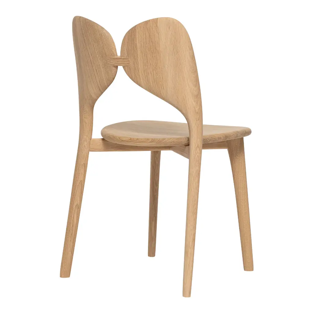 Designed by Constance Guisset Lepida is a collection of chair and armchair made of solid wood. Their organic shapes unfold from the feet to form an elegant and comfortable sculpture. The two parts of the backrest reach each other without touching. They remind of petals as well as solid wooden paddles, or even of soft shoulder blades of an exoskeleton. A delicate piece connects them in a point, like a couture detail.