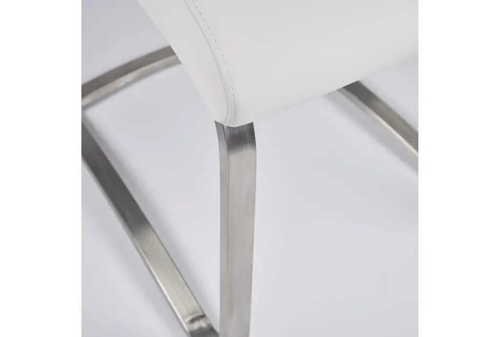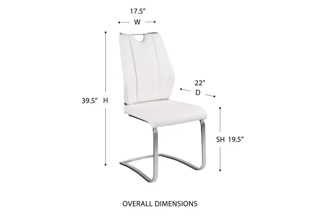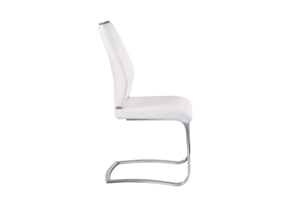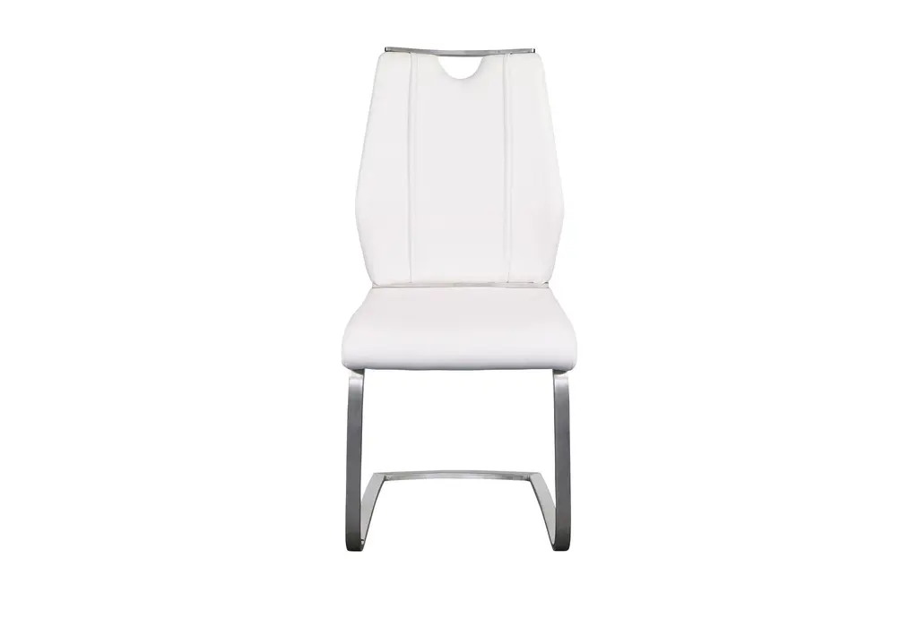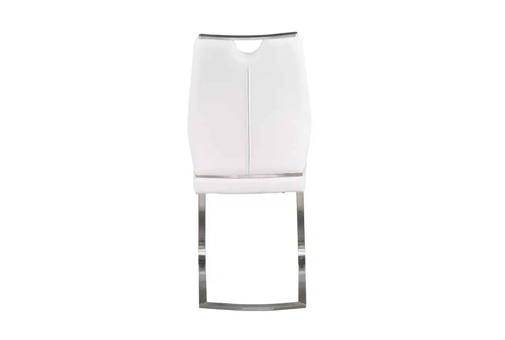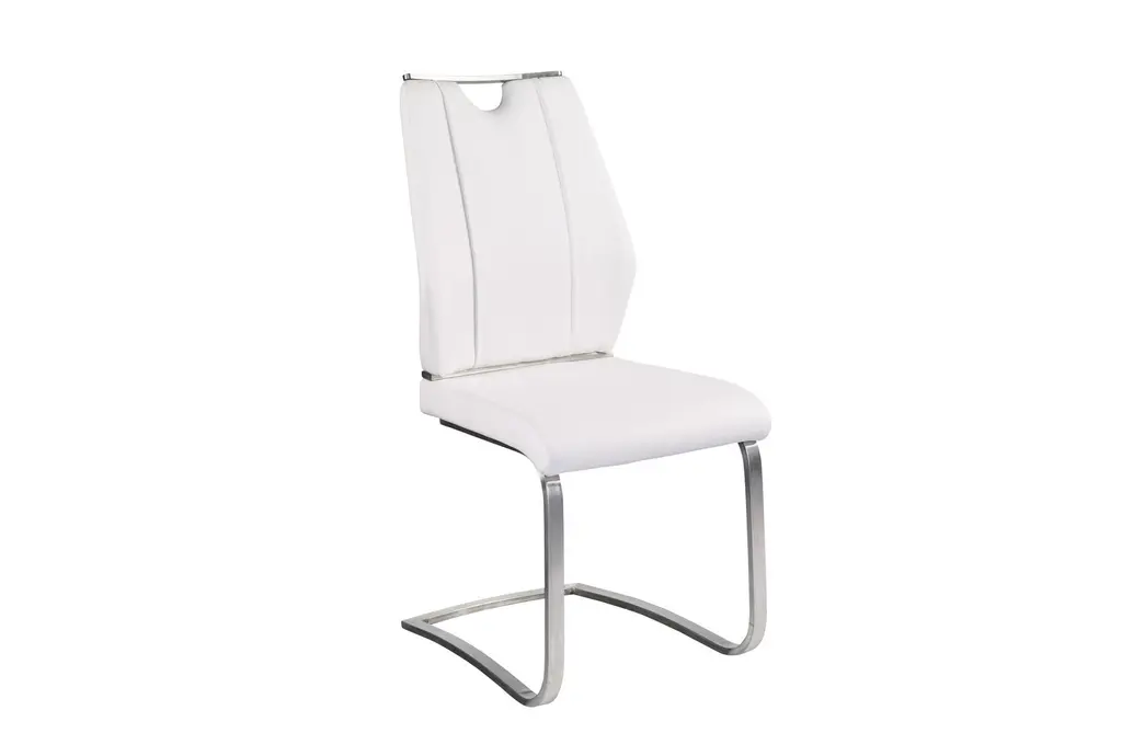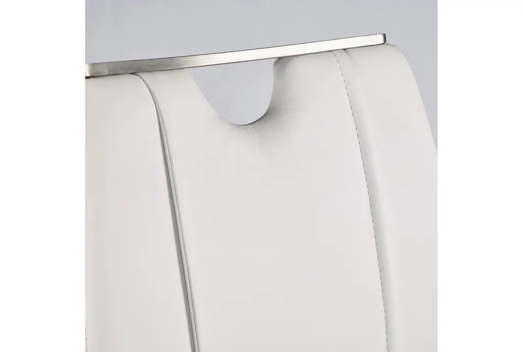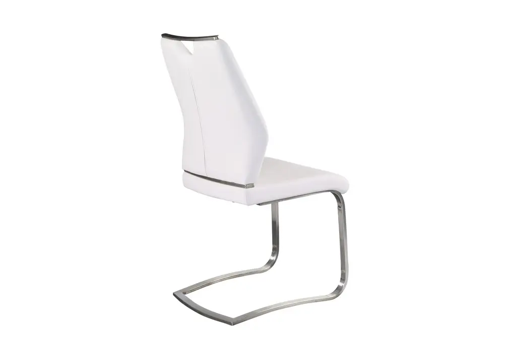 The Lexa Dining Chair in white and brushed stainless steel offers a modern and contemporary addition to your dining room or kitchen. This armless set of two chairs provides a sleek look with their white leatherette upholstery and brushed stainless steel legs, making them a stylish and functional choice for any food prep and serving space.