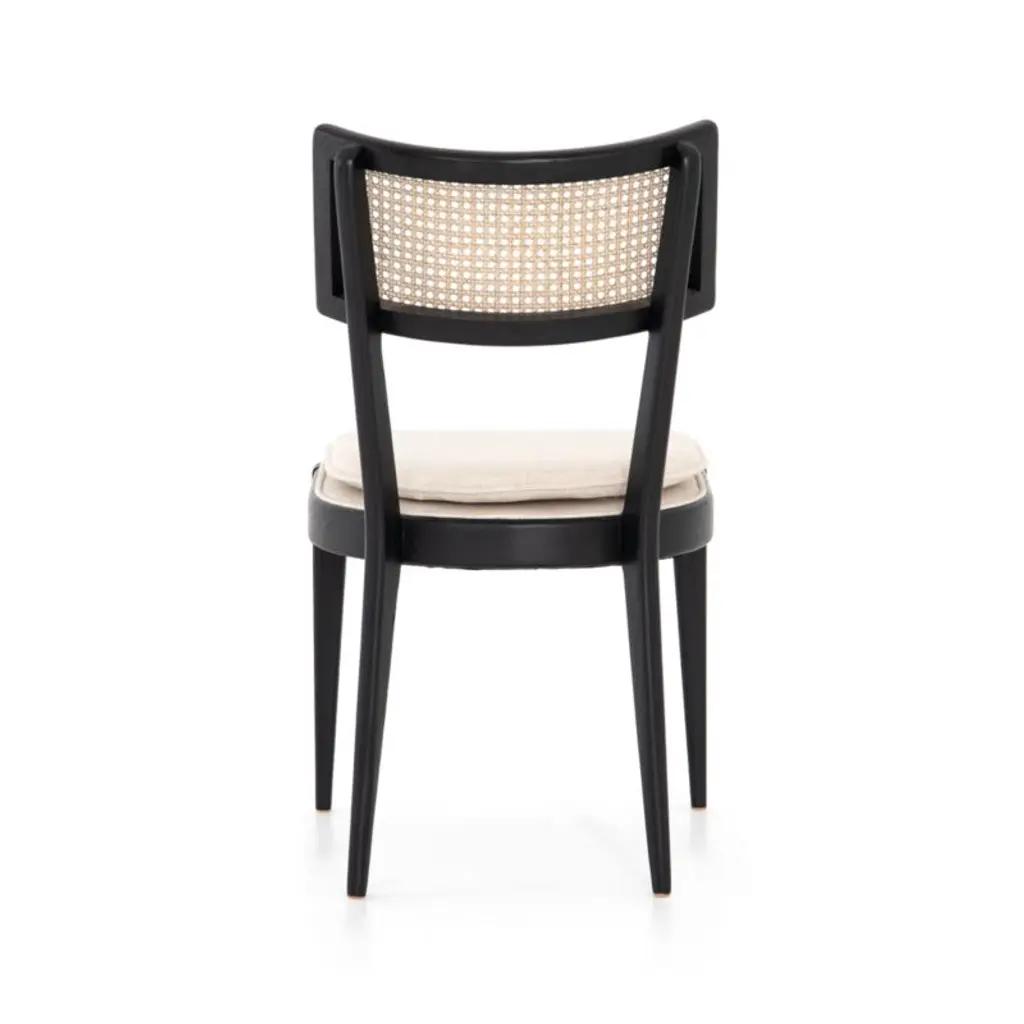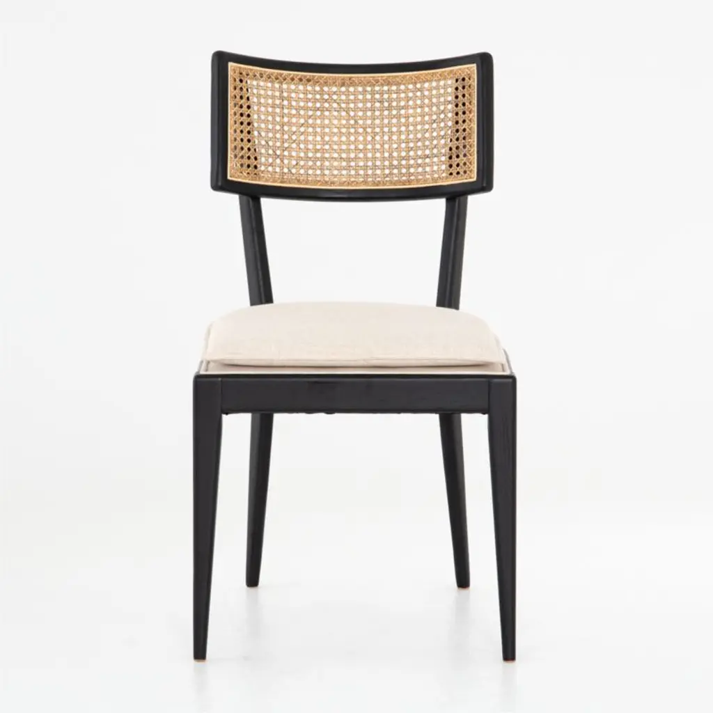 A new take on caning. Our Libby dining chair frames intricately woven natural cane in bold black, giving the centuries-old technique a modern edge. Solid nettlewood with a brushed ebony finish shapes the chair's clean lines and crisp angles, with the seat left natural for an additional layer of contrast. A slim cushion upholstered in a linen-blend weave layers on comfort while keeping the look clean and classic. The seat removes easily from the frame for effortless cleaning of the performance fabric.