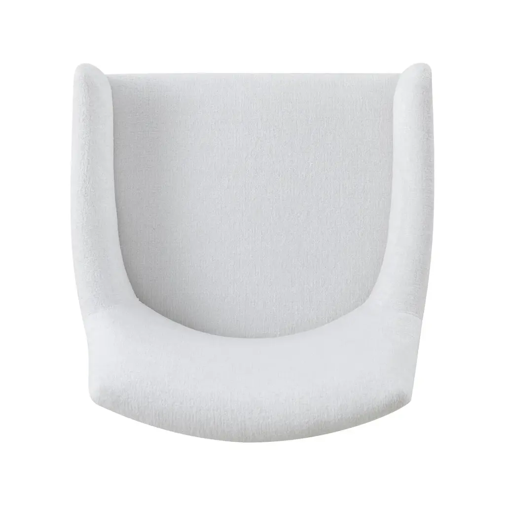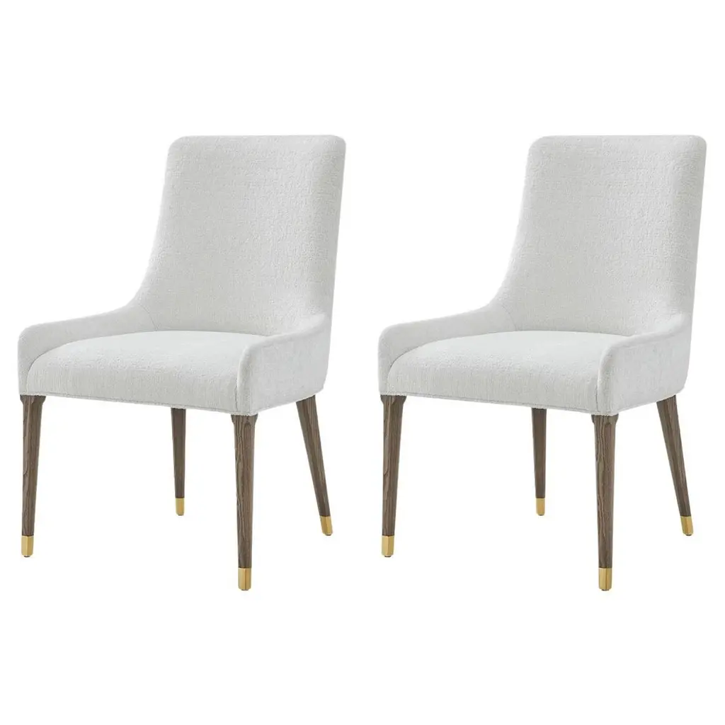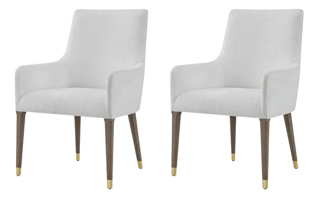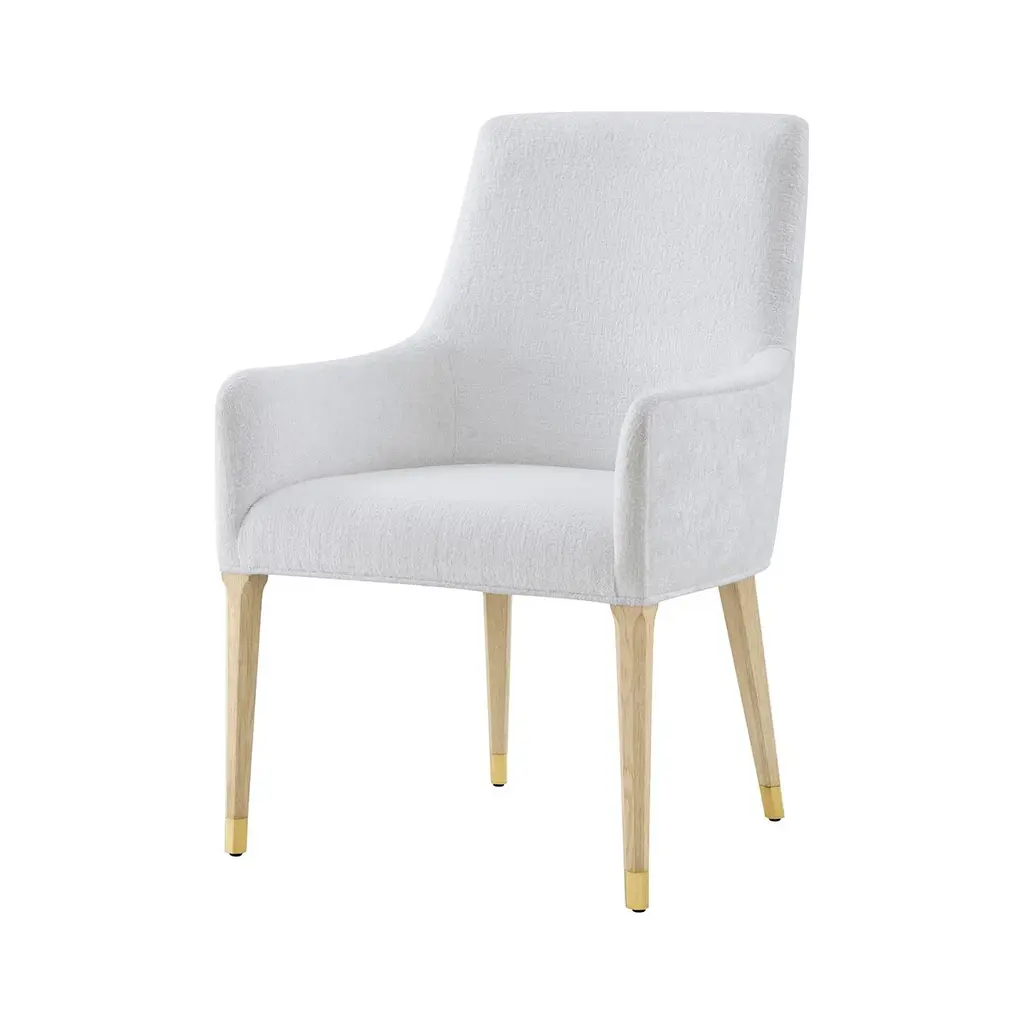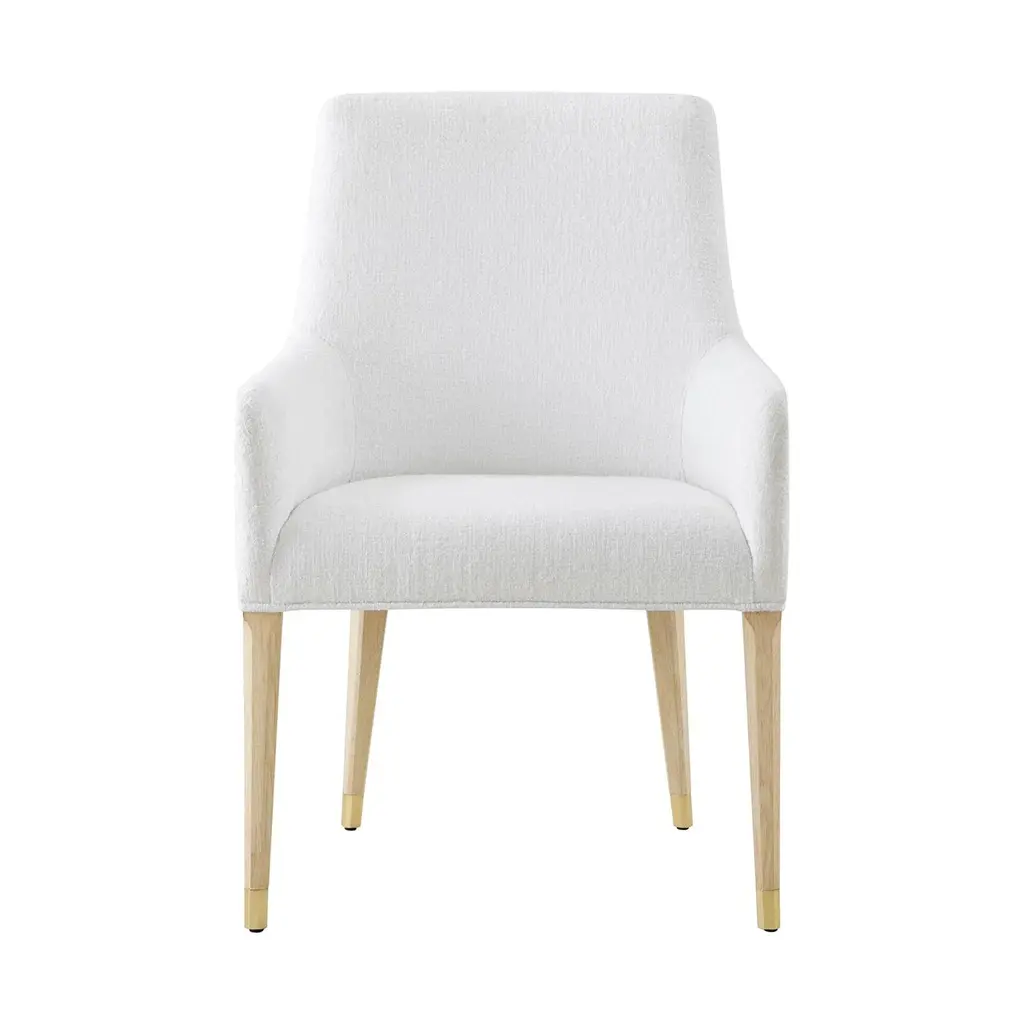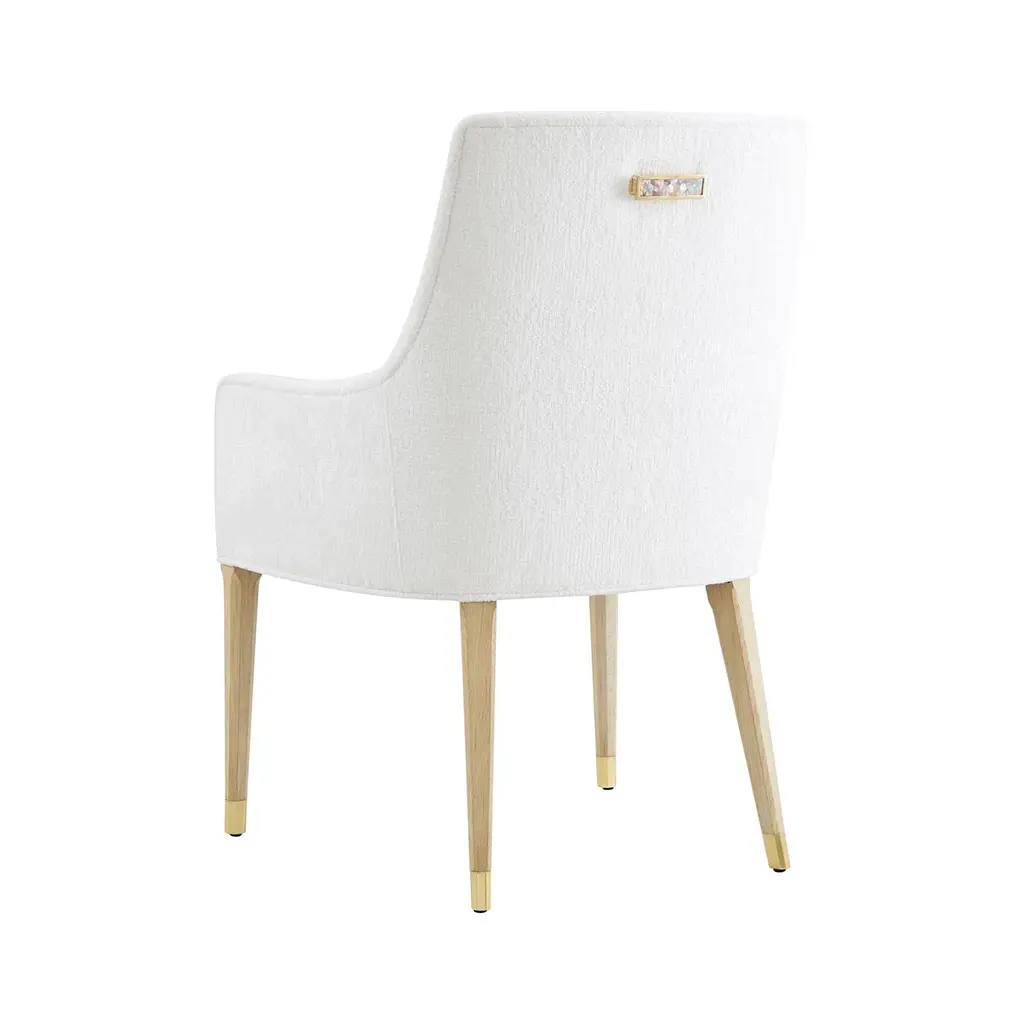Upholstered Armchair brings an elegant softness to any dining setting. The over-upholstered backrest and seat are tailored for comfort and style, creating a sculptural profile that’s both refined and inviting. Tapered wood legs offer a warm contrast to the smooth upholstered form, while polished brass ferrules and a handle accent of brass and pearlescent hardware lend a note of vintage glamour. Whether paired with a formal dining table or placed as an accent in a bedroom or vanity, this chair delivers timeless sophistication with a subtle edge. Dimensions: 24.75" W x 25.75" D x 38.25" H Seat Height: 19.5" Arm Height: 25"