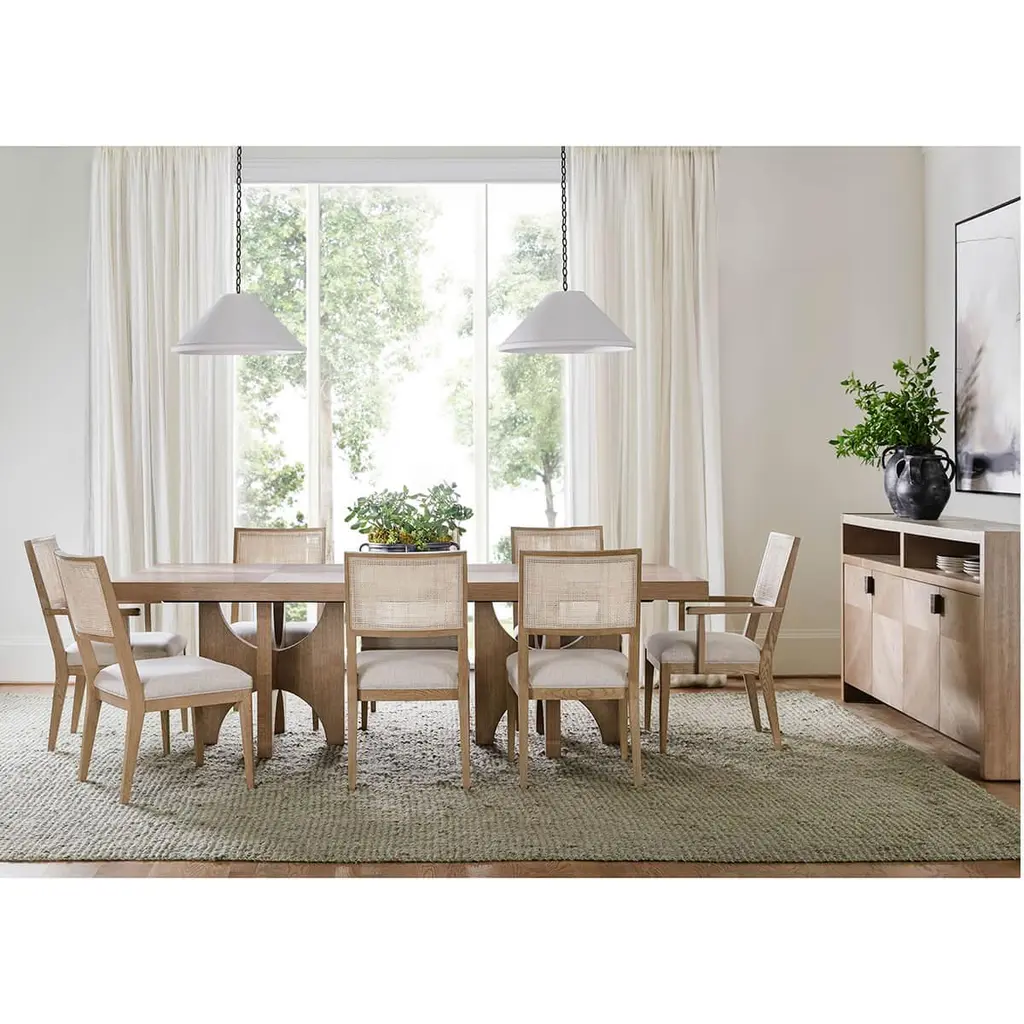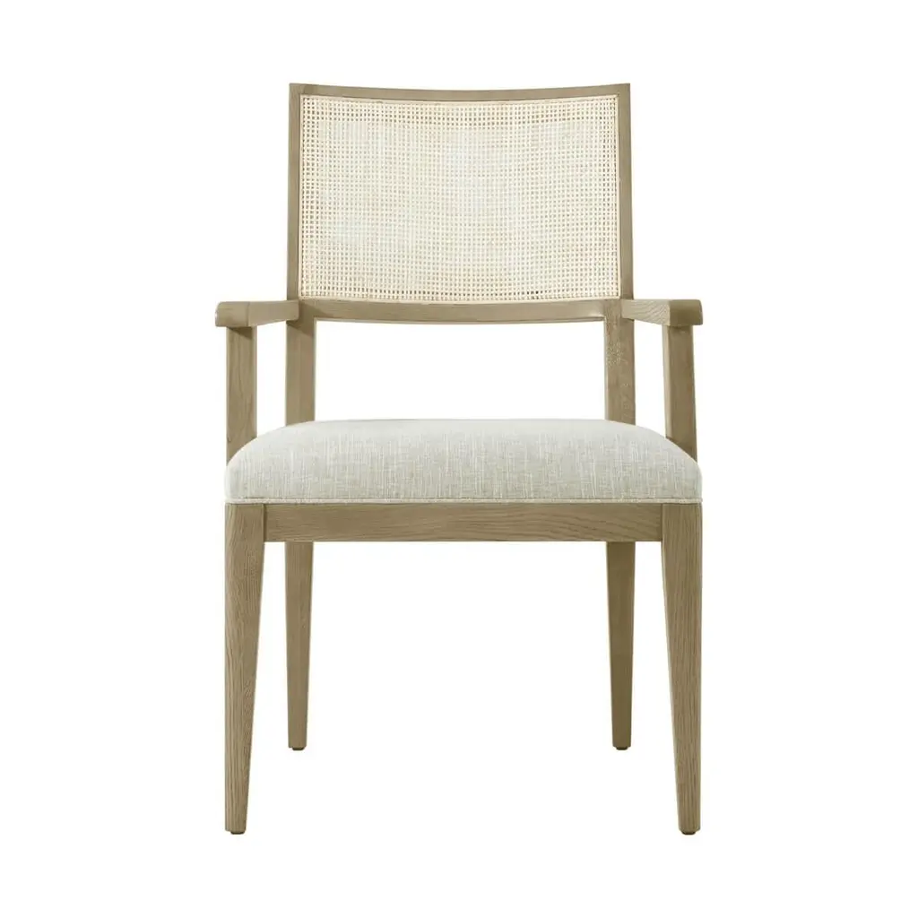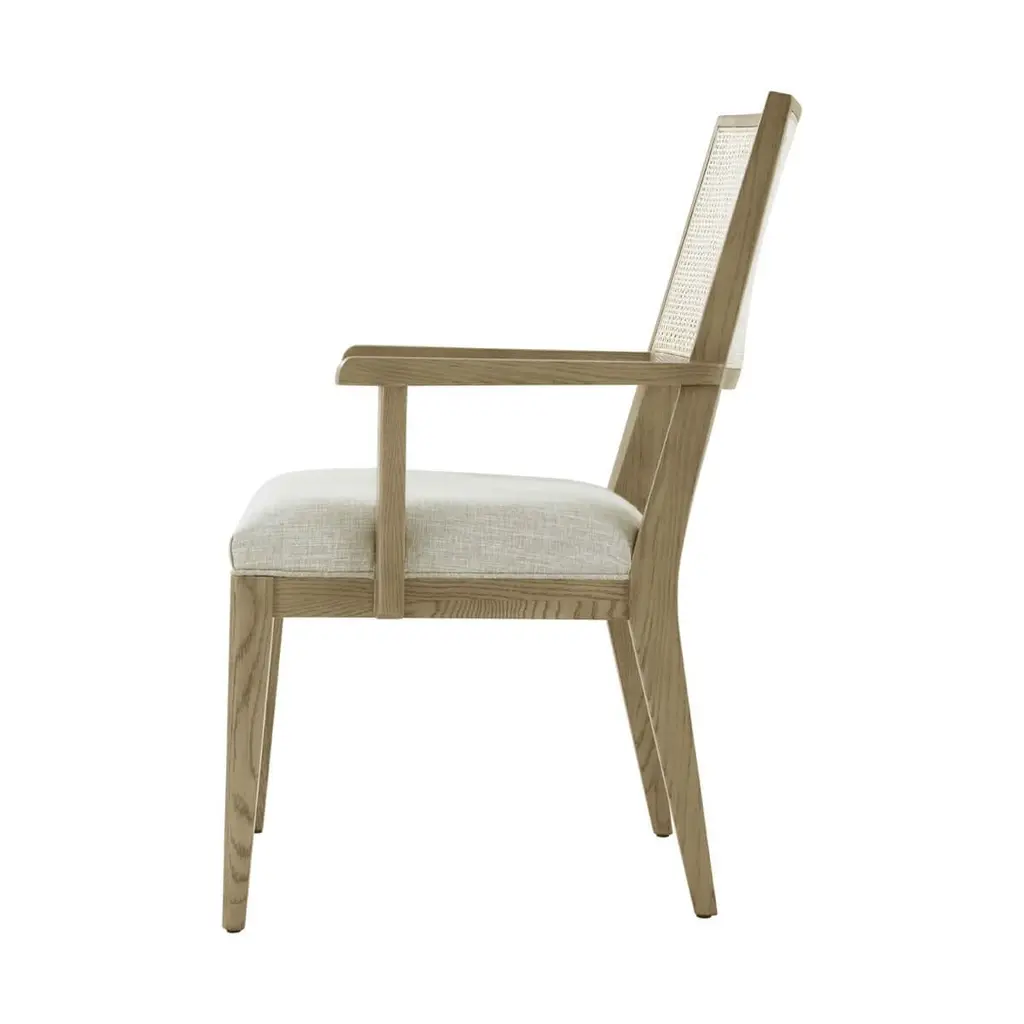 Dining Arm Chair, a solid frame in our light Dune finish, with a curved and caned backrest, a padded and upholstered seat cushions raised on tapered legs.Dimensions: 24" W x 25.5" D x 35" HSeat height: 18¾ in (47.6 cm)Arm Height: 24¾ in (63 cm)Inside Seat Depth: 21¾ in (55.1 cm)Inside Seat Width: 20½ in (52 cm)
