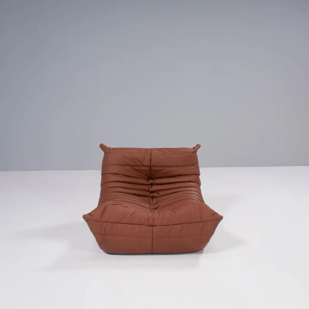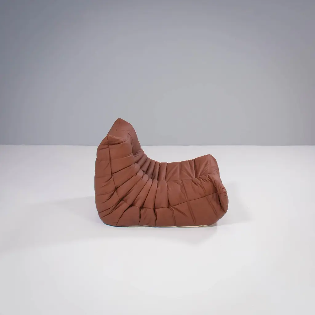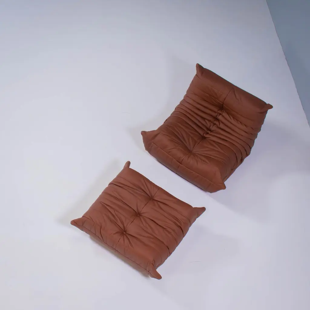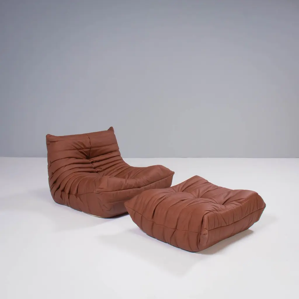 The iconic Togo sofa, originally designed by Michel Ducaroy for Ligne Roset in 1973, has become a design Classic.This two-piece modular set is incredibly versatile and comprises of a fireside chair and a footstool.The pieces feature the instantly recognisable pleated design, which create the iconic relaxed aesthetic of the togo. This set has been newly reupholstered in a soft brown leather that would make a stunning showpiece. See listing image for fabric swatch. Made completely from foam, with three different densities, this set was built for comfort.Measures:Two Seater Sofa: 131 cm (W) x 70 cm (H) x 102 cm (D) Corner Piece: 102 cm (W) x 70 cm (H) x 102 cm (D)Please note, some of our togo sofas are not available for immediate dispatch. Please enquire for further details on delivery timings.Have you heard about our free same-day returns? If you're not happy with your item at delivery, we’ll take it back on the spot!