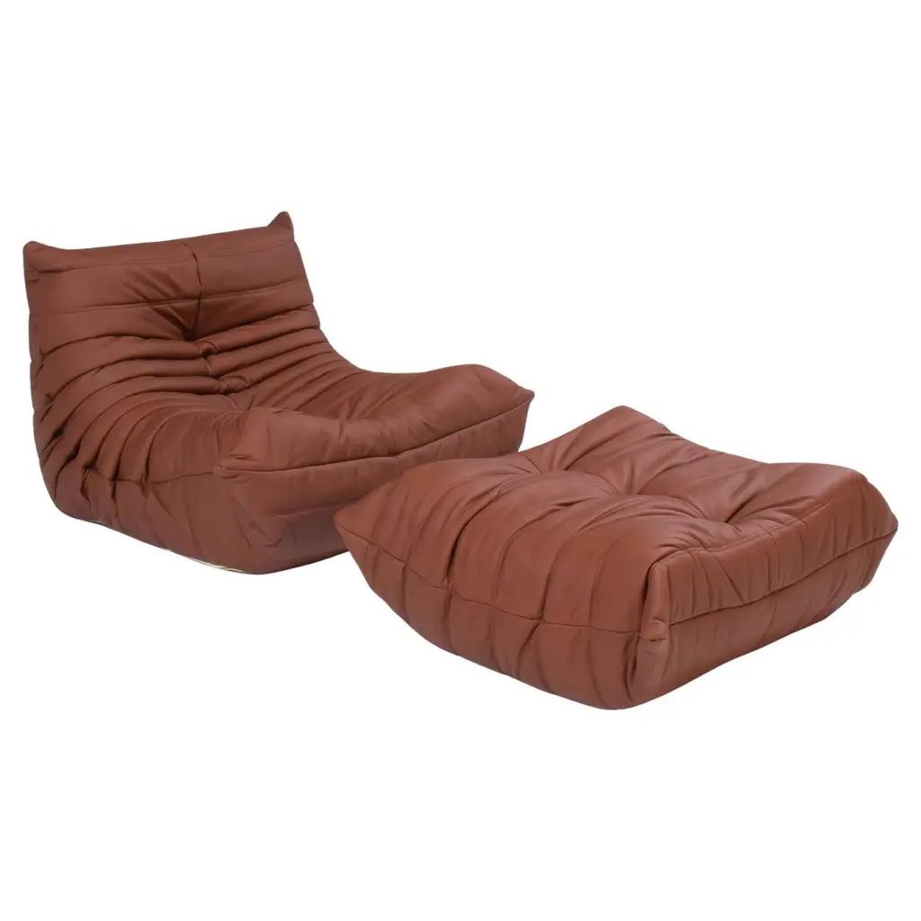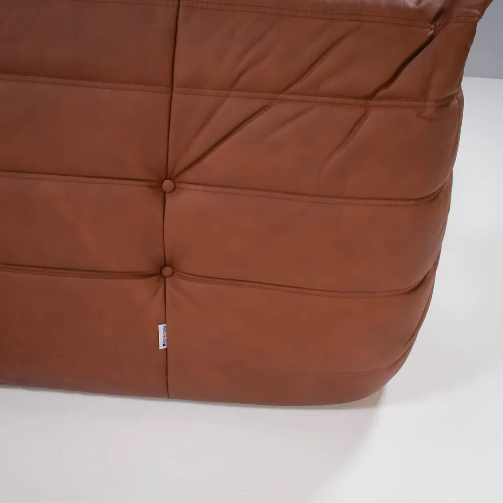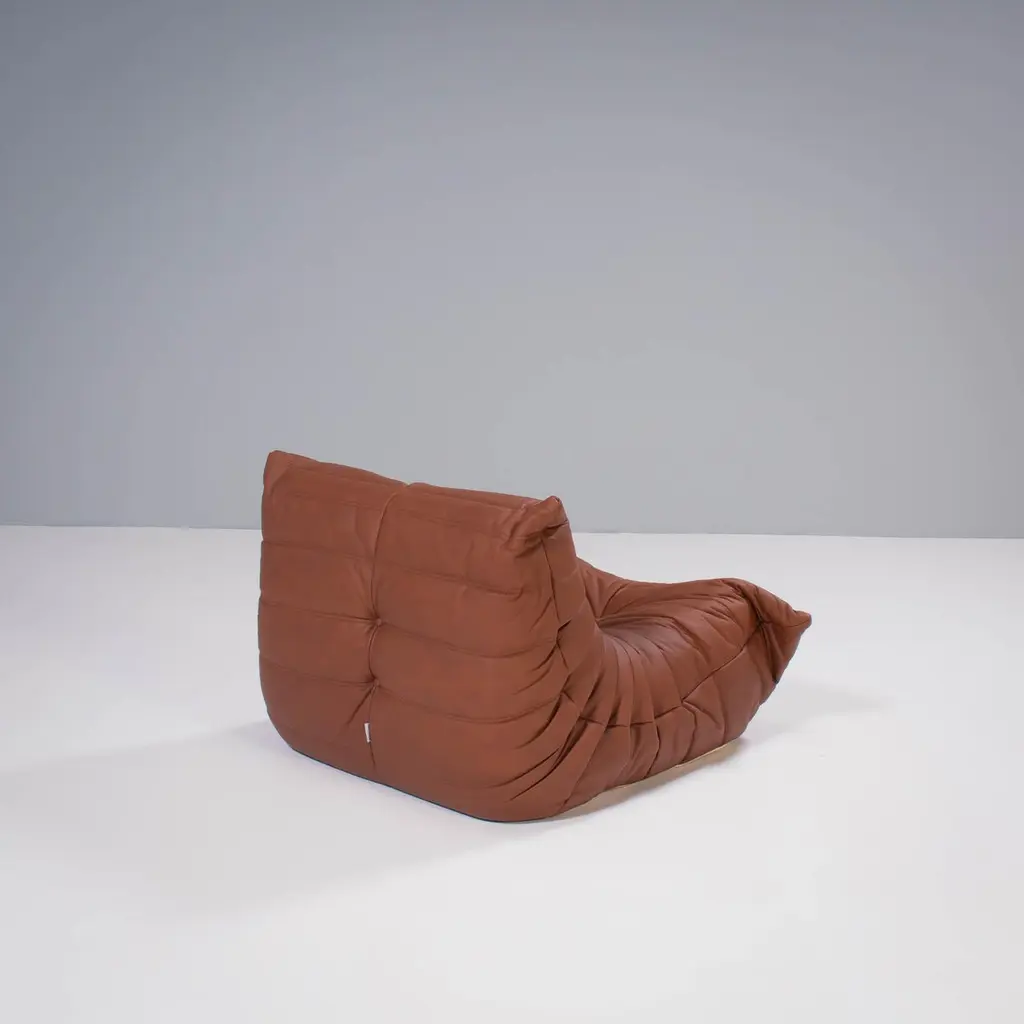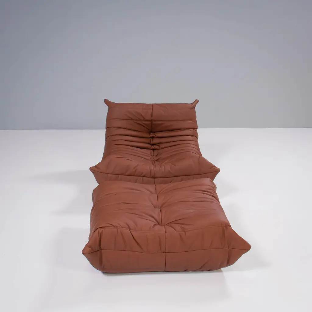 The iconic Togo sofa, originally designed by Michel Ducaroy for Ligne Roset in 1973, has become a design Classic.This two-piece modular set is incredibly versatile and comprises of a fireside chair and a footstool.The pieces feature the instantly recognisable pleated design, which create the iconic relaxed aesthetic of the togo. This set has been newly reupholstered in a soft brown leather that would make a stunning showpiece. See listing image for fabric swatch. Made completely from foam, with three different densities, this set was built for comfort.Measures:Two Seater Sofa: 131 cm (W) x 70 cm (H) x 102 cm (D) Corner Piece: 102 cm (W) x 70 cm (H) x 102 cm (D)Please note, some of our togo sofas are not available for immediate dispatch. Please enquire for further details on delivery timings.Have you heard about our free same-day returns? If you're not happy with your item at delivery, we’ll take it back on the spot!