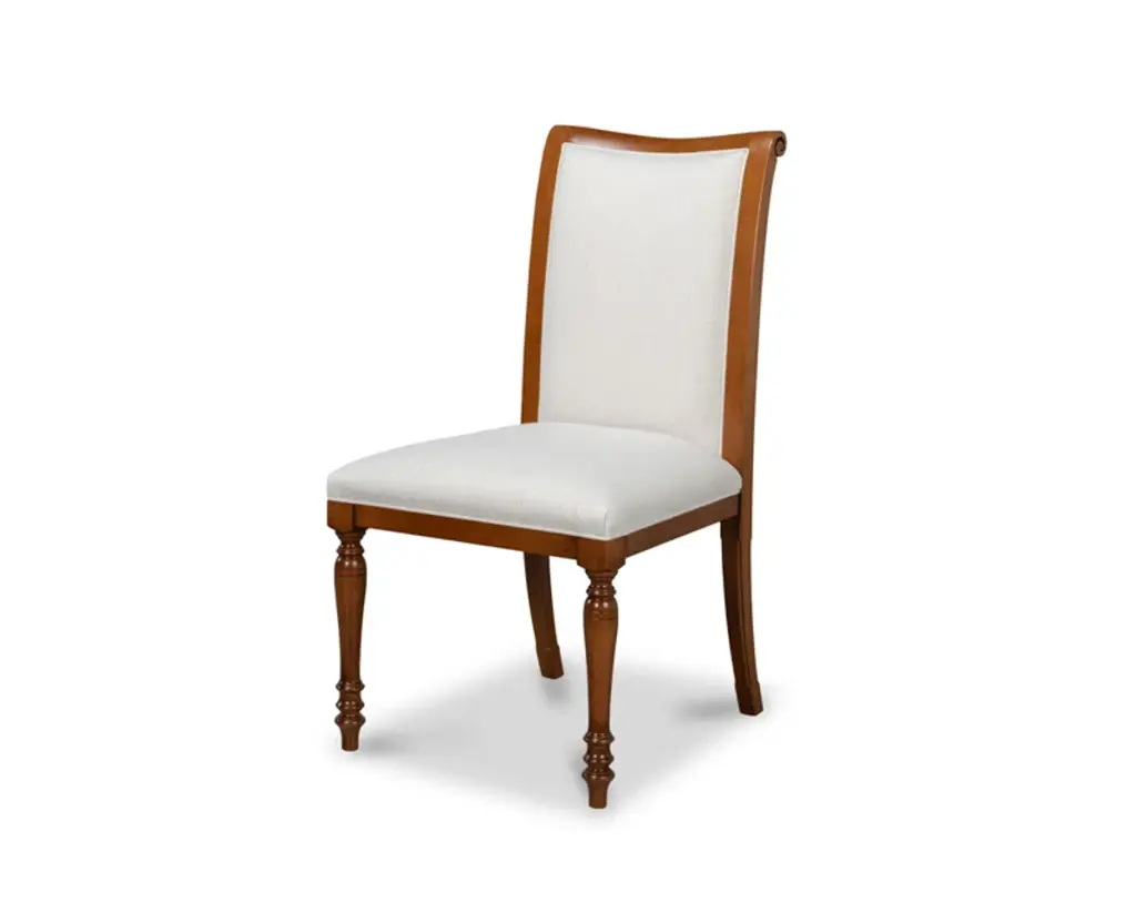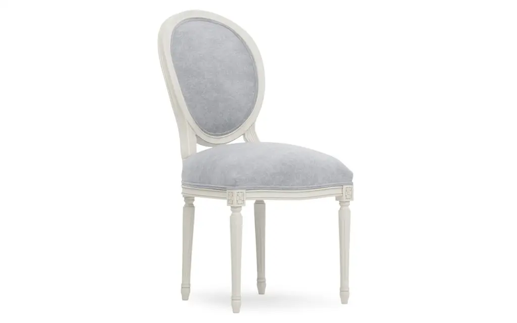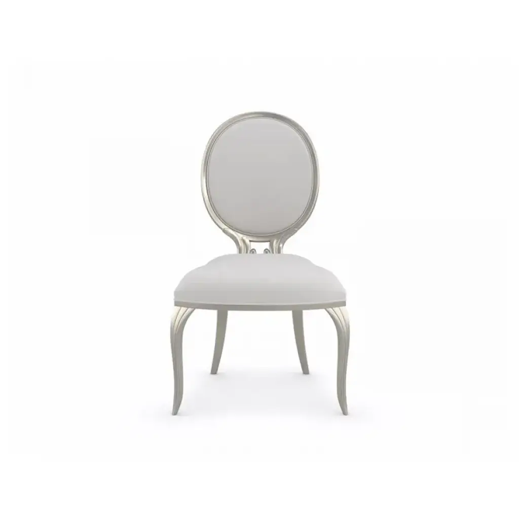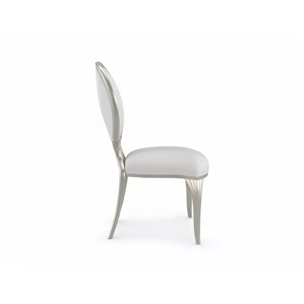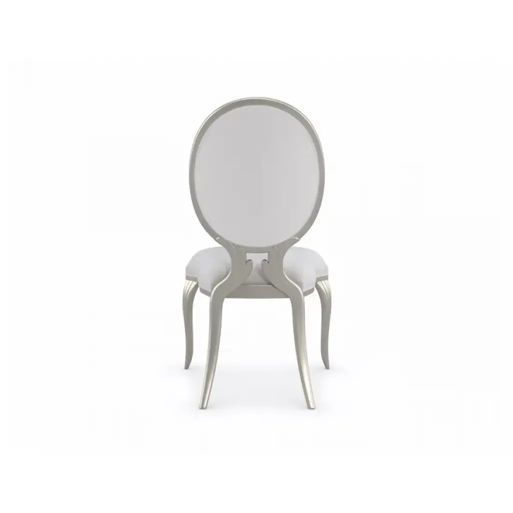 Forever-fashionable with an oval-shaped back, this side chair makes an elegant dining companion. Dressed to impress and ease entertaining, its plush seat and inside back are tailored in a shimmering performance hobnail satin. Features fluted front legs and back legs with a scroll detail for added embellishment.