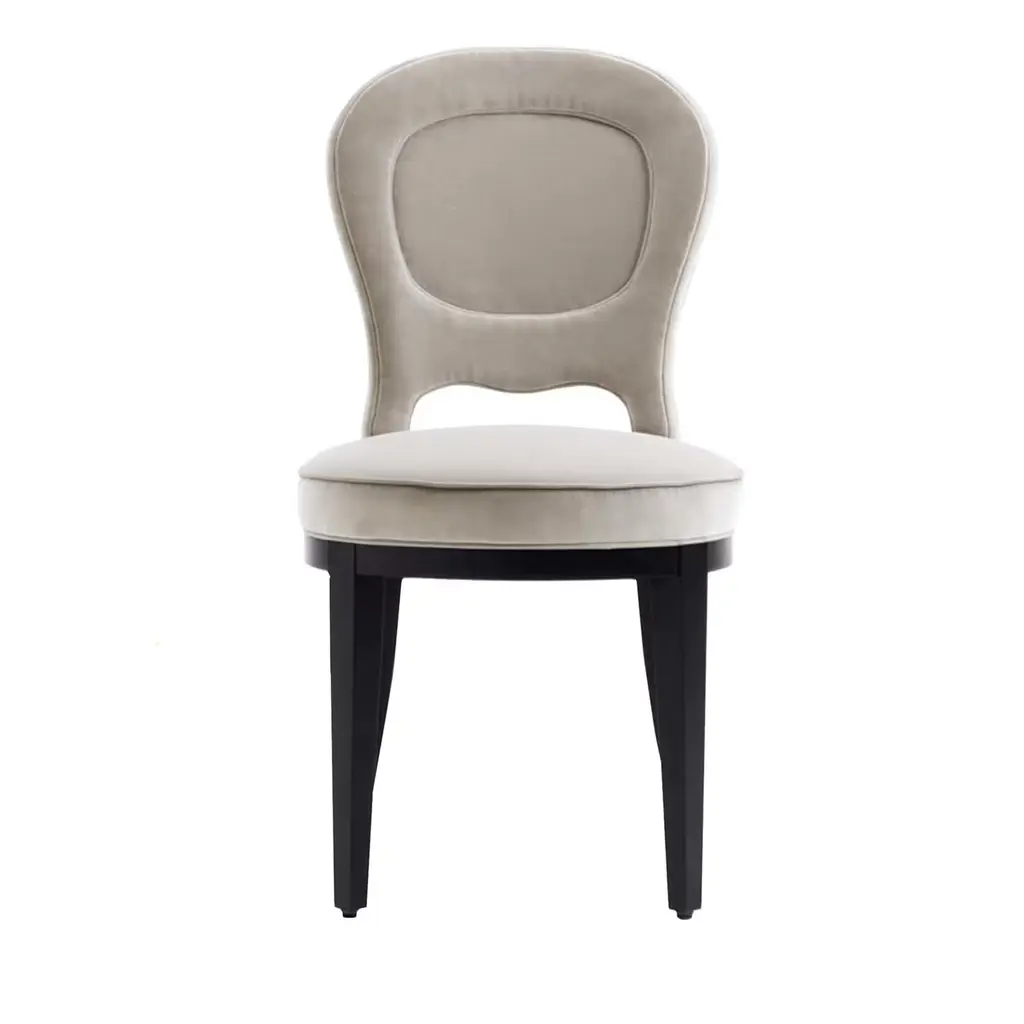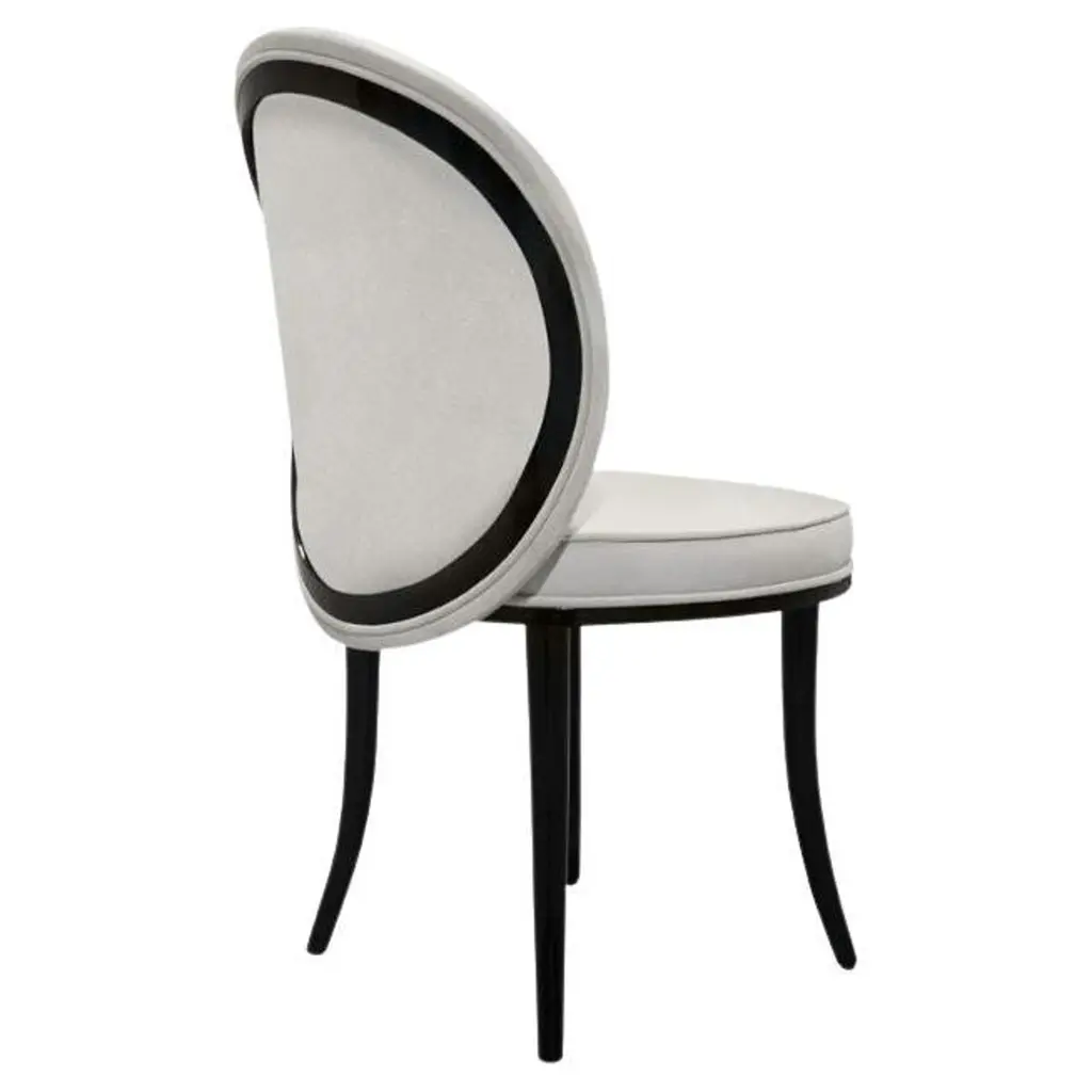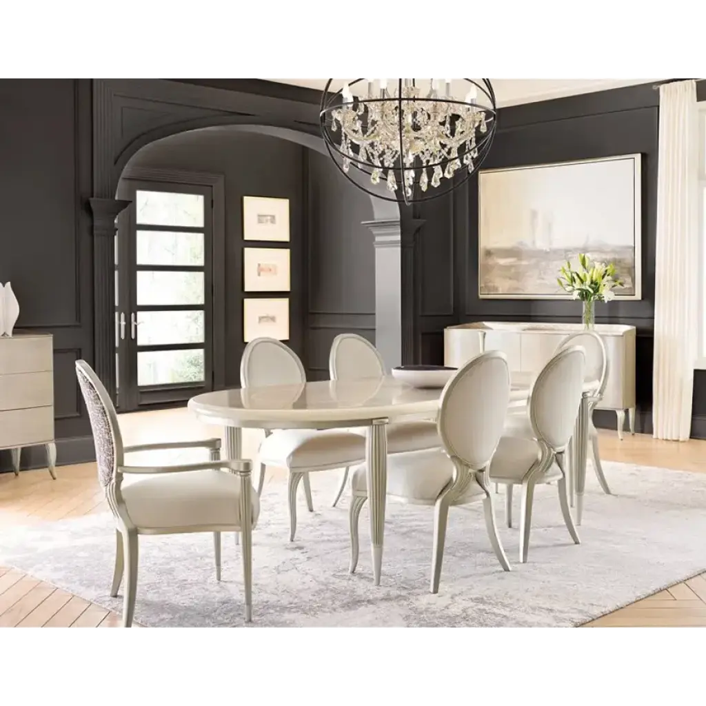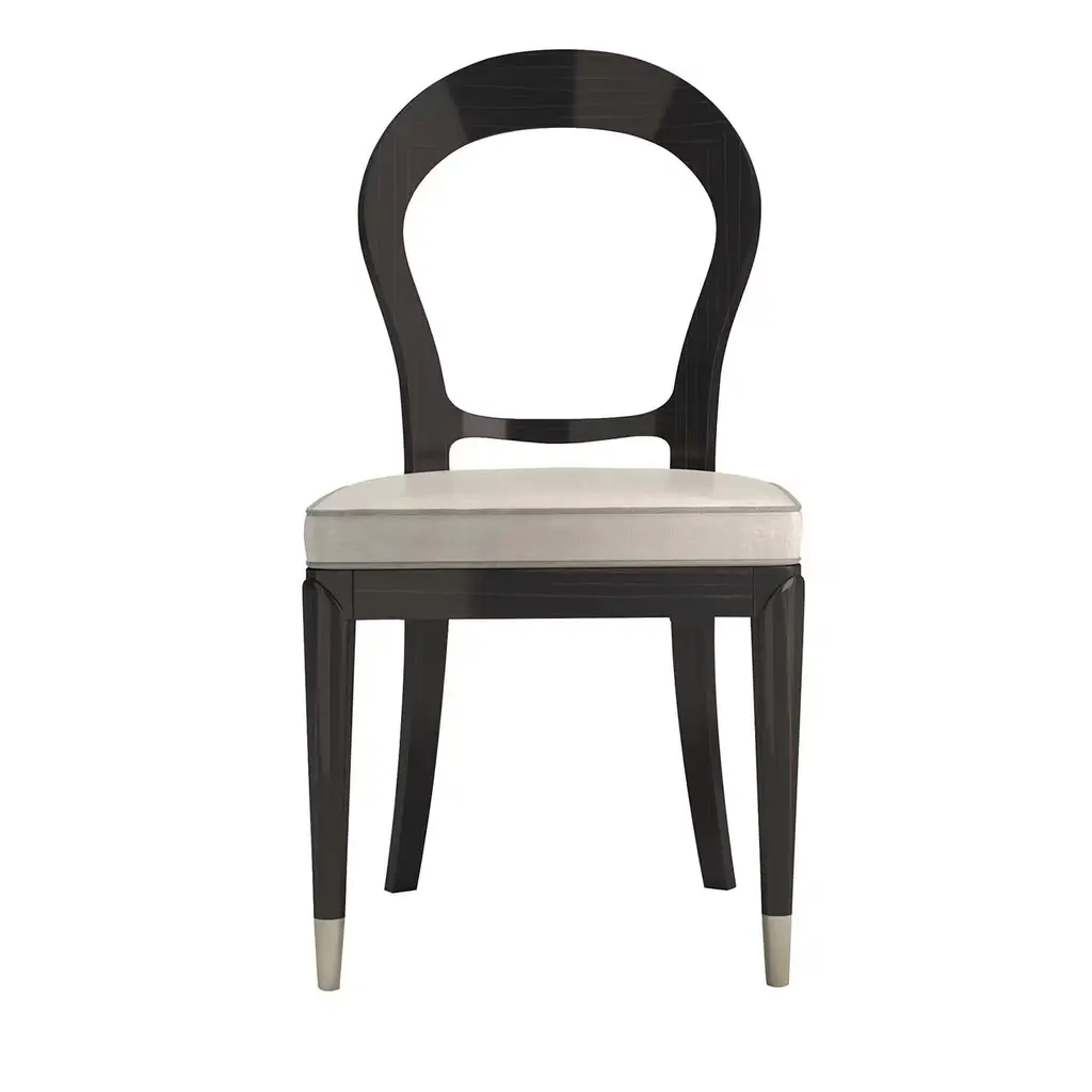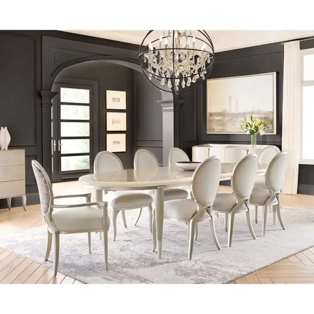 Forever-fashionable with an oval-shaped back, this side chair makes an elegant dining companion. Dressed to impress and ease entertaining, its plush seat and inside back are tailored in a shimmering performance hobnail satin. Features fluted front legs and back legs with a scroll detail for added embellishment.