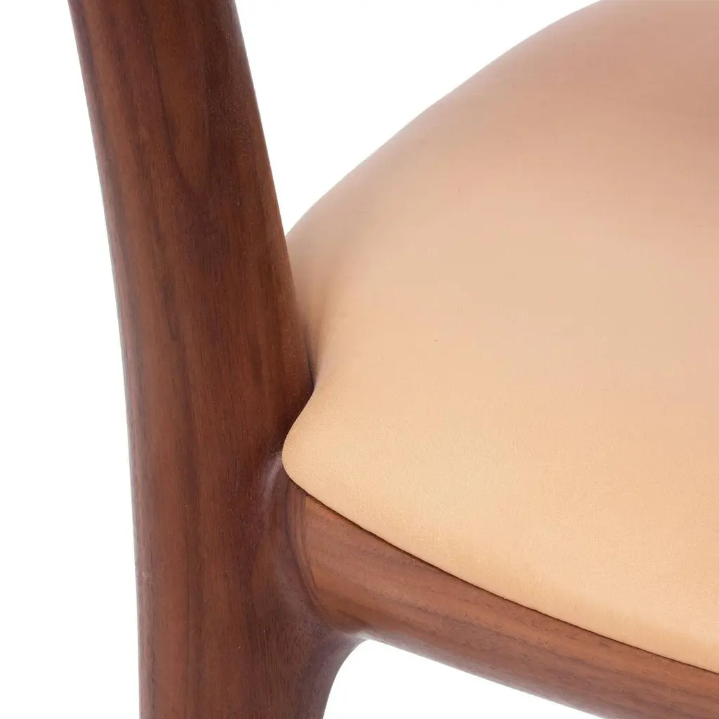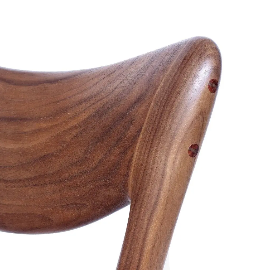 Kora dining chairs, designed and handmade personally by Ask Emil Skovgaard, Denmark. Limited edition.Measurements: Seat height 45 cm, (17.7") overall height 80 cm (31.5").Materials: American walnut, Padauk, leather/fabric seat.Finish: Oil. Currently 6 chairs available. Price is for each chairs.