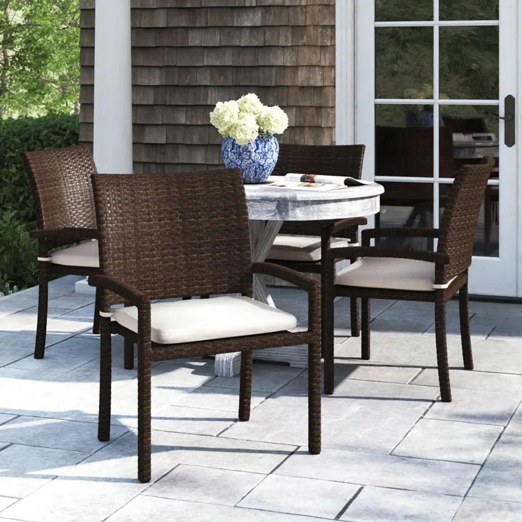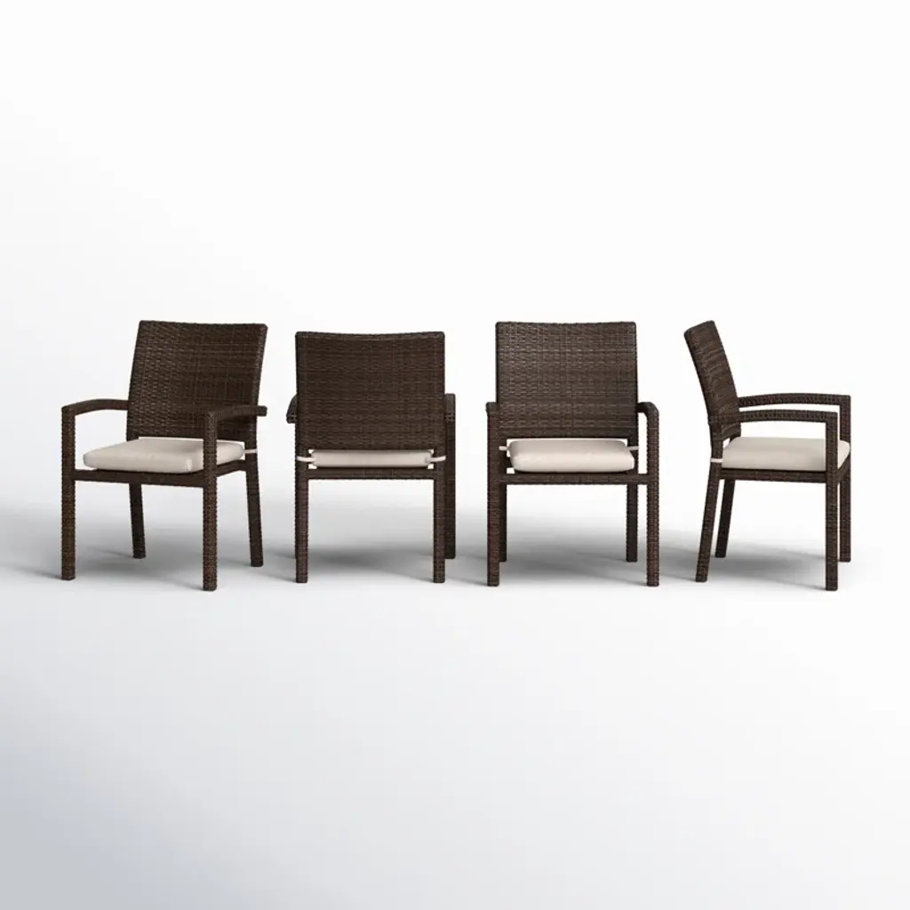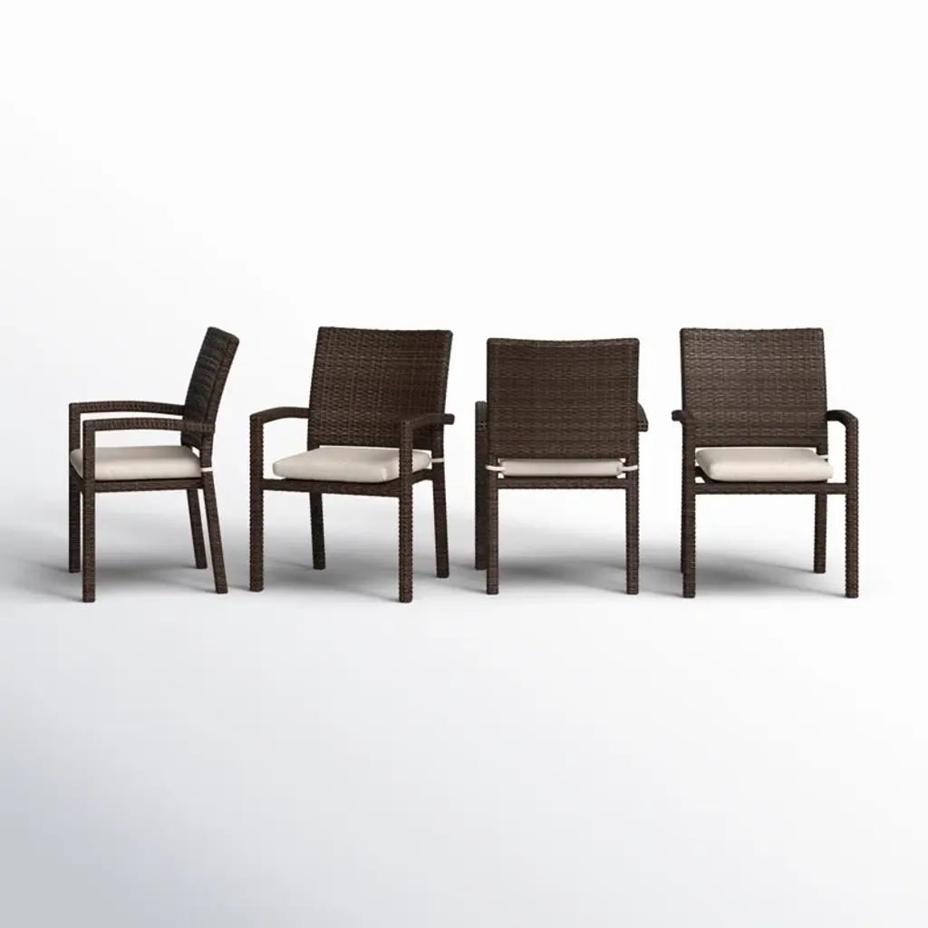 This 4-piece patio dining chair set features a mix of rust-resistant aluminum and all-weather wicker that stands up to sun, rain, sprinklers, and splashes from the pool. Each chair is fashioned with an aluminum frame wrapped in resin wicker. The textured brown wicker and flat weave give these outdoor dining chairs a coastal feel. They have arms and tieback seat cushions that your family can rest on while you enjoy a home-cooked meal. Plus, these chairs feature a stackable design for easy off-season storage. Best of all, they arrive fully assembled.