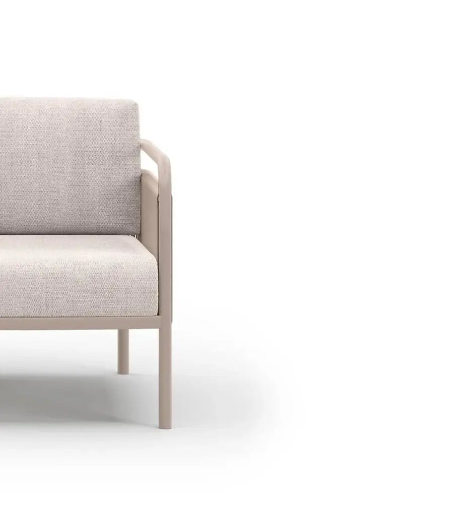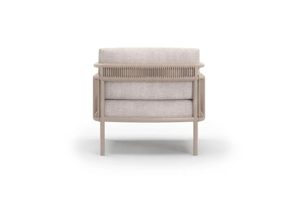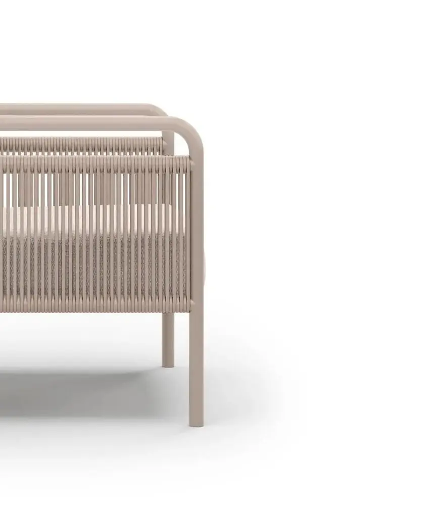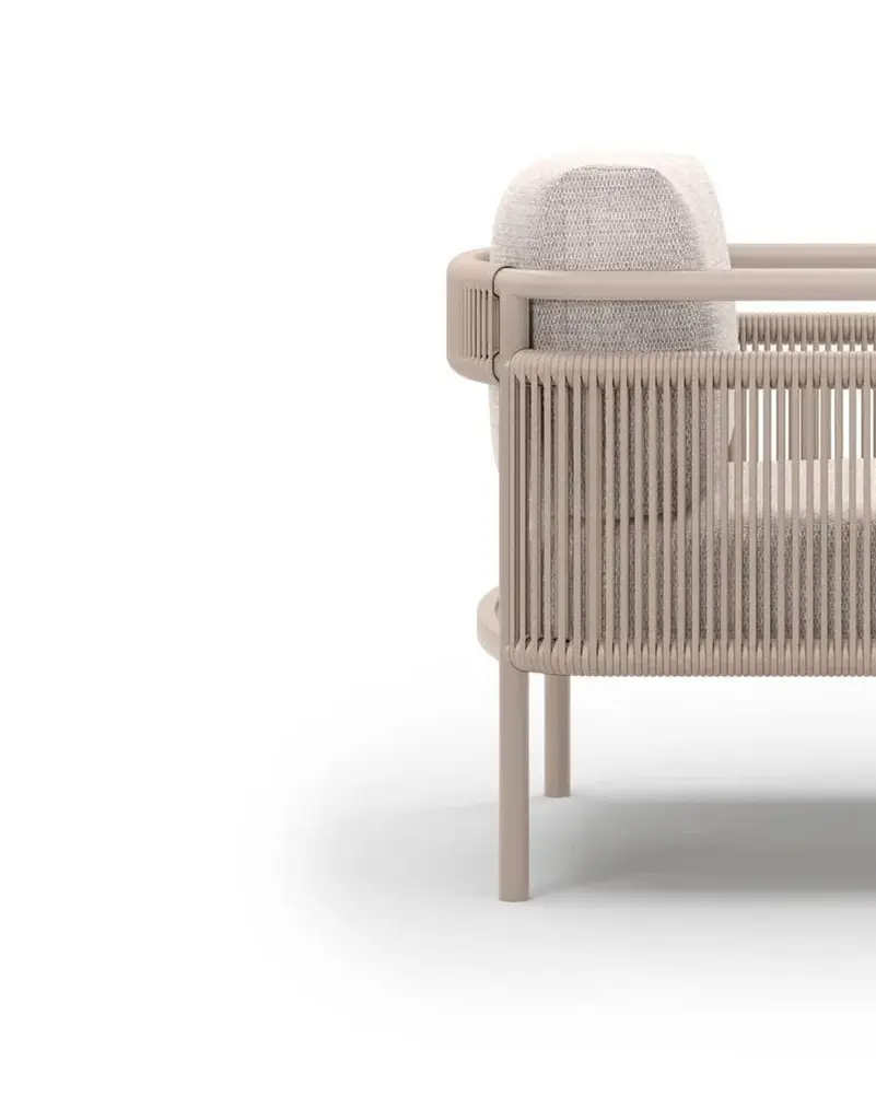 Link-Bisque Wicker And Aluminum Outdoor Armchair With Cushions by SNOCDimensions: D 85,5 x W 78 x H 63 cm.Materials: Aluminium, wicker, and Luminesce fabric. Link-BisqueWhen designing Link collection, Junpei & Iori Tamaki envisioned how multiple pieces placed together would create a link, and how that connection would evolve in various ways.To express Link, Junpei & Iori Tamaki believed that a design with both simplicity and distinctive, memorable features was necessary. For the central pieces of the collection, such as chairs and sofas, Junpei & Iori Tamaki adopted a design that emphasizes the contrast between the parts wrapped with rope and those without, set against a simple frame structure. This contrast creates a beauty in the balance of roughness and refinement.SnocSince their foundation in 2004, SNOC’s history has been interwoven with that of international design. Each chapter written with care, each product reflecting its passion. The company understands that a real story exists behind each object and behind that story, a real person desiring something more. Their ever-developing methodology focuses on defining the core of a brand and utilizing those characteristics to help nurture its soul, aiding in forging real connections. This approach , results in their unique “work in progress” style: original, versatile solutions that in their signature blend of sound, vision and design best-suit every environment and situation, arousing a range of emotions on a daily basis as well as standing the test of time.Driven by functional research, an inclusive project and product culture, and deep care for the environment, we exist as the timeless yet present essence of outdoor furniture design elevating private and public space a like with thoughtfully presented, endlessly adaptive creations.