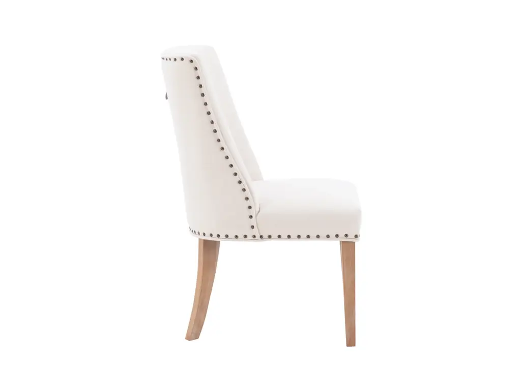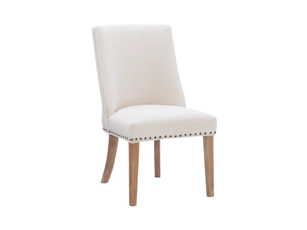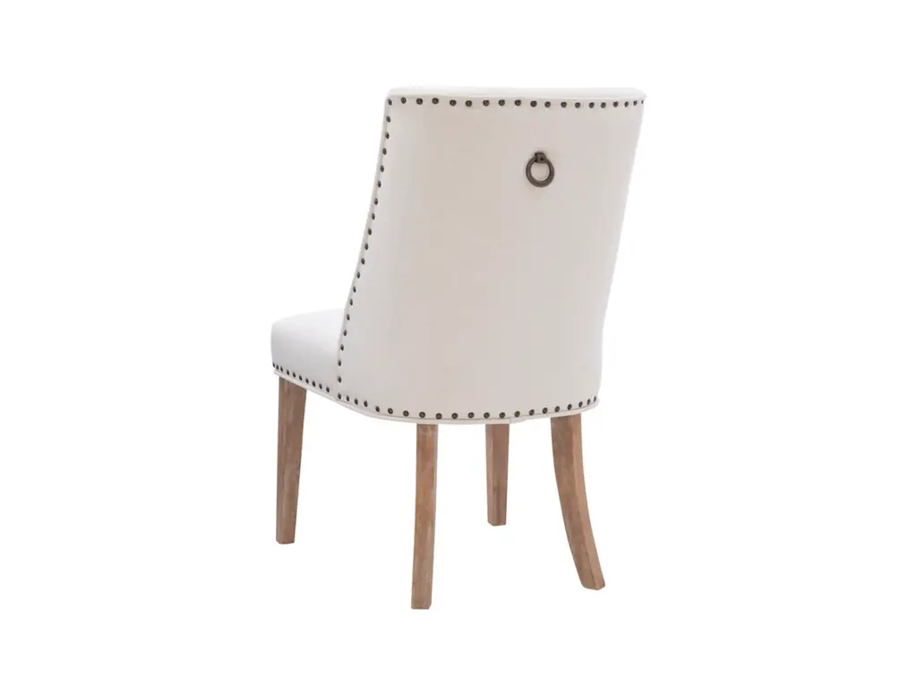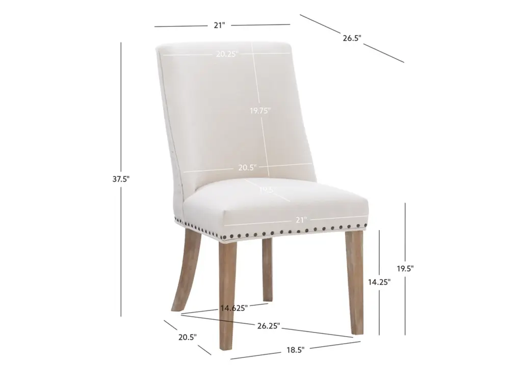 Add elegance to your meals with this sophisticated dining chair. Upholstered in a natural-colored linen-like polyester, it features lovely antiqued bronze-tone nailhead trim. The padded seat offers perfect comfort while being easy to clean. An arc shaped backrest adds to the comfort and pleasing design and the solid wood legs, finished in rustic natural, provide stability for hours on end. For a flawless finishing touch, you'll find a decorative chair back ring-pull. Sold as a set of two.
