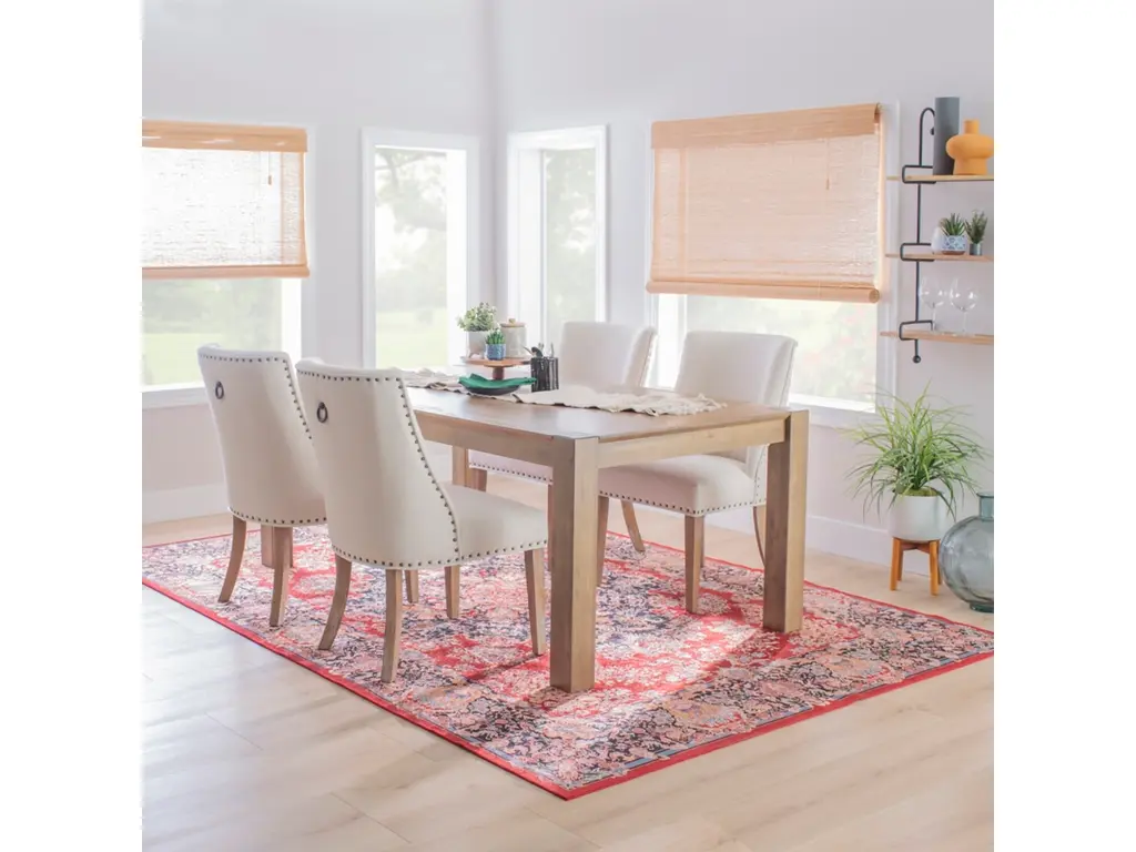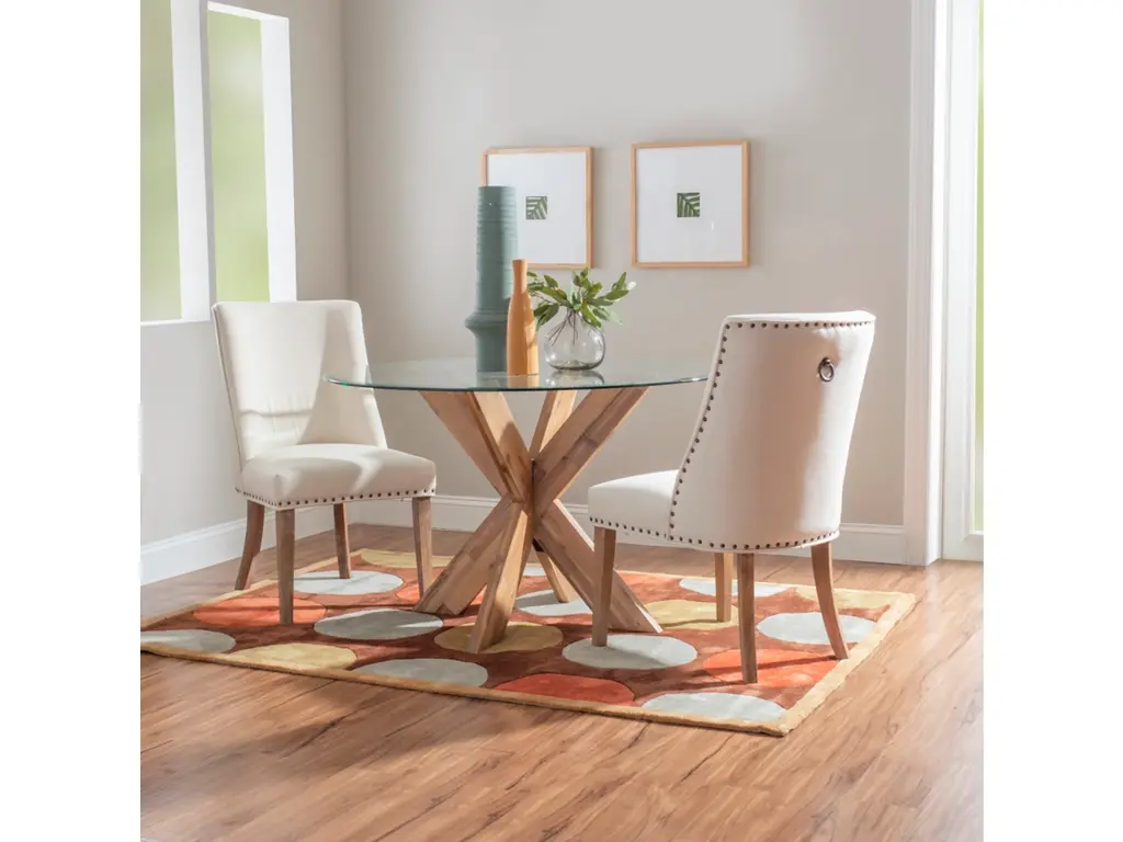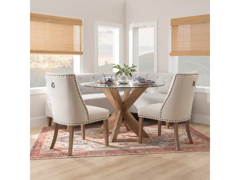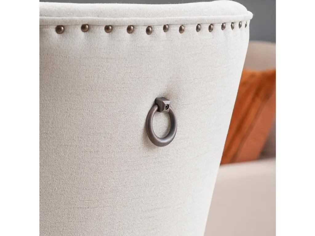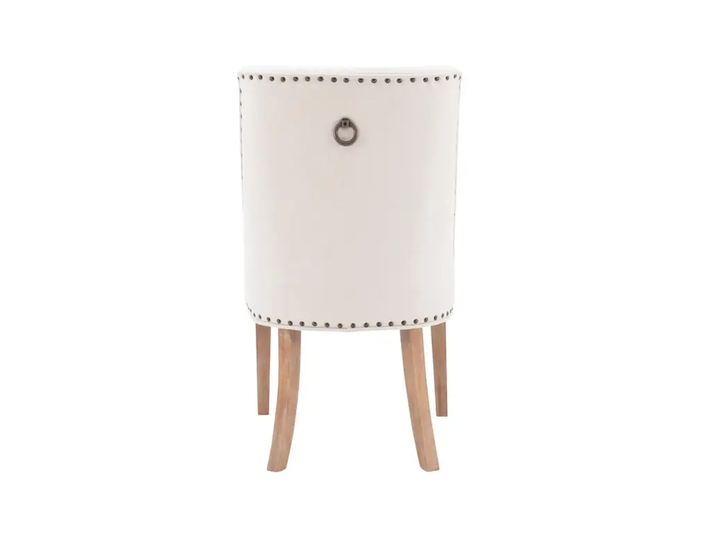 Add elegance to your meals with this sophisticated dining chair. Upholstered in a natural-colored linen-like polyester, it features lovely antiqued bronze-tone nailhead trim. The padded seat offers perfect comfort while being easy to clean. An arc shaped backrest adds to the comfort and pleasing design and the solid wood legs, finished in rustic natural, provide stability for hours on end. For a flawless finishing touch, you'll find a decorative chair back ring-pull. Sold as a set of two.